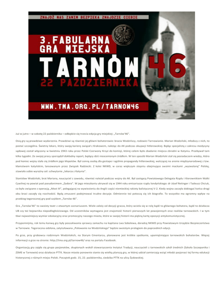 Już w jutro – w sobotę 22 października – odbędzie się trzecia edycja gry miejskiej: „Tarnów’46”. Osią gry są prawdziwe wydarzenia. Prawdziwi są również jej główni bohaterowie: bracia Wodzińscy, rodowici Tarnowianie. Marian Wodziński, młodszy z nich, to postać szczególna. Świetny lekarz, który swoją karierę związał z Krakowem, należąc do AK podczas okupacji hitlerowskiej. Będąc specjalistą z zakresu medycyny sądowej został włączony w kwietniu 1943 roku przez Polski Czerwony Krzyż do komisji, której celem było zbadanie miejsca zbrodni w Katyniu. Przebywał tam kilka tygodni. Ze swojej pracy sporządził dokładny raport, będący dziś nieocenionym źródłem. W ten sposób Marian Wodziński stał się posiadaczem wiedzy, która pod koniec wojny stała się źródłem jego kłopotów. Był cenną osobą dla gestapo i ogólnie propagandy hitlerowskiej, walczącej na arenie międzynarodowej z tzw. kłamstwem katyńskim, lansowanym przez Związek Radziecki. Z kolei NKWD, w coraz większym stopniu obejmujące swoimi mackami „wyzwalaną” Polskę, stawiało sobie wyraźny cel: schwytanie „lekarza z Katynia”. Stanisław Wodziński, brat Mariana, nauczyciel z zawodu, również należał podczas wojny do AK. Był zastępcą Powiatowego Delegata Rządu i Kierownikiem Walki Cywilnej na powiat pod pseudonimem „Zadora”. W jego mieszkaniu ukrywali się w 1944 roku emisariusze rządu londyńskiego: dr Józef Retinger i Tadeusz Chciuk, co było związane z operacją „Most III”, polegającej na wywiezieniu do Anglii części niemieckiej rakiety balistycznej V-2. Kiedy wojna zaczęła dobiegać końca drogi obu braci zaczęły się rozchodzić. Będą zmuszeni podejmować trudne decyzje. Odmiennie też potoczą się ich biografie. To wszystko ma ogromny wpływ na przebieg tegorocznej gry pod szyldem „Tarnów 46”. Gra „Tarnów’46” to swoisty teatr z otwartym scenariuszem. Wiele zależy od decyzji gracza, który wciela się w rolę bądź to głównego bohatera, bądź to działacza UB czy też bojownika niepodległościowego. Od uczestników wymagana jest znajomość historii pierwszych lat powojennych oraz realiów tarnowskich. I w tym tkwi najważniejszy wymiar edukacyjny oraz promocyjny naszego miasta, które w swojej historii ma piękną kartę opozycji antykomunistycznej. Przypomnijmy, rok temu kanwą gry były poszukiwania sprawcy zamachu na kapitana Lwa Sobolewa, doradcę NKWD przy Powiatowym Urzędzie Bezpieczeństwa w Tarnowie. Tegoroczna odsłona, zatytułowana „Polowanie na Wodzińskiego” będzie swoistym prologiem do poprzednich edycji. Po grze, przy grobowcu rodzinnym Wodzińskich, na Starym Cmentarzu, planowane jest krótkie spotkanie, upamiętniające tarnowskich bohaterów. Więcej informacji o grze na stronie: http://tma.org.pl/tarnow46/ oraz na portalu Facebook. Organizacją gry zajęła się grupa pasjonatów, skupionych wokół stowarzyszenia Instytut Tradycji, nauczycieli z tarnowskich szkół średnich (Szkoła Szczepanika i ZSME w Tarnowie) oraz działacze PTTK. Nasze miasto ponownie stanie się wielką planszą gry, w której udział zamierzają wziąć młodzi pasjonaci tej formy edukacji historycznej z różnych miejsc Polski. Początek godz. 15, 22. października, siedziba PTTK na ulicy Żydowskiej. Wprowadzenie do gry Osią gry są prawdziwe wydarzenia. Prawdziwi są również jej główni bohaterowie: bracia Wodzińscy, rodowici Tarnowianie. Marian Wodziński, młodszy z nich, to postać szczególna. Świetny lekarz, który swoją karierę związał z Krakowem, należąc do AK podczas okupacji hitlerowskiej. Będąc specjalistą z zakresu medycyny sądowej został włączony w kwietniu 1943 roku przez Polski Czerwony Krzyż do komisji, której celem było zbadanie miejsca zbrodni w Katyniu. Przebywał tam kilka tygodni. Ze swojej pracy sporządził dokładny raport, będący dziś nieocenionym źródłem. Pobyt w Katyniu zmienił jego życie. Bezpośredni kontakt z ofiarami mordu oraz skala zbrodni odcisnęły niezatarte piętno na psychice 32-letniego lekarza. Przede wszystkim jednak Wodziński był posiadaczem wiedzy, która pod koniec wojny stała się źródłem jego kłopotów. Był cenną osobą dla gestapo i ogólnie propagandy hitlerowskiej, walczącej na arenie międzynarodowej z tzw. kłamstwem katyńskim, lansowanym przez Związek Radziecki. Z kolei NKWD, w coraz większym stopniu obejmujące swoimi mackami „wyzwalaną” Polskę, stawiało sobie wyraźny cel: schwytanie „lekarza z Katynia”. Z prostego powodu: sporządził oparty na rzetelnych badaniach, ale sprzeczny z lansowaną wersją raport, poza tym znał całą prawdę o stalinowskiej zbrodni z 1940 roku. Niewykluczone, że w ocaleniu życia próbował mu pomagać wywiad angielski. Na pewno mógł liczyć na wsparcie podziemia niepodległościowego, działaczy i żołnierzy AK, w większości tworzącymi od 1945 roku struktury WiN w całym kraju. Oto skomplikowane i wielowymiarowe tło tegorocznej gry historycznej. Jak potoczą się dalsze losy Mariana Wodzińskiego w 1945 roku? Zależy to od wielu czynników, od mniej lub bardziej trafnych wyborów, od zaangażowania samych uczestników. Marian Wodziński mógł liczyć na pomoc swojej najbliższej rodziny: matki Rozalii oraz starszego brata. Stanisław, bo i nim mowa, nauczyciel z zawodu, również należał podczas wojny do AK. Był zastępcą Powiatowego Delegata Rządu i Kierownikiem Walki Cywilnej na powiat pod pseudonimem „Zadora”. W jego mieszkaniu ukrywali się w 1944 roku emisariusze rządu londyńskiego: dr Józef Retinger i Tadeusz Chciuk, co było związane z operacją „Most III”, polegającej na wywiezieniu do Anglii części niemieckiej rakiety balistycznej V-2. Kiedy wojna zaczęła dobiegać końca drogi obu braci zaczęły się rozchodzić. Będą zmuszeni podjąć inne decyzje. Odmiennie też potoczą się ich biografie. To wszystko ma ogromny wpływ na p