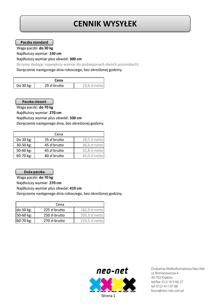 CENNIK WYSYŁEK Paczka standard Waga paczki: do 30 kg Najdłuższy wymiar: 150 cm Najdłuższy wymiar plus obwód: 300 cm (liczymy dodając największy wymiar do podwojonych dwóch pozostałych) Doręczenie następnego dnia roboczego, bez określonej godziny. Do 30 kg: Cena 29 zł brutto 23,6 zł netto Paczka niesort Waga paczki: do 70 kg Najdłuższy wymiar: 270 cm Najdłuższy wymiar plus obwód: 330 cm Doręczenie następnego dnia, bez określonej godziny. Do 30 kg: 30-50 kg: 50-60 kg: 60-70 kg: Cena 35 zł brutto 45 zł brutto 65 zł brutto 80 zł brutto 28,5 zł netto 36,6 zł netto 52,8 zł netto 65,0 zł netto Duża paczka Waga paczki: do 70 kg Najdłuższy wymiar: 270 cm Najdłuższy wymiar plus obwód: 419 cm Doręczenie następnego dnia roboczego, bez określonej godziny. do 50 kg: 50-60 kg: 60-70 kg: Cena 225 zł brutto 250 zł brutto 270 zł brutto 182,9 zł netto 203,3 zł netto 219,5 zł netto Drukarnia Wielkoformatowa Neo-Net ul. Romanowicza 4 30-702 Kraków tel/fax: 012/ 413 66 27 tel: 012/ 411 07 88 [email protected] Strona 1 Pierwsze Pakowanie Gratisis Pakowanie dla klientów z odbiorem osobistym 15 pln netto / paczkę Rozpakowanie 15 pln netto / paczkę Pakowaniez 15 pln netto / paczkę Przykład przepakowania paczki na dwie mniejsze: Rozpakowanie + paczka + paczka 15+15+15 = 45 pln netto Drukarnia Wielkoformatowa Neo-Net ul. Romanowicza 4 30-702 Kraków tel/fax: 012/ 413 66 27 tel: 012/ 411 07 88 [email protected] Usługi dodatkowe Wszystkie podane poniżej kwoty to dopłaty do kwoty podstawowej. 1. Gwarantowane doręczenie paczki do godziny 12 następnego dnia (usługa express): do 30 kg: 60 zł netto 30 - 70 kg: 140 zł netto 2. Gwarantowane doręczenie paczki do godziny 9 następnego dnia (usługa express plus): do 30 kg: 160 zł netto 30 - 70 kg: 270 zł netto 3. Paczka odbierana za pobraniem: do 700 zł netto: 5 zł netto powyżej 700 zł netto: 0,7% wartości pobrania. Decyzja o wysłaniu paczki "za pobraniem" jest podejmowana przez księgowośd na podstawie dotychczasowej historii transakcji. 4. Dodatkowe ubezpieczenie paczki do kwoty 50 000 zł netto: 10 zł netto. Wszystkie paczki są standardowo ubezpieczone do kwoty 323 zł netto. W sprawie warunków ubezpieczenia należy kontaktowad się z firmą UPS. 5. Wysłanie paczki w piątek z doręczeniem na sobotę do godziny 12: do 30 kg: 80 zł netto 30 - 70 kg: 160 zł netto Usługa dostępna jest tylko w większych miastach, należy skonsultowad z biurem przed zamówieniem. Regulamin 1. Jeżeli wymiar paczki nie pozwala na wysłanie wydruków o danym rozmiarze, mogą one zostad złożone. W celu uniknięcia takiego rozwiązania, należy wpisad w uwagach podczas składania zamówienia "nie składad wydruków". Możliwości i koszty są opisane w niniejszym cenniku, w razie wątpliwości należy się kontaktowad ze swoim opiekunem lub bezpośrednio z biurem. 2. Standardowa kwota za wysyłkę doliczana podczas składania zamówienia (29 zł brutto) może ulec zmianie jeżeli gabaryty lub waga przekraczają parametry z niniejszego cennika. O ewentualnej dopłacie klient zostanie poinformowany do 24 godzin od momentu złożenia zamówienia (tylko w dni robcze). 3. W dzieo wysłania paczki, jeżeli nie ustalono inaczej, opłata za zamówienie musi byd uregulowana. W przypadku braku wpłaty, paczka nie zostanie wysłana. 4. Wszystkie uwagi dotyczące niestandardowego sposobu wysyłki, ustalonych rabatów na wysyłkę, specjalnego sposobu pakowania itp. , powinny pojawid się w uwagach podczas składania zamówienia. 5. Drukarnia Neo-Net dokłada wszelkich starao aby przesyłki były wysyłane terminowo, nie możemy jednak zagwarantowad terminowości dostaw. Firma kurierska jest osobnym podmiotem i mimo gwarancji doręczenia paczki na następny dzieo jest narażona na różne sytuacje losowe. Proszę pamiętad, że zawsze istnieje możliwośd odbioru paczki bezpośrednio z biura lub wysłania własnego kuriera który odbierze paczkę (należy zaznaczyd odpowiednią opcję podczas składania zamówienia i przesład list przewozowy do druku). 6. Do wszystkich podanych kwot netto należy doliczyd 23% podatku VAT. Drukarnia Wielkoformatowa Neo-Net ul. Romanowicza 4 30-702 Kraków tel/fax: 012/ 413 66 27 tel: 012/ 411 07 88 [email protected]