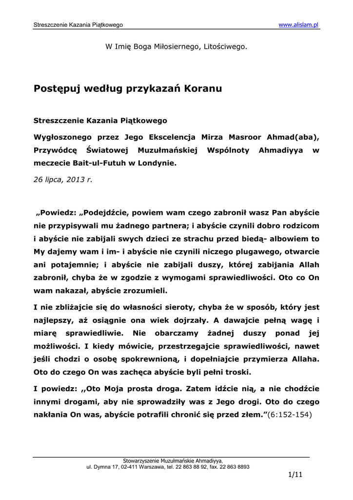 www.alislam.pl Streszczenie Kazania Piątkowego W Imię Boga Miłosiernego, Litościwego. Postępuj według przykazań Koranu Streszczenie Kazania Piątkowego Wygłoszonego przez Jego Ekscelencja Mirza Masroor Ahmad(aba), Przywódcę Światowej Muzułmańskiej Wspólnoty Ahmadiyya w meczecie Bait-ul-Futuh w Londynie. 26 lipca, 2013 r. „Powiedz: „Podejdźcie, powiem wam czego zabronił wasz Pan abyście nie przypisywali mu Ŝadnego partnera; i abyście czynili dobro rodzicom i abyście nie zabijali swych dzieci ze strachu przed biedą- albowiem to My dajemy wam i im- i abyście nie czynili niczego plugawego, otwarcie ani potajemnie; i abyście nie zabijali duszy, której zabijania Allah zabronił, chyba Ŝe w zgodzie z wymogami sprawiedliwości. Oto co On wam nakazał, abyście zrozumieli. I nie zbliŜajcie się do własności sieroty, chyba Ŝe w sposób, który jest najlepszy, aŜ osiągnie ona wiek dojrzały. A dawajcie pełną wagę i miarę sprawiedliwie. Nie obarczamy Ŝadnej duszy ponad jej moŜliwości. I kiedy mówicie, przestrzegajcie sprawiedliwości, nawet jeśli chodzi o osobę spokrewnioną, i dopełniajcie przymierza Allaha. Oto do czego On was zachęca abyście byli pełni troski. I powiedz: ,,Oto Moja prosta droga. Zatem idźcie nią, a nie chodźcie innymi drogami, aby nie sprowadziły was z Jego drogi. Oto do czego nakłania On was, abyście potrafili chronić się przed złem.”(6:152-154) Stowarzyszenie Muzułmańskie Ahmadiyya, ul. Dymna 17, 02-411 Warszawa, tel. 22 863 88 92, fax. 22 863 8893 1/11 www.alislam.pl Streszczenie Kazania Piątkowego Jak wyjaśniono to w ostatnim piątkowym kazaniu, istnieje szczególny związek pomiędzy miesiącem Ramadhan i Koranem, poniewaŜ objawienie Koranu rozpoczęło się w tym miesiącu. JednakŜe połączenie to moŜe być wykorzystane tylko wtedy, gdy nasza recytacja Koranu w czasie Ramadhanu jest wykonywane w połączeniu z rozwaŜaniem jego wskazówek, a następnie czynieniem tych wytycznych częścią naszego Ŝycia. W przeciwnym razie nie realizowalibyśmy celu objawienia Koranu w czasie Ramadhanu. Obiecany Mesjasz (as) powiedział: ,,Celem Koranu było obrócenie stanu dzikiego w człowieczeństwo, a następnie poprzez dobre maniery, uczynienie ludzi cywilizowanymi, tak aby sprawy mogłyby być rozwiązywane w wyznaczonych granicach, a następnie obrócenie ludzi w poboŜnych.” Powiedział on teŜ: ,,NaleŜy równieŜ pamiętać, Ŝe Koran niesie wytyczne dla naukowych i praktycznych osiągnięć. Jako takie, Prowadź nas drogą prostą oznacza poszukiwanie wiedzy, podczas gdy Drogą tych, których obsypałeś dobrodziejstwami (...) odnosi się do jego praktycznej realizacji, tak, Ŝe najlepsze i doskonałe wyniki mogą być osiągnięte. JeŜeli drzewko nie rośnie i nie rozwija się prawidłowo, nie moŜe rodzić kwiatów lub owoców. Podobnie wszelkie wskazówki, które nie mają najbardziej doskonałych wyników, są martwymi wytycznymi. Obiecany Mesjasz powiedział: ,,Koran jest przewodnictwem, przez które jego naśladowca osiąga doskonałość i rozwija on połączenie z Bogiem Wszechmogącym. Jego dobre uczynki, które są zgodne z wytycznymi Koranu, rosną jak błogosławione drzewo, jak wspomniano w Koranie. Rodzi ono owoce, które rozwijają charakterystyczną słodycz i aromat. Stowarzyszenie Muzułmańskie Ahmadiyya, ul. Dymna 17, 02-411 Warszawa, tel. 22 863 88 92, fax. 22 863 8893 2/11 www.alislam.pl Streszczenie Kazania Piątkowego Wyraźna zmiana zachodzi w osobie, która czyta Koran tak jak powinien on być czytany i postępuje według jego przykazań. Tworzą się silne wartości moralne i człowiek staje się cywilizowanym i poboŜnym człowiekiem, to właśnie ten stan Bóg porównał do błogosławionego drzewa: (...) Jest ono jak dobre drzewo, którego korzeń jest mocny, a gałęzie sięgają nieba? (14:25) Obiecany Mesjasz (as) powiedział: ,,Wyjaśniając to, Bóg Wszechmogący przyrównuje tutaj taką wiarę do materiału siewnego i drzewa, a uczynki do podlewania / nawadniania. Koran przywołuje podobieństwo do rolnika, który sieje nasiona i nazywa ten siew nasionami wiary. Tam funkcjonuje nawadnianie, a tutaj funkcjonują uczynki. NaleŜy zatem pamiętać, Ŝe wiara bez uczynków jest jak ogród bez jakiejkolwiek wody / strumieni. Drzewo wyschnie, jeśli po posadzeniu go jego właściciel nie zwraca uwagi na jego podlewanie. Tak samo jest z wiarą. A jeśli chodzi o tych, którzy dąŜą do spotkania z Nami (...) (29:70), to jest, nie zadawalaj się małymi próbami, ta droga wymaga wielkich dąŜeń". [duchowe] dąŜenia. Podczas (Tłumaczenie z Tafsiir Koranu, t. II, s.757 - 758) Doprawdy, Ramadhan zwraca uwagę na rozmyślania nad Koranem i starania się go zrozumieć, naleŜy równieŜ umieścić jego nauki w praktyce tak, Ŝe stają się one tymi świeŜymi i zielonymi gałązkami, które dosięgną nieba i które są połączone z Bogiem. W wersecie zarecytowanym na początku dzisiejszego kazania, Bóg zwrócił uwagę na kilka wytycznych. Dyrektywy te prowadzą nas ku Taqła i ku wypełnianiu naszych powinności wobec Boga i wobec ludzkości. Choć tłumaczenie tych wersetów stanowiłoby wyraźne wyjaśnienie tych dyrektyw, Hudhur postanowił, jako przypomnienie, jeszcze raz o nich wspomnieć: Nie przypisuj Bogu partnerów PokaŜ Ŝyczliwość wobec rodziców, ich złe traktowanie jest zabronione Stowarzyszenie Muzułmańskie Ahmadiyya, ul. Dymna 17, 02-411 Warszawa, tel. 22 863 88 92, fax. 22 863 8893 3/11 www.alislam.pl Streszczenie Kazania Piątkowego Nie zabijaj swoich dzieci z obawy przed niedostatkiem Unikaj wszelkich ukrytych i jawnych nieprzyzwoitości, w rzeczywistości nawet nie zbliŜaj się do nich Nie odbieraj Ŝycia, które Bóg uczynił świętym Nie zbliŜaj się do majątku sieroty Kiedy sieroty osiągną dojrzałość, przekaŜ im ich własność Dawaj pełną miarę i wagę z uczciwością Bądź uczciwy i sprawiedliwy we wszystkich okolicznościach, Ŝaden