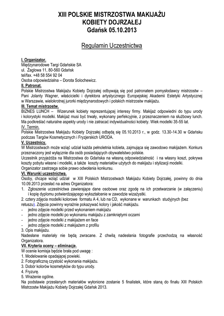XIII POLSKIE MISTRZOSTWA MAKIJAŻU KOBIETY DOJRZAŁEJ Gdańsk 05.10.2013 Regulamin Uczestnictwa I. Organizator. Międzynarodowe Targi Gdańskie SA ul. Żaglowa 11, 80-560 Gdańsk tel/fax. +48 58 554 92 04 Osoba odpowiedzialna – Dorota Solochewicz. II. Patronat. Polskie Mistrzostwa Makijażu Kobiety Dojrzałej odbywają się pod patronatem pomysłodawcy mistrzostw – Pani Jolanty Wagner, właścicielki i dyrektora artystycznego Europejskiej Akademii Estetyki Artystycznej w Warszawie, wielokrotnej jurorki międzynarodowych i polskich mistrzostw makijażu. III. Temat mistrzostw. BIZNES LUNCH – Wizerunek kobiety reprezentującej interesy firmy. Makijaż odpowiedni do typu urody i kolorystyki modelki. Makijaż musi być trwały, wykonany perfekcyjnie, z przeznaczeniem na służbowy lunch. Ma podkreślać naturalne aspekty urody i nie zatracać indywidualności kobiety. Wiek modelki 35-55 lat. IV. Termin. Polskie Mistrzostwa Makijażu Kobiety Dojrzałej odbędą się 05.10.2013 r., w godz. 13.30-14.30 w Gdańsku podczas Targów Kosmetycznych i Fryzjerskich URODA. V. Uczestnicy. W Mistrzostwach może wziąć udział każda pełnoletnia kobieta, zajmująca się zawodowo makijażem. Konkurs przeznaczony jest wyłącznie dla osób posiadających obywatelstwo polskie. Uczestnik przyjeżdża na Mistrzostwa do Gdańska na własną odpowiedzialność i na własny koszt, pokrywa koszty pobytu własne i modelki, a także koszty materiałów użytych do makijażu i stylizacji modelki. Organizator zastrzega sobie prawo odwołania konkursu. VI. Warunki uczestnictwa. Osoby, chcące wziąć udział w XIII Polskich Mistrzostwach Makijażu Kobiety Dojrzałej, powinny do dnia 10.09.2013 przesłać na adres Organizatora: 1. Zgłoszenie uczestnictwa zawierające dane osobowe oraz zgodę na ich przetwarzanie (w załączeniu) i kopię dyplomu potwierdzającego wykształcenie w zawodzie wizażystki. 2. cztery zdjęcia modelki kolorowe formatu A 4, lub na CD, wykonane w warunkach studyjnych (bez retuszu). Zdjęcia powinny wyraźnie pokazywać kolory i jakość makijażu. - jedno zdjęcie modelki przed wykonaniem makijażu - jedno zdjęcie modelki po wykonaniu makijażu z zamkniętymi oczami - jedno zdjęcie modelki z makijażem en face - jedno zdjęcie modelki z makijażem z profilu 3. Opis makijażu. Nadesłane materiały nie będą zwracane. Z chwilą nadesłania fotografie przechodzą na własność Organizatora. VII. Kryteria oceny – eliminacje. W ocenie komisja będzie brała pod uwagę : 1. Modelowanie opadającej powieki. 2. Fotograficzną czystość wykonania makijażu. 3. Dobór kolorów kosmetyków do typu urody. 4. Fryzurę. 5. Wrażenie ogólne. Na podstawie przesłanych materiałów wyłonione zostanie 5 finalistek, które staną do finału XIII Polskich Mistrzostw Makijażu Kobiety Dojrzałej Gdańsk 2013. VIII. Kryteria oceny podczas finału. 1. Podkład / modelowanie twarzy 2. Brwi / oczy / modelowanie opadającej powieki 3. Usta / konturowanie 4. Technika i czystość pracy 5. Wrażenie ogólne (efekt odmłodzenia i wprowadzenia elementów mody służbowej do stylizacji kobiety dojrzałej) Czas wykonania całości makijażu – 40 minut. Makijaż permanentny u modelki wyklucza z udziału w konkursie. W czasie finału Organizator zapewnia: garderobę , krzesło do makijażu, stolik na przybory. IX. Jury konkursu. 1. Jury konkursu powołuje patron imprezy – Pani Jolanta Wagner. 2. Jury konkursu ocenia, przyznaje nagrody i wyróżnienia, a także interpretuje regulamin. 3. Finalista z własnej woli poddaje się ocenie i krytyce członków Jury. 4. Ocena i interpretacja Jury jest ostateczna i nie podlega odwołaniu. Żadne odwołania od decyzji Jury nie będą uwzględniane. 5. Posiedzenie Jury odbędzie się po zakończeniu prezentacji 05.10.2013 r. X. Nagrody. Ogłoszenie wyników i ceremonia wręczenia nagród odbędzie się na scenie 05.10. 2013 r. o godz. 16.00. I miejsce Szkolenie Wizażysty w EAEA, nagrody rzeczowe sponsorowane, puchar, dyplom. II miejsce Szkolenie Wizażysty w EAEA, nagrody rzeczowe sponsorowane, dyplom. III miejsce Szkolenie Wizażysty w EAEA, nagrody rzeczowe sponsorowane, dyplom. IV i V miejsce Nagrody rzeczowe sponsorowane, dyplom. Organizator zastrzega sobie prawo nie przyznania nagród lub innego ich podziału. Nagrody nie podlegają zamianie na inne, ani zamianie na ekwiwalent pieniężny. W przypadku przyznania dodatkowych nagród rzeczowych, warunkiem otrzymania nagród jest dopełnienie formalności wynikających z Ustawy o Podatku Dochodowym. Laureat nagrody (w rozumieniu osoby fizycznej nie prowadzącej działalności gospodarczej) zobowiązany jest w ciągu trzech dni od jej odebrania do zapłaty w kasie MTG SA lub przelewem na rachunek MTG SA, zryczałtowanego podatku dochodowego w wysokości 10% wartości brutto otrzymanej nagrody. Firmy/ osoby prowadzące działalność gospodarczą odprowadzają same należny podatek na podstawie zaświadczenia o wartości nagrody, wydanego przez MTG SA. Zaświadczenie o wartości nagrody wystawia MTG SA. XI. Przepisy końcowe. 1. Nadesłanie zgłoszenia udziału w konkursie stanowi jednocześnie deklarację, że osoba nadsyłająca zdjęcie jest autorem koncepcji i wykonania sfotografowanych makijaży. 2. Nadesłanie zgłoszenia udziału w konkursie jest jednocześnie oświadczeniem, że autor wyjaśnił prawa osób portretowanych i osoby sportretowane wyrażają zgodę na ich publikację dla celów promocyjnych konkursu oraz, że autor przyjmuje na siebie wszelkie roszczenia jakiejkolwiek natury, które osoby trzecie mogłyby kierować przeciwko organizatorowi Konkursu. 3. Nadsyłając zgłoszenie udziału w konkursie uczestnik konkursu tym samym przyjmuje warunki Regulaminu konkursu i wyraża zgodę na przetwarzanie swoich danych osobowych zgodnie z ustawą o Ochronie Danych Osobowych ( Dz.U.Nr.133 pozycja 883). 4. Udział w konkursie jest jednoznaczny z nieodpłatnym udzieleniem prawa do wykorzystywania przez Organiz