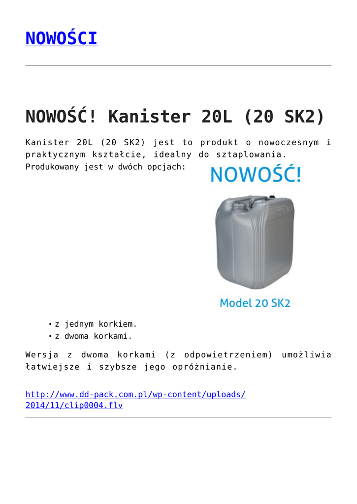 NOWOŚCI NOWOŚĆ! Kanister 20L (20 SK2) Kanister 20L (20 SK2) jest to produkt o nowoczesnym i praktycznym kształcie, idealny do sztaplowania. Produkowany jest w dwóch opcjach: z jednym korkiem. z dwoma korkami. Wersja z dwoma korkami (z odpowietrzeniem) łatwiejsze i szybsze jego opróżnianie. http://www.dd-pack.com.pl/wp-content/uploads/ 2014/11/clip0004.flv umożliwia TARGI w Poznaniu – zdjęcia NASZE beczki Cztery miesiące z Jackiem Wowrą na Spitsbergenie „Nad zatoką Białego Niedźwiedzia w fiordzie Hornsund, na wyspie Spitsbergen Zachodni w archipelagu Spitsbergen od 1957 r. działa Stacja Polarna Instytutu Geofizyki Polskiej Akademii Nauk. Jest to najdalej na północ wysunięta polska placówka naukowa prowadząca całoroczną działalność. Najbliższe cztery miesiące spędzi w niej Pan Jacek Wowra, mieszkaniec naszej gminy, dyrektor Szkoły Podstawowej w Stanowicach oraz Przewodniczący Komisji Oświaty, Kultury, Sportu i Rekreacji Starostwa Powiatowego w Rybniku. Parę dni przed wyjazdem udało nam się jeszcze porozmawiać z Panem Jackiem. ” Czytaj więcej – artykuł www.irg.pl
