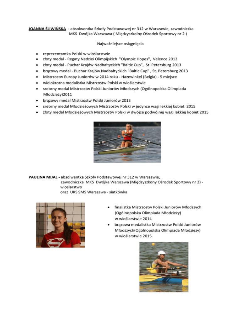 JOANNA ŚLIWIŃSKA - absolwentka Szkoły Podstawowej nr 312 w Warszawie, zawodniczka MKS Dwójka Warszawa ( Międzyszkolny Ośrodek Sportowy nr 2 ) Najważniejsze osiągnięcia reprezentantka Polski w wioślarstwie złoty medal - Regaty Nadziei Olimpijskich "Olympic Hopes", Velence 2012 złoty medal - Puchar Krajów Nadbałtyckich "Baltic Cup", St. Petersburg 2013 brązowy medal - Puchar Krajów Nadbałtyckich "Baltic Cup" , St. Petersburg 2013 Mistrzostw Europy Juniorów w 2014 roku - Hazewinkel (Belgia) - 5 miejsce wielokrotna medalistka Mistrzostw Polski w wioślarstwie srebrny medal Mistrzostw Polski Juniorów Młodszych (Ogólnopolska Olimpiada Młodzieży)2011 brązowy medal Mistrzostw Polski Juniorów 2013 srebrny medal Młodzieżowych Mistrzostw Polski w jedynce wagi lekkiej kobiet 2015 złoty medal Młodzieżowych Mistrzostw Polski w dwójce podwójnej wagi lekkiej kobiet 2015 PAULINA MIJAL - absolwentka Szkoły Podstawowej nr 312 w Warszawie, zawodniczka MKS Dwójka Warszawa (Międzyszkony Ośrodek Sportowy nr 2) wioślarstwo oraz UKS SMS Warszawa - siatkówka finalistka Mistrzostw Polski Juniorów Młodszych (Ogólnopolska Olimpiada Młodzieży) w wioślarstwie 2014 brązowa medalistka Mistrzostw Polski Juniorów Młodszych(Ogólnopolska Olimpiada Młodzieży) w wioślarstwie 2015
