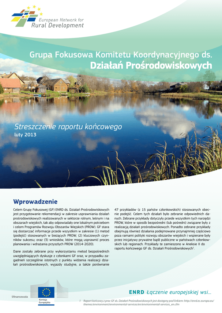 Grupa Fokusowa Komitetu Koordynacyjnego ds. Działań Prośrodowiskowych Streszczenie raportu końcowego © Donata Liutikaite luty 2013 Wprowadzenie Celem Grupy Fokusowej (GF) ENRD ds. Działań Prośrodowiskowych jest przygotowanie rekomendacji w zakresie usprawniania działań prośrodowiskowych realizowanych w sektorze rolnym, leśnym i na obszarach wiejskich, tak aby odpowiadały one lokalnym potrzebom i celom Programów Rozwoju Obszarów Wiejskich (PROW). GF stara się dostarczać informacje przede wszystkim w zakresie (1) metod (podejść) stosowanych w bieżących PROW; (2) kluczowych czynników sukcesu; oraz (3) wniosków, które mogą usprawnić proces planowania i wdrażania przyszłych PROW (2014-2020). Dane zostały zebrane przy wykorzystaniu metod bezpośrednich uwzględniających dyskusje z członkami GF oraz, w przypadku zagadnień szczególnie istotnych z punktu widzenia realizacji działań prośrodowiskowych, wyjazdy studyjne, a także porównanie Sfinansowała 47 przykładów (z 15 państw członkowskich) stosowanych obecnie podejść. Celem tych działań było zebranie odpowiednich danych. Zebrane przykłady dotyczyły przede wszystkim tych narzędzi PROW, które w sposób bezpośredni (lub pośredni) związane były z realizacją działań prośrodowiskowych. Ponadto zebrane przykłady obejmują również działania podejmowane przynajmniej częściowo poza ramami polityki rozwoju obszarów wiejskich i wspierane były przez inicjatywy prywatne bądź publiczne w państwach członkowskich lub regionach. Przykłady te zamieszono w Aneksie II do raportu końcowego GF ds. Działań Prośrodowiskowych1. ENRD Łączenie europejskiej wsi... 1 Raport końcowy z prac GF ds. Działań Prośrodowiskowych jest dostępny pod linkiem: http://enrd.ec.europa.eu/ themes/environment/environmental-services/en/environmental-services_en.cfm © Ben Allen określenia celów i zadań, silnej koordynacji oraz wsparcia doradczego, które prowadzą do zwiększonego wysiłku administracyjnego. Aby funkcjonować w dłuższym okresie, potrzebna jest większa elastyczność, długoterminowe finansowanie i poczucie odpowiedzialności za działanie. 1 Podejścia stosowane w realizacji działań prośrodowiskowych w ramach PROW Zebrane przykłady pozwalają pogrupować podejścia stosowane w realizacji działań prośrodowiskowych na pięć typów, w ramach których korzysta się z poszczególnych narzędzi PROW bądź ich kombinacji. Obejmują one: Podejście zintegrowane polega na łączeniu środków dostępnych w ramach EFRROW i/lub innych funduszy. Dzieje się to poprzez wprowadzenie programu łączącego elementy różnych działań, co jednak nie zawsze jest zrozumiałe dla ostatecznych beneficjentów (gospodarstw rolnych). Może też zdarzyć się sytuacja, w której rolnik musi wykonać pewne czynności finansowane w ramach jednego działania (np. uczestniczyć w szkoleniu), aby otrzymać wsparcie z innego (np. płatność rolno-środowiskową), jak ma to miejsce w przykładzie z regionu Marche z Włoch (zobacz raport). Inna forma wdrażania zintegrowanego polega na opracowaniu zestawu działań dla danej lokalizacji, dostosowanych w ramach większego zestawu działań przeznaczonych dla określonego typu beneficjentów lub systemu rolniczego. Korzyści wynikające z zastosowania podejścia zintegrowanego są liczne: uzależnienie wsparcia finansowego i rozwoju potencjału od rzeczywistej realizacji działań prośrodowiskowych oraz spełnienie określonych wymogów w związku z konkretnym działaniem, określonym obszarem geograficznym lub systemem rolniczym. Korzystanie z kombinacji narzędzi, szczególnie na określonym obszarze, wymaga koordynacji oraz dobrej komunikacji pomiędzy instytucjami finansującymi a wdrażającymi dane działanie. W związku z tym wiąże się to z pewnym wzrostem nakładów na administrację. Podejście kolektywne pozwala uzyskać wartość dodaną i realizować działania prośrodowiskowe na większym obszarze przy silniejszym zainteresowaniu i motywacji w zakresie tych działań. Wśród przykładów znaleźć można działania wykorzystujące podejście LEADER z Niemiec, takie jak „Poprawa ochrony wód gruntowych na obszarach uprawy chmielu” oraz „Wspieranie ekstensywnego chowu poprzez obrót produktami rolnymi” (zobacz raport). Mogą mieć one charakter regionalny lub instytucjonalny/organizacyjny. Pierwsze z tych podejść polega na zachęcaniu liczniejszej grupy rolników bądź leśników do realizowania działań na obszarze większym niż indywidualne gospodarstwa. Drugie z podejść polega z kolei na zaangażowaniu w realizację planu działania większej liczby podmiotów i interesariuszy, takich jak władze lokalne lub organizacje pozarządowe. Podejście kolektywne wymaga jasnego 2 Podejście kierowane przez społeczność, takie jak LEADER, polega na zaangażowaniu różnych interesariuszy w tworzenie, planowanie i realizację programu. Do interesariuszy tych należą podmioty indywidualne oraz organizacje lokalne i regionalne z lub spoza sektora rolnego lub leśnego. Ponieważ podejście kierowane przez społeczność zmierza do realizacji działań prośrodowiskowych w sposób elastyczny i dostosowany do potrzeb lokalnych, wymaga ono koordynacji ze strony instytucji administracyjnych, takich jak agencje ochrony przyrody lub władze krajowe/regionalne. Jednym z ciekawych przykładów podejścia kierowanego przez społeczność jest przypadek z Czech, gdzie lokalny związek łowiecki współpracuje bezpośrednio z rolnikami w celu promowania wykorzystania przyjaznych środowisku metod gospodarowania, które pomagają w utrzymaniu bioróżnorodności i poprawiają wyniki ekonomiczne. Podejście holistyczne polega na skoordynowanym działaniu przynoszącym jednocześnie wiele efektów (przykładowo podejście to zmierza do zrealizowania działania prośrodowiskowego i jednoczesnego otrzymania efektów gospodarczych i społecznych). Może 