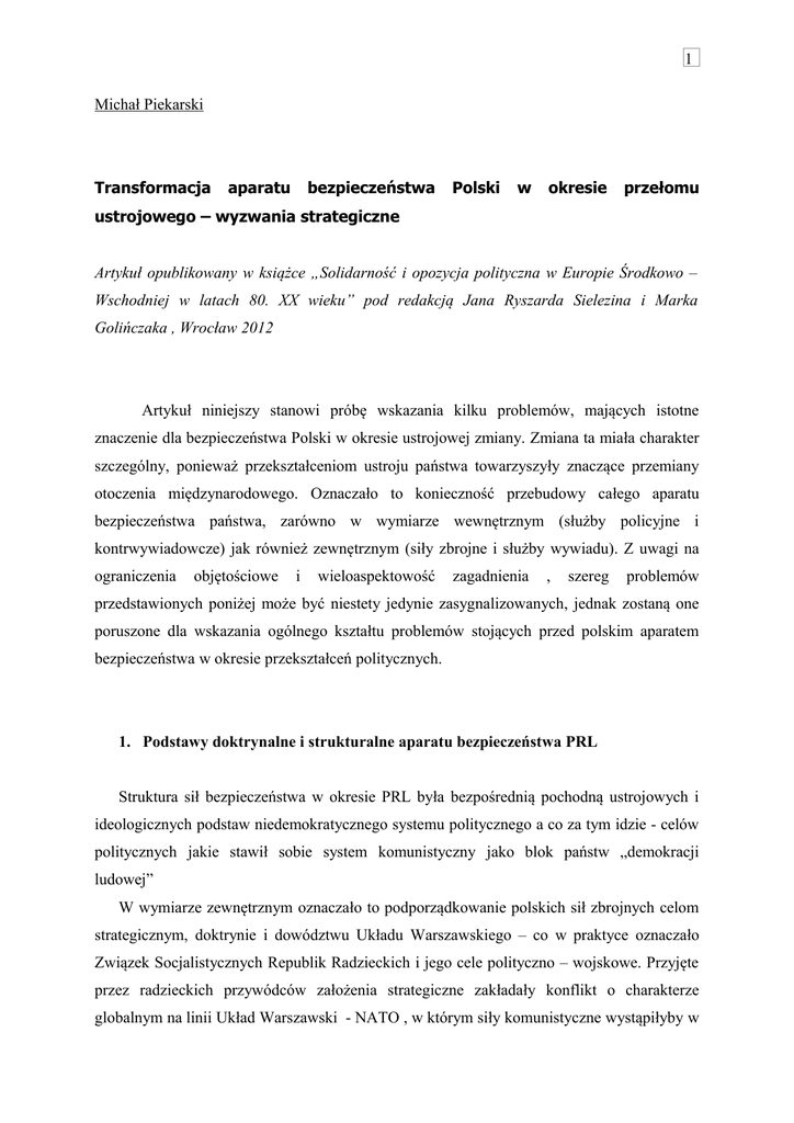 1 Michał Piekarski Transformacja aparatu bezpieczeństwa Polski w okresie przełomu ustrojowego – wyzwania strategiczne Artykuł opublikowany w książce „Solidarność i opozycja polityczna w Europie Środkowo – Wschodniej w latach 80. XX wieku” pod redakcją Jana Ryszarda Sielezina i Marka Golińczaka , Wrocław 2012 Artykuł niniejszy stanowi próbę wskazania kilku problemów, mających istotne znaczenie dla bezpieczeństwa Polski w okresie ustrojowej zmiany. Zmiana ta miała charakter szczególny, ponieważ przekształceniom ustroju państwa towarzyszyły znaczące przemiany otoczenia międzynarodowego. Oznaczało to konieczność przebudowy całego aparatu bezpieczeństwa państwa, zarówno w wymiarze wewnętrznym (służby policyjne i kontrwywiadowcze) jak również zewnętrznym (siły zbrojne i służby wywiadu). Z uwagi na ograniczenia objętościowe i wieloaspektowość zagadnienia , szereg problemów przedstawionych poniżej może być niestety jedynie zasygnalizowanych, jednak zostaną one poruszone dla wskazania ogólnego kształtu problemów stojących przed polskim aparatem bezpieczeństwa w okresie przekształceń politycznych. 1. Podstawy doktrynalne i strukturalne aparatu bezpieczeństwa PRL Struktura sił bezpieczeństwa w okresie PRL była bezpośrednią pochodną ustrojowych i ideologicznych podstaw niedemokratycznego systemu politycznego a co za tym idzie - celów politycznych jakie stawił sobie system komunistyczny jako blok państw „demokracji ludowej” W wymiarze zewnętrznym oznaczało to podporządkowanie polskich sił zbrojnych celom strategicznym, doktrynie i dowództwu Układu Warszawskiego – co w praktyce oznaczało Związek Socjalistycznych Republik Radzieckich i jego cele polityczno – wojskowe. Przyjęte przez radzieckich przywódców założenia strategiczne zakładały konflikt o charakterze globalnym na linii Układ Warszawski - NATO , w którym siły komunistyczne wystąpiłyby w 2 charakterze agresora1. Pochodną tego założenia strategicznego był określony kształt sił zbrojnych, przewidzianych do użycia we względnie krótkim konflikcie zbrojnym, toczonym przy użyciu dużej ilości sprzętu pancernego, zmechanizowanego, lotnictwa i broni rakietowo – jądrowej. Ofensywna doktryna miała dla kształtu polskich wojsk w okresie do połowy lat osiemdziesiątych szereg konsekwencji. Przede wszystkim całość zasadniczych założeń doktrynalnych była kalką doktryn radzieckich, podobnie organizacja sił, proces szkolenia, oraz stosowane typy broni i wyposażenia. Podstawowym elementem organizacyjnym armii było podzielenie jej na dwie części. Jedna miała zostać użyta do operacji ofensywnej przeciwko NATO, prawdopodobnie na kierunku Danii, północnej części RFN i ewentualnie Holandii. Był to tak zwany Front Polski2 w składzie trzech armii ogólnowojskowych (wojsk lądowych), armii lotniczej, wsparty przez wydzielone siły Marynarki Wojennej. Drugą – mającą odgrywać ważną choć drugorzędną rolę - część stanowiły siły przeznaczone do przeciwlotniczej i przeciwdywersyjnej obrony terytorium PRL, a ściślej – strategicznych szlaków komunikacyjnych biegnących przez Polskę na Zachód. Jej zasadniczymi składnikami były Wojska Obrony Przeciwlotniczej Kraju (WOPK), siły Wojsk Obrony Terytorialnej, oraz formacje paramilitarne podlegające Ministerstwu Spraw Wewnętrznych. Podobny podział można było zaobserwować w przypadku wojsk ZSRR, również dzielących się na dwie funkcjonalne części o podobnym składzie (choć znacznie liczniejsze). Siły ofensywne, zgodnie z ustaleniami z roku 1985 miały liczyć około 450 tysięcy żołnierzy, ugrupowanych jak już wspomniano we Front Polski i armie, dzielące się z kolei na szesnaście dywizji wojsk lądowych (w tym pięć pancernych i trzy rezerwowe dywizje zmechanizowane, formowane dopiero w czasie wojny), dwie brygady desantowe (6 Brygada Desantowo Szturmowa – desantu powietrznego oraz 7 Łużycka Brygada Desantowa – desantu morskiego) , cztery brygady rakiet operacyjno – taktycznych, trzy bataliony wojsk 1 Jakkolwiek oficjalnie zakładano że operacja przeciw NATO rozpocznie się w odpowiedzi na agresję zachodnią. Obszerny zbiór materiałów na temat planów wojennych Układu Warszawskiego udostępniony w Internecie http://www.php.isn.ethz.ch/collections/colltopic.cfm?lng=en&id=25996 06.10.2010. Zob też W.Skrzypczak, M.Majewski, P.Reszka Moja wojna Warszawa 2010, str 79-93. Także dokument SB – Informacja dotycży : aktualnych zainteresowań służb specjalnych USA wobec Polski – Warszawa 13.10.1983 wyrażnie i dosłownie używa określenia „plany ataku na NATO” 2 Spotykana jest także nazwa Front Nadmorski. Autor spotkał się także z niepotwierdzonymi jak dotąd informacjami jakoby siły polskie miały zostać rozdzielone pomiędzy siły radzieckie działające na kierunku Europu Północnej oraz nacierające na kierunku południowych Niemiec (tzw. luka fuldańska). 3 specjalnego przeznaczenia (rozpoznawczo – dywersyjne). Siły te miały być uzbrojone w około osiemset samolotów i śmigłowców bojowych i trzy i pół tysiąca czołgów3. Ich rola w ofensywie na Zachód była uzależniona od wizji wojny przewidywalnej przez radziecką doktrynę wojenną. Miały one posłużyć do wykonania zmasowanego uderzenia przy pomocy dużych liczebnie zgrupowań wojsk pancernych i zmechanizowanych, przełamujących obronę nieprzyjaciela przy pomocy artylerii i lotnictwa, a w szczególności przy pomocy taktycznej broni jądrowej. Działania te miały być prowadzone w szybkim tempie, z wykorzystaniem wojsk desantowych, grup dywersyjnych w celu utrudnienia lub uniemożliwienia przygotowania kontrataku przez przeciwnika. Dla dodatkowego zwiększenia tempa i skuteczności natarcia, doktryna radziecka zakładała wydzielanie szybkich grup wojsk pancernych (tzw. operacyjne grupy manewrowe do szczebla dywizji włącznie)4. Jednocześnie, zada