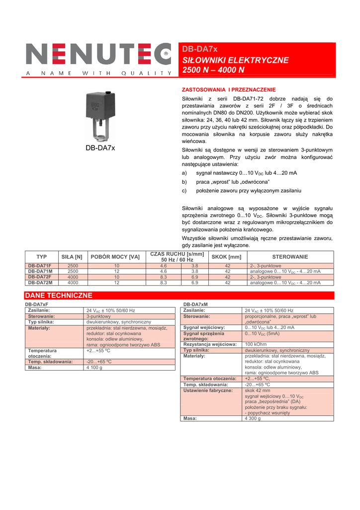 DB-DA7x SIŁOWNIKI ELEKTRYCZNE 2500 N – 4000 N ZASTOSOWANIA I PRZEZNACZENIE Siłowniki z serii DB-DA71-72 dobrze nadają się do przestawiania zaworów z serii 2F / 3F o średnicach nominalnych DN80 do DN200. Użytkownik może wybierać skok siłownika: 24, 36, 40 lub 42 mm. Siłownik łączy się z trzpieniem zaworu przy użyciu nakrętki sześciokątnej oraz półpodkładki. Do mocowania siłownika na korpusie zaworu służy nakrętka wieńcowa. DB-DA7x Siłowniki są dostępne w wersji ze sterowaniem 3-punktowym lub analogowym. Przy użyciu zwór można konfigurować następujące ustawienia: a) sygnał nastawczy 0…10 VDC lub 4…20 mA b) praca „wprost” lub „odwrócona” c) położenie zaworu przy wyłączonym zasilaniu Siłowniki analogowe są wyposażone w wyjście sygnału sprzężenia zwrotnego 0...10 VDC. Siłowniki 3-punktowe mogą być dostarczone wraz z regulowanym mikroprzełącznikiem do sygnalizowania położenia krańcowego. Wszystkie siłowniki umożliwiają ręczne przestawianie zaworu, gdy zasilanie jest wyłączone. TYP SIŁA [N] DB-DA71F DB-DA71M DB-DA72F DB-DA72M 2500 2500 4000 4000 POBÓR MOCY [VA] 10 12 10 12 CZAS RUCHU [s/mm] 50 Hz / 60 Hz 4.6 4.6 8.3 8.3 3.8 3.8 6.9 6.9 SKOK [mm] 42 42 42 42 STEROWANIE 2-, 3-punktowe analogowe 0…10 VDC - 4…20 mA 2-, 3-punktowe analogowe 0…10 VDC - 4…20 mA DANE TECHNICZNE DB-DA7xF Zasilanie: Sterowanie: Typ silnika: Materiały: Temperatura otoczenia: Temp. składowania: Masa: 24 VAC ± 10% 50/60 Hz 3-punktowy dwukierunkowy, synchroniczny przekładnia: stal nierdzewna, mosiądz, reduktor: stal ocynkowana konsola: odlew aluminiowy, rama: ognioodporne tworzywo ABS +2...+55 ºC DB-DA7xM Zasilanie: Sterowanie: Sygnał wejściowy: Sygnał sprzężenia zwrotnego: Rezystancja wejściowa: Typ silnika: Materiały: -20...+65 ºC 4 100 g Temperatura otoczenia: Temp. składowania: Ustawienie fabryczne: Masa: 24 VAC ± 10% 50/60 Hz proporcjonalne, praca „wprost” lub „odwrócona” 0...10 VDC lub 4...20 mA 0...10 VDC (5mA) 100 kOhm dwukierunkowy, synchroniczny przekładnia: stal nierdzewna, mosiądz, reduktor: stal ocynkowana konsola: odlew aluminiowy, rama: ognioodporne tworzywo ABS +2...+55 ºC, -20...+65 ºC skok 42 mm sygnał wejściowy 0…10 VDC praca „bezpośrednia” (DA) położenie przy braku sygnału: - popychacz wsunięty 4 300 g DB-DA7x SIŁOWNIKI ELEKTRYCZNE 2500 N – 4000 N WYMIARY [mm] MONTAŻ - TRZPIEŃ SIŁOWNIKA WSKAŹNIK POŁOŻENIA SKALA NAKRĘTKA BLOKUJĄCA SWORZEŃ POŁĄCZENIOWY PÓŁPODKŁADKA NAKRĘTKA POŁĄCZENIOWA POPYCHACZ ZAWORU NAKRĘTKA BLOKUJĄCA KORPUS ZAWORU Siłownik z konsolą zamocować na popychaczu zaworu (zwrócić uwagę na kierunek ruchu). Na popychacz zaworu nakręcić nakrętkę blokującą. Na popychacz zaworu nałożyć dwie półpodkładki, a następnie wkręcić trzpień siłownika w popychacz. - Zaleca się montowanie siłownika w pozycji pionowej. Nie wolno montować siłownika w pozycji odwróconej (z trzpieniem skierowanym do góry). - Wykonać połączenia elektryczne zgodnie ze schematami oraz obowiązującymi normami i przepisami. - Włączyć zasilanie siłownika w celu ustawienia popychacza w skrajnych położeniach i sprawdzić, czy zawór jest całkowicie zamykany / otwierany. W razie potrzeby, po uprzednim zwolnieniu nakrętki blokującej, wyregulować położenie trzpienia, a następnie dokręcić nakrętkę. - Ustawić wskaźnik położenia odpowiednio do wykonywanego skoku. - Fabryczne ustawienia siłownika DB-DA7xM: działanie bezpośrednie (DA), sygnał wejściowy 0...10 VDC, skok 42 mm, trzpień wsunięty. W celu uzyskania działania odwróconego (RA), zdjąć zworę ze styków J1 i założyć ją na styki J2. Zwora J5 służy do wybierania skoku siłownika: 24, 36, 40, 42 mm. Zwora J3 służy do wybierania rodzaju sygnału wejściowego: 0…10 VDC (położenie „V”) lub 4…20 mA (położenie „A”). POŁĄCZENIA ELEKTRYCZNE DB-DA7xF DB-DA7xM ZACISKI POŁĄCZENIOWE WSPÓLNY DÓŁ GÓRA Zaciski Trzpień siłownika Wysunięty Wsunięty ZASILANIE ZASILANIE 24 VAC WSPÓLNY SYGNAŁ SYGNAŁ NASTAWCZY SPRZĘŻENIA ZWROTNEGO Sygnał nastawczy Trzpień siłownika Narasta Maleje Wysuwa się Maleje Narasta Wysuwa się Wszystkie stwierdzenia, dane techniczne oraz zalecenia zamieszczone w niniejszym dokumencie mają jedynie charakter ogólny. W celu uzyskania informacji o specyficznych wymaganiach oraz doborze materiałów, dotyczących zamierzonego zastosowania, prosimy skontaktować się z przedstawicielem firmy NENUTEC lub producentem. Dane techniczne oraz konstrukcja wyrobu mogą ulec zmianie bez uprzedzenia.