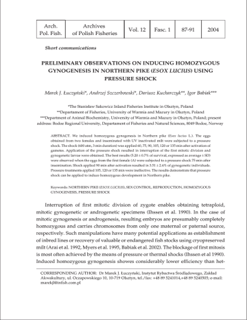 Arch. Pol. Fish. Archives of Polish Fisheries Vol. 12 Fasc. 1 87-91 2004 Short communications PRELIMINARY OBSERVATIONS ON INDUCING HOMOZYGOUS GYNOGENESIS IN NORTHERN PIKE (ESOX LUCIUS) USING PRESSURE SHOCK Marek J. £uczyñski*, Andrzej Szczerbowski*, Dariusz Kucharczyk**, Igor Babiak*** *The Stanis³aw Sakowicz Inland Fisheries Institute in Olsztyn, Poland **Departament of Fisheries, University of Warmia and Mazury in Olsztyn, Poland ***Department of Animal Biochemistry, University of Warmia and Mazury in Olsztyn, Poland; present address: Bodoe Regional University, Departament of Fisheries and Natural Sciences, 8049 Bodoe, Norway ABSTRACT. We induced homozygous gynogenesis in Northern pike (Esox lucius L.). The eggs obtained from two females and inseminated with UV inactivated milt were subjected to a pressure shock. The shock (600 atm, 3 min duration) was applied 60, 75, 90, 105, 120 or 135 min after activation of gametes. Application of the pressure shock resulted in interruption of the first mitotic division and gynogenetic larvae were obtained. The best results (5.20 ± 0.7% of survival, expressed as average ± SD) were observed when the eggs from the first female (A) were subjected to a pressure shock 75 min after insemination. Shock applied 90 min after activation resulted in 3.51 ± 2.4% of gynogenetic individuals. Pressure treatments applied 105, 120 or 135 min were ineffective. The results demonstrate that pressure shock can be applied to induce homozygous development in Northern pike. 1 Keywords: NORTHERN PIKE (ESOX LUCIUS), SEX CONTROL, REPRODUCTION, HOMOZYGOUS GYNOGENESIS, PRESSURE SHOCK Interruption of first mitotic division of zygote enables obtaining tetraploid, mitotic gynogenetic or androgenetic specimens (Ihssen et al. 1990). In the case of mitotic gynogenesis or androgenesis, resulting embryos are presumably completely homozygous and carries chromosomes from only one maternal or paternal source, respectively. Such manipulations have many potential applications as establishment of inbred lines or recovery of valuable or endangered fish stocks using cryopreserved milt (Arai et al. 1992, Myers et al. 1995, Babiak et al. 2002). The blockage of first mitosis is most often achieved by the means of pressure or thermal shocks (Ihssen et al 1990). Induced homozygous gynogenesis showes considerably lower efficiency than het1 CORRESPONDING AUTHOR: Dr Marek J. £uczyñski, Instytut Rybactwa Œródl¹dowego, Zak³ad Akwakultury, ul. Oczapowskiego 10, 10-719 Olsztyn, tel./fax: +48 89 5241014,+48 89 5240505; e-mail: [email protected] 88 M. J. £UCZYÑSKI et al. erozygous (meiotic) gynogenesis, what is attributed to homozygosity (Pandian and Koteeswaran 1998). Heterologous gynogenesis was reported several times in esocids (Lin and Dabrowski 1996, Luczynski et al. 1997, Dabrowski et al. 2000); the data on homozygous gynogenesis are limited to muskellunge (Esox masquinongy Mitchill) (Lin and Dabrowski 1998). The aim of this study was to optimize the time of initiation of the pressure shock to produce homozygous gynogenetic northern pike (Esox lucius L.) larvae. Northern pike gametes were collected by stripping spawners obtained from Szwaderki Hatchery (Olsztyn District, Poland). Eggs were kept in plastic container at 10.0°C for 2 hours before insemination. Milt was collected with syringes and kept on crushed ice at 0.0-4.0°C. Motility of sperm (in 120 mM NaCl activating solution) was examined using a microscope (500 ´), and only samples with more than 70% of motile spermatozoa were used (Babiak et al. 1995). Eggs were taken from two females (A and B) and milt from eight males. Samples of milt were pooled and eggs from each female were further divided into separate batches of approximately 900-1000 eggs. Control groups of eggs from females A and B (K-A and K-B) were fertilized with 0.05 ml of intact sperm. Milt was diluted in immobilizing solution (1:9) (Tris 2.42 g l-1, glycine 3.75 g l-1, NaCl 5.52 g l-1, KCl 2.0 g l-1) (Billard et al. 1976). Samples of milt were placed on Petri dishes (1 mm layer) and UV-irradiated (Philips 30 W UV tube, 253.7 nm, intensity of irradiation 6.4 W m-2) for 8 min (Luczynski et al. 1997). Samples of irradiated milt were pooled. Control groups of eggs (I-A and I-B) (eggs not pressure shocked) and experimental groups of eggs (each in three repetitions) were inseminated, each with 0.5 ml of diluted and UV irradiated sperm. Gametes were activated with water at 14.0°C. Approximately 2.5 min after gamete activation each group of eggs was transferred into a small plastic sieve and immersed in 14.0°C water. Groups of eggs were subjected to a pressure shock of 600 atm for 3 min, beginning at 60, 75, 90, 105, 120 or 135 min after activation (pressure chamber HPC, Aquatic Eco-Systems). The efficiency of pressure treatment was evaluated based on the hatching percentage of normally developed gynogenetic diploid and abnormally developed haploid larvae. Data were transformed (arc sin ÖP) and one-way analysis of variance (ANOVA) was employed to test the differences between experimental groups (multiple range test Tukey’s HSD intervals at p £ 0.05). The pressure shock at 600 atm lasting 3 min resulted in interruption of the first mitotic division and obtaining of gynogenetic larvae in almost all experimental PRELIMINARY OBSERVATIONS ON INDUCING HOMOZYGOUS... 89 60 A normal larvae 50 Hatching (%) abnormal larvae 40 a 30 20 10 B B C 0 K-A K-B I-A b I-B C b 60-A 60-B b b 75-A 75-B 90-A C b C b C b 90-B 105-A 105-B 120-A 120-B 135-A 135-B Group of eggs Fig. 1. The effect of a pressure shock on the hatching percentage of normal (diploid) and abnormal (haploid) larvae. The columns with the same letters are not significantly different at P = 0.05; statistics were carried out separately for female A and B – small letters mark columns showing percentage of diploid larvae obtained from female B, whereas capital letters mark columns refer to female A, respectively. Descri