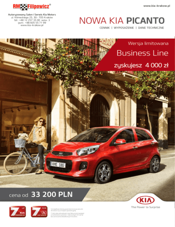 www.kia-krakow.pl Autoryzowany Salon i Serwis Kia Motors ul. Klimeckiego 25, 30- 705 Kraków tel.: +48 12 257 35 00 wew. 3 gsm: +48 605 55 71 99 www.kia-krakow.pl NOWA KIA PICANTO CENNIK | WYPOSAŻENIE | DANE TECHNICZNE Wersja limitowana Business Line zyskujesz 4 000 zł cena od 33 200 PLN Szczegółowe okresy gwarancji oraz jej warunki określone są w książce gwarancyjnej. 7-letni plan aktualizacji map fabrycznej nawigacji umożliwia korzystanie z najnowszych ich wersji bez ponoszenia dodatkowych kosztów. Rok produkcji 2016 NOWA KIA PICANTO Cennik promocyjny ważny od 09.06.2016 r. M L XL 69 KM 5 MT 33 200 zł - - 67 KM 5 MT 37 700 zł - - 69 KM 5 MT 34 700 zł 40 500 zł 45 000 zł 67 KM 5 MT 39 200 zł 45 000 zł - 85 KM 5 MT - 42 500 zł 47 000 zł wersje 3-drzwiowe B 1.0 MPI B+LPG 1.0 LPGi wersje 5-drzwiowe B 1.0 MPI B+LPG 1.0 LPGi B 1.2 MPI Wyposażenie standardowe wersji M 6 poduszek powietrznych, ESC Centralny zamek ze składanym kluczykiem System zabezpieczenia pojazdu przed kradzieżą obejmujący alarm obwodowy oraz immobilizer Elektrycznie sterowane szyby drzwi przednich Pakiet Elektrycznie, progresywne wspomaganie układu kierowniczego Komputer pokładowy dla wersji Przygotowanie do montażu radia z 2 głośnikami Koła z oponami 165/60 R14” z zapasowym kołem dojazdowym Wersja 5-miejscowa Smart M zyskujesz 1 500 zł Wyposażenie standardowe wersji L Elektrycznie sterowane szyby wszystkich drzwi Klimatyzacja manualna Elektrycznie regulowane i podgrzewane lusterka Klamki lakierowane w kolorze nadwozia Radio CD MP3 z RDS, złącza USB i AUX, 4 głośniki Wyposażenie standardowe wersji XL Światła do jazdy dziennej LED, tylne lampy LED Przednie światła typu projekcyjnego Przednie lampy przeciwmgłowe typu projekcyjnego Elektrycznie składane lusterka z kierunkowskazami LED Bluetooth z zestawem głośnomówiącym Skórzana kierownica z funkcją sterowania radiem Podgrzewana kierownica i fotele przednie Dodatkowe głośniki wysokotonowe Chromowane klamki Szczegółowe okresy gwarancji oraz jej warunki określone są w książce gwarancyjnej. 7-letni plan aktualizacji map fabrycznej nawigacji umożliwia korzystanie z najnowszych ich wersji bez ponoszenia dodatkowych kosztów. Wersja Business Line zyskujesz 4 000 zł Pakiet wyposażenia dodatkowego dla wersji L w promocyjnej cenie Wersja limitowana Business Line Wersja 5-drzwiowa zyskujesz 4 000 zł Business Line Business Line Plus B 1.0 MPI 66 KM 5 MT 42 500 zł 45 000 zł B 1.2 MPI 85 KM 5 MT 44 500 zł 47 000 zł B+LPG 1.0 LPGi 67 KM 5 MT 47 000 zł - Wyposażenie dodatkowe wersji Business Line: • • • • • • • • Klimatyzacja automatyczna Bluetooth z zestawem głośnomówiącym do telefonu 15” aluminiowe obręcze kół z oponami 175 / 50 R15 Podgrzewana kierownica i fotele przednie Skórzana kierownica z funkcją sterowania radiem Przyciemniane szyby Chromowane wykończenie klamek Kia Eco Dynamics - system automatycznego wyłączania oraz włączania silnika na postoju pozwalający zaoszczędzić paliwo Dodatkowo dla wersji Business Line Plus: • Kia Navi System z kamerą cofania, zintegrowana z usługami TomTom • Tempomat z ogranicznikiem prędkości NOWA KIA PICANTO M Bezpieczeństwo L XL KOD Poduszki powietrzne czołowe dla kierowcy i pasażera ● ● System dezaktywacji poduszki powietrznej pasażera ● ● ● Poduszki powietrzne boczne oraz pełnowymiarowe kurtyny powietrzne dla pasażerów przednich i tylnych siedzeń ● ● ● Napinacze pasów bezpieczeństwa dla foteli przednich ● ● ● Pasy bezpieczeństwa z czujnikiem obecności pasażera z przodu i z tyłu ● ● ● System bezpiecznego mocowania fotelików dziecięcych ISOFIX ● ● ● Funkcja automatycznego ryglowania zamków ● ● ● Pakiet Bezpieczeństwa: ● ABS - System zapobiegający blokowaniu się kół podczas hamowania, ● BAS - System wspomagania hamowania, ● ESC - System stabilizacji toru jazdy, ● TCS - System kontroli trakcji, ● ESS Automatycznie włączane światła awaryjne podczas gwałtownego hamowania, ● H.A.C - System wspomagający ruszanie na wzniesieniu, ● Czujniki ciśnienia w ogumieniu ● ● ● Światła do jazdy dziennej (niedostępne dla wersji LPGi) ● ● Przednie lampy przeciwmgielne typu projekcyjnego Światła do jazdy dziennej wykonane w technologii LED, przednie lampy typu projekcyjnego z funkcją oświetlania drogi do domu, tylne lampy wykonane w technologii LED, automatycznie włączane światła mijania z czujnikiem zmierzchu Czujniki parkowania tył ● ● ● ● ● 1 000 zł 1 000 zł 1 000 zł Elektryczne, progresywne wspomaganie układu kierowniczego ● ● ● Zdalne sterowanie centralnym zamkiem, alarm obwodowy, immobilizer, składany kluczyk ● ● ● Przygotowanie do montażu radia z 2 głośnikami i anteną dachową, obrotomierz ● ● ● Komputer pokładowy ● ● ● Elektrycznie sterowane szyby drzwi przednich ● Elektrycznie sterowane szyby drzwi przednich i tylnych (niedostępne dla wersji 3 - drzwiowej) ● ● Elektrycznie regulowane oraz podgrzewane lusterka w kolorze nadwozia ● ● Radioodtwarzacz CD, MP3 z RDS typu 2 DIN wyposażony w port USB oraz złącze typu AUX ● ● BWS Komfort i styl Klimatyzacja manualna ACN 3 000 zł Pakiet Smart : klimatyzacja manualna, radioodtwarzacz CD, MP3 z RDS typu 2 DIN wyposażony w port USB oraz złącze typu AUX, sterowanie funkcjami radia z kolumny kierownicy, lusterka i klamki lakierowane w kolorze nadwozia, bluetooth z zestawem głośnomówiącym do telefonu i funkcją rozpoznawania komend głosowych, skórzane wykończenie koła kierownicy i drążka zmiany biegów SMT 5500 zł 4 000 zł ● Klimatyzacja automatyczna ● Pakiet Miejski : Bluetooth z zestawem głośnomówiącym do telefonu i funkcją rozpoznawania komend głosowych, skórzane wykończenie koła kierownicy i drążka zmiany biegów, podgrzewana kierownica i fotele przednie, sterowanie funkcjami radia z kolumny kierownicy, dodatkowe gło
