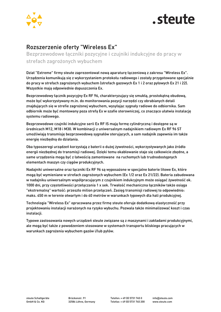 Rozszerzenie oferty "Wireless Ex" Bezprzewodowe łączniki pozycyjne i czujniki indukcyjne do pracy w strefach zagrożonych wybuchem Dział "Extreme" firmy steute zaprezentował nową aparaturę łączeniową z zakresu "Wireless Ex". Urządzenia komunikują się z wykorzystaniem protokołu radiowego i zostały przygotowane specjalnie do pracy w strefach zagrożonych wybuchem (strefach gazowych Ex 1 i 2 oraz pyłowych Ex 21 i 22). Wszystkie mają odpowiednie dopuszczenia Ex. Bezprzewodowy łącznik pozycyjny Ex RF 96, charakteryzujący się smukłą, prostokątną obudową, może być wykorzystywany m.in. do monitorowania pozycji narzędzi czy obrabianych detali znajdujących się w strefie zagrożonej wybuchem, wysyłając sygnały radiowe do odbiornika. Sam odbiornik może być montowany poza strefą Ex w szafie sterowniczej, co znacząco ułatwia instalację systemu radiowego. Bezprzewodowe czujniki indukcyjne serii Ex RF IS mają formę cylindryczną i dostępne są w średnicach M12, M18 i M30. W kombinacji z uniwersalnym nadajnikiem radiowym Ex RF 96 ST umożliwiają transmisję bezprzewodową sygnałów sterujących, a sam nadajnik zapewnia im także energię niezbędną do działania. Oba typoszeregi urządzeń korzystają z baterii o dużej żywotności, wykorzystywanych jako źródło energii niezbędnej do transmisji radiowej. Dzięki temu okablowanie staje się całkowicie zbędne, a same urządzenia mogą być z łatwością zamontowane na ruchomych lub trudnodostępnych elementach maszyn czy ciągów produkcyjnych. Nadajniki uniwersalne oraz łączniki Ex RF 96 są wyposażone w specjalne baterie litowe Ex, które mogą być wymieniane w strefach zagrożonych wybuchem (Ex 1/2 oraz Ex 21/22). Bateria zabudowana w nadajniku uniwersalnym współpracującym z czujnikiem indukcyjnym może osiągać żywotność ok. 1000 dni, przy częstotliwości przełączania 1 x sek. Trwałość mechaniczna łączników także osiąga "ekstremalną" wartość: przeszło milion przełączeń. Zasięg transmisji radiowej to odpowiednio: maks. 450 m w terenie otwartym i do 40 metrów w warunkach typowych dla hali produkcyjnej. Technologia "Wireless Ex" opracowana przez firmę steute oferuje dodatkową elastyczność przy projektowaniu instalacji narażonych na ryzyko wybuchu. Pozwala także minimalizować koszt i czas instalacji. Typowe zastosowania nowych urządzeń steute związane są z maszynami i zakładami produkcyjnymi, ale mogą być także z powodzeniem stosowane w systemach transportu bliskiego pracujących w warunkach zagrożenia wybuchem gazów i/lub pyłów. steute Schaltgeräte GmbH & Co. KG Brückenstr. 91 32584 Löhne, Germany Telefon: + 49 (0) 5731 745 0 Telefax: + 49 (0) 5731 745 200 [email protected] www.steute.com steute Schaltgeräte GmbH & Co. KG Brückenstr. 91 32584 Löhne, Germany Telefon: + 49 (0) 5731 745 0 Telefax: + 49 (0) 5731 745 200 [email protected] www.steute.com