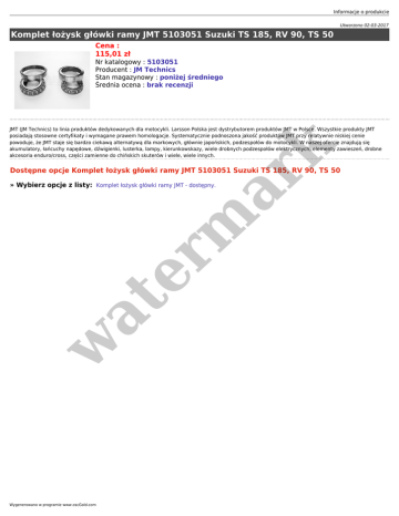 Informacje o produkcie Utworzono 02-03-2017 Komplet łożysk główki ramy JMT 5103051 Suzuki TS 185, RV 90, TS 50 Cena : 115,01 zł Nr katalogowy : 5103051 Producent : JM Technics Stan magazynowy : poniżej średniego Średnia ocena : brak recenzji er m ar k JMT (JM Technics) to linia produktów dedykowanych dla motocykli. Larsson Polska jest dystrybutorem produktów JMT w Polsce. Wszystkie produkty JMT posiadają stosowne certyfikaty i wymagane prawem homologacje. Systematycznie podnoszona jakość produktów JMT przy relatywnie niskiej cenie powoduje, że JMT staje się bardzo ciekawą alternatywą dla markowych, głównie japońskich, podzespołów do motocykli. W naszej ofercie znajdują się akumulatory, łańcuchy napędowe, dźwigienki, lusterka, lampy, kierunkowskazy, wiele drobnych podzespołów elektrycznych, elementy zawieszeń, drobne akcesoria enduro/cross, części zamienne do chińskich skuterów i wiele, wiele innych. Dostępne opcje Komplet łożysk główki ramy JMT 5103051 Suzuki TS 185, RV 90, TS 50 w at » Wybierz opcje z listy: Komplet łożysk główki ramy JMT - dostępny. Wygenerowano w programie www.oscGold.com