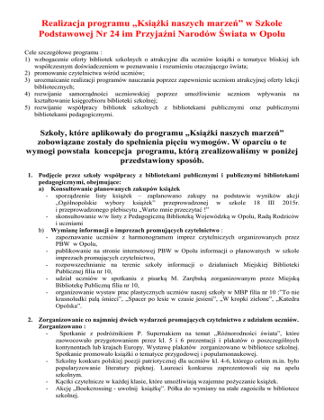 Realizacja programu „Książki naszych marzeń” w Szkole Podstawowej Nr 24 im Przyjaźni Narodów Świata w Opolu Cele szczegółowe programu : 1) wzbogacenie oferty bibliotek szkolnych o atrakcyjne dla uczniów książki o tematyce bliskiej ich współczesnym doświadczeniom w poznawaniu i rozumieniu otaczającego świata; 2) promowanie czytelnictwa wśród uczniów; 3) urozmaicanie realizacji programów nauczania poprzez zapewnienie uczniom atrakcyjnej oferty lekcji bibliotecznych; 4) rozwijanie samorządności uczniowskiej poprzez umożliwienie uczniom wpływania na kształtowanie księgozbioru biblioteki szkolnej; 5) rozwijanie współpracy bibliotek szkolnych z bibliotekami publicznymi oraz publicznymi bibliotekami pedagogicznymi. Szkoły, które aplikowały do programu „Książki naszych marzeń” zobowiązane zostały do spełnienia pięciu wymogów. W oparciu o te wymogi powstała koncepcja programu, którą zrealizowaliśmy w poniżej przedstawiony sposób. 1. Podjęcie przez szkoły współpracy z bibliotekami publicznymi i publicznymi bibliotekami pedagogicznymi, obejmujące: a) Konsultowanie planowanych zakupów książek - sporządzenie listy książek – zaplanowano zakupy na podstawie wyników akcji „Ogólnopolskie wybory książek” przeprowadzonej w szkole 18 III 2015r. i przeprowadzonego plebiscytu „Warto mnie przeczytać !” - skonsultowanie w/w listy z Pedagogiczną Biblioteką Wojewódzką w Opolu, Radą Rodziców i uczniami b) Wymianę informacji o imprezach promujących czytelnictwo : - zapoznawanie uczniów z harmonogramem imprez czytelniczych organizowanych przez PBW w Opolu, - publikowanie na stronie internetowej PBW w Opolu informacji o planowanych w szkole imprezach promujących czytelnictwo, - rozpowszechnianie na terenie szkoły informacji o działaniach Miejskiej Biblioteki Publicznej filia nr 10, - udział uczniów w spotkaniu z pisarką M. Zarębską zorganizowanym przez Miejską Bibliotekę Publiczną filia nr 10, - organizowanie wystaw prac plastycznych uczniów naszej szkoły w MBP filia nr 10 :”To nie krasnoludki palą śmieci”, „Spacer po lesie w czasie jesieni”, „W kropki zielone”, „Katedra Opolska”. 2. Zorganizowanie co najmniej dwóch wydarzeń promujących czytelnictwo z udziałem uczniów. Zorganizowano : Spotkanie z podróżnikiem P. Supernakiem na temat „Różnorodności świata”, które zaowocowało przygotowaniem przez kl. 5 i 6 prezentacji i plakatów o poszczególnych kontynentach lub krajach Europy. Wystawę plakatów zorganizowano w bibliotece szkolnej. Spotkanie promowało książki o tematyce przygodowej i popularnonaukowej. - Szkolny konkurs polskiej poezji patriotycznej dla uczniów kl. 4-6, którego celem m.in. było popularyzowanie literatury pięknej. Laureaci konkursu zaprezentowali się na apelu szkolnym. - Kąciki czytelnicze w każdej klasie, które umożliwiają wzajemne pożyczanie książek. - Akcję „Bookcrossing - uwolnij książkę”. Półka do wymiany na stałe zagościła w bibliotece szkolnej. - Całoroczny plebiscyt „Warto mnie przeczytać!”. Uczniowie uczniom polecają książki warte przeczytania. - Uroczyste pasowanie uczniów klas pierwszych na czytelników przygotowane przez uczniów klas starszych (spektakl, konkursy, upominki) połączone z lekcją biblioteczną zachęcającą do czytania. - Udział uczniów w projekcie edukacyjnym UNICEF „Mali uczniowie idą do szkół”. W ramach projektu uczniowie tworzyli swoje własne książeczki, które zostały wystawione do sprzedaży na zorganizowanej przez szkołę imprezie „Dzień książki dla Afryki”. Zebrane fundusze zostały przekazane do organizatora dla dzieci z Mali. - Spotkanie uczniów z pisarką A. Suchocką-Wachowską . Poznawano tajniki powstawania książki. - Całoroczną akcję „Spotkania z książką”. Czytano głośno bajki, baśnie i opowiadania młodszym uczniom. Czytał Samorząd na przerwach, nauczyciele i rodzice na lekcjach, systematycznie co tydzień panie w świetlicy. 3. Uwzględnienie tematyki wpływu czytania na rozwój dzieci podczas zorganizowanego przez szkołę co najmniej jednego spotkania z rodzicami. - W 14 oddziałach szkolnych na spotkaniach wychowawców z rodzicami odczytano „List otwarty” do rodziców autorstwa I. Koźmińskiej, mówiący o wpływie czytania na rozwój dzieci. 4. Zrealizowanie co najmniej jednego projektu edukacyjnego na oddział w szkole z wykorzystaniem księgozbioru biblioteki szkolnej. Zorganizowano : Klasy 1 – „Chwila z J. Tuwimem” etapy : Poznajemy twórczość i sylwetkę J. Tuwima (każda klasa inne utwory) –zajęcia z udziałem rodziców. - Dzień z Tuwimem – recytacja wierszy przez uczniów (konfrontacje międzyklasowe w interpretacji utworów J. Tuwima. - Inscenizacje wierszy : 1a „Rzepka”,1 b „Warzywa”, 1c „Ptasie radio”. - Recytacja wierszy i przedstawianie inscenizacji przez uczniów na zebraniach rodziców. - Międzyklasowy konkurs - plastyczne interpretacje wierszy. - Wyniki konkursu , ekspozycja nagrodzonych prac w bibliotece szkolnej. - Klasy 2 – „Chwila z J. Brzechwą” etapy : Poznajemy twórczość i sylwetkę J. Brzechwy (każda klasa inne utwory) – zajęcia prowadzone m.in. w pracowni komputerowej. - Prezentacje multimedialne. - Inscenizacje wierszy : 2 b „Leń”, 2c „Na straganie”. - Recytacja wierszy i przedstawianie inscenizacji przez uczniów na zebraniach rodziców. - Plastyczne interpretacje wierszy – wystawa prac na gazetkach klasowych. - Międzyklasowy konkurs recytatorski. - Klasy 3 Klasa 3a - „Chwila z H. Ch. Andersenem” etapy: - Poznajemy twórczość i sylwetkę J. Brzechwy. - Czytanie i omówienie wybranych baśni. - Prezentacja przez uczniów ulubionych baśni. - Międzyklasowy konkurs - plastyczne interpretacje ulubionych baśni H. Ch Andersena. - Wyniki konkursu , ekspozycja nagrodzonych prac w bibliotece szkolnej. - Klasa 3b - „Comiesięczne spotkania z książką” etap
