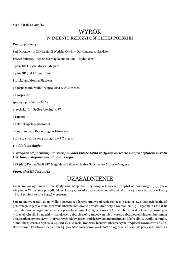 Sygn. akt III Ca 405/14 WYROK W IMIENIU RZECZYPOSPOLITEJ POLSKIEJ Dnia 3 lipca 2014 r. Sąd Okręgowy w Gliwicach III Wydział Cywilny Odwoławczy w składzie: Przewodniczący - Sędzia SO Magdalena Balion - Hajduk (spr.) Sędzia SO Lucyna Morys - Magiera Sędzia SR (del.) Roman Troll Protokolant Monika Piasecka po rozpoznaniu w dniu 3 lipca 2014 r. w Gliwicach na rozprawie sprawy z powództwa M. W. przeciwko (...) Spółce Akcyjnej w W. o zapłatę na skutek apelacji pozwanej od wyroku Sądu Rejonowego w Gliwicach z dnia 17 stycznia 2014 r., sygn. akt I C 154/12 1 oddala apelację; 2 zasądza od pozwanej na rzecz powódki kwotę 1.200 zł (tysiąc dwieście złotych) tytułem zwrotu kosztów postępowania odwoławczego. SSR (del.) Roman Troll SSO Magdalena Balion – Hajduk SSO Lucyna Morys – Magiera Sygn. akt: III Ca 405/14 UZASADNIENIE Zaskarżonym wyrokiem z dnia 17 stycznia 2014r. Sąd Rejonowy w Gliwicach zasądził od pozwanego (...) Spółki Akcyjnej w W. na rzecz powódki M. W. kwotę 17 200zł z ustawowymi odsetkami od dnia 24 marca 2011r. oraz kwotę 3677 zł tytułem zwrotu kosztów procesu. Sąd Rejonowy ustalił, że powódkę i pozwanego łączyła umowa ubezpieczenia mieszkania (...). Odpowiedzialność pozwanego włączało m.in. zdarzenie ubezpieczeniowe w postaci „kradzieży z włamaniem”, tj – zgodnie z § 2 pkt 18 owu zaborem cudzego mienia w celu przywłaszczenia, którego sprawca dokonał lub usiłował dokonać po usunięciu – przy użyciu siły i narzędzi – istniejących zabezpieczeń, zamocowań lub otwarciu zabezpieczeń kluczem lub innym urządzeniem otwierającym, który sprawca zdobył przez kradzież z włamaniem z innego lokalu albo w wyniku rabunku. Suma ubezpieczenia wynosiła 43 000 zł, a w razie kradzieży biżuterii ubezpieczyciel wypłacał równowartość 40% skradzionych kosztowności. W dniu 24 lipca 2010 roku powódka około 7.00 wyjechała z domu do pracy w K.. Mieszka przy ulicy (...) w G., w domu jednorodzinnym. Chodziła wówczas o kulach, była po operacji. W związku z tym nie mogła wspiąć się po drabinie lub krześle, by otworzyć okno u góry. Pomagała jej wówczas córka A. W., która była w domu powódki dzień przed zdarzeniem. Zostawiła wówczas okno w pokoju od strony ogrodu zamknięte na zewnątrz i uchylone od wewnętrznej strony. Było to stare, drewniane trójskrzydłowe i dwuwarstwowe okno. Jego uchylona część znajdowała się wewnątrz domu po prawej stronie, patrząc z perspektywy pokoju, a po lewej – z perspektywy ogrodu. Okno było białe, pomalowane. W godzinach dopołudniowych małoletni (wówczas czternastoletni) A. D. wszedł na posesję powódki. Zadzwonił domofonem, by zorientować się, czy jest ktoś w domu, a upewniwszy się, że dom jest pusty, przeszedł na ogród. Tam podważył prawe skrzydło okna i otworzył zewnętrzny lufcik po prawej stronie. Następnie przez ten otwarty lufcik, pchnął wewnętrzną część okna. W ten sposób pokój w mieszkaniu powódki stanął dla niego otworem. Następnie A. D. przeszedł przez lufcik do pokoju, a przeciskając się zerwał firanę. Przeszedł po mieszkaniu powódki, otwierając jej szafki, półki, barek. Znalazł kasetkę z biżuterią, alkohol i pieniądze w kwocie 2 700 zł. Zapakował łupy w bluzki powódki i wyszedł przez okno, które od wewnątrz otworzył na oścież.W kasetce, którą sprawca zabrał z domu powódki była biżuteria. Mąż powódki był koneserem biżuterii i na rocznice ślubu dawał ją żonie. Powódka była także obdarowywana przez swoją teściową. Słynęła wśród znajomych z pięknej i kosztownej biżuterii. Mąż powódki w latach 90 nabywał ją najczęściej od znajomego jubilera (...), częstego bywalca restauracji powódki i jej męża. W kasetce znajdowały się: 1 Naszyjnik z czarnych pereł hodowlanych (średnica 9 mm) o wartości 1 200 zł; 2 Dwa naszyjniki ze złota (jeden pełny gruby, drugi przeplatany: z białego i żółtego złota o łącznej masie po 25 gramów i próbie złota 0,750) o łącznej wartości 6 500 zł; 3 5 sztuk złotych łańcuszków próby 0,750 o łącznej masie około 2 gramów o wartości 5 200 zł; 4 Komplet złotej biżuterii (kolia, łańcuszek, bransoletka i kolczyki – w stylu celtyckim), próby 0,750, o masie około 50 gramów i wartości 13 000 zł; 5 4 sztuki złotych pierścionków (złoto próby 0,750, masa: 20 gramów): 1.z białymi kamieniami, 2.z zielonymi kamieniami, 3.z białego złota z ośmiokątnym kamieniem, 4. pierścionek typu obrączka z brylantami: o łącznej wartości 5 200 zł.; 6 Złote kolczyki (próba 0,750, masa około 5 gramów) o wartości 1 300 zł; 7 Dwa pierścionki złote z kamieniami – jeden z szafirem i diamentem, a drugi z białego złota z brylantami, próba: 0,750, masa łączna: 10 gramów) o łącznej wartości 4 000 zł; 8 Łańcuszek z zawieszką w kształcie koziorożca (próba 0,750, masa: około 6,5 grama) o wartości około 1 600 zł; 9 Łańcuszek z wisiorkiem z literą (...) (próba 0,750, masa: około 6,5 grama) o wartości około 1 600 zł; 10 Łańcuszek w formie kostek złotych (próba 0,750, masa: około 3,3 grama) o wartości około 800 zł; 11 Zegarek damski z bransoletką z białego złota, wysadzany brylancikami o puszkowym zapięciu, pochodzący najprawdopodobniej z przełomu XIX i XX wieku o łącznej wartości 15 000 zł; 12 Dwa złote zegarki (białe i żółte złoto próby 0,585) o wartości łącznej około 1 600 zł. 13 Złota obrączka (próba 0,585, masa 2,5 grama) o wartości 350 zł; dwie sztuki zegarków złotych z białego i żółtego złota próby 0,585 o łącznej wartości 1 600 zł; 14 Srebrne kolczyki i bransoletka o wartości około 400 zł. 15 Łańcuszek z wisiorem z wizerunkiem Matki Boskiej. Powódka zawiadomiła pozwanego o szkodzie, a ten przeprowadził postępowanie likwidacyjne i wypłacił w jego wyniku kwotę 95,88 zł z tytułu uszkodzenia ramy okiennej. Wezwany do zapłaty