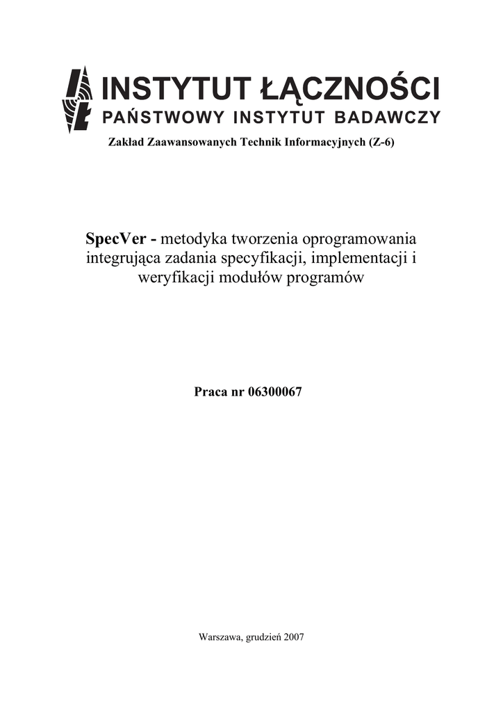 Zakład Zaawansowanych Technik Informacyjnych (Z-6) SpecVer - metodyka tworzenia oprogramowania integrująca zadania specyfikacji, implementacji i weryfikacji modułów programów Praca nr 06300067 Warszawa, grudzień 2007 SpecVer – metodyka tworzenia oprogramowania integrująca zadania specyfikacji, implementacji i weryfikacji modułów programów Praca nr 06300067 Słowa kluczowe: inżynieria oprogramowania, środowiska wspomagające tworzenie oprogramowania, programowanie wysoce zintegrowane, specyfikacja, weryfikacja, logika algorytmiczna. Kierownik pracy: prof. dr hab. Andrzej Salwicki Wykonawca pracy: prof. dr hab. Andrzej Salwicki Kierownik Zakładu: dr inż. Janusz Granat © Copyright by Instytut Łączności, Warszawa 2007 Spis Treści 1. Wstęp 2. Prace opublikowane a. G. Mirkowska, A. Salwicki, O. Świda, SpecVer – the methodology integrating specification, programming and verification, invited talk in Proceedings of the CS&P'2007 Łagów 27-29 październik 2007 (L.Czaja ed.) Wydawnictwa Uniwersytetu Warszawskiego, pp 9-20, ISBN 978-83-88734-28-9, b. H. Langmaack, A. Salwicki, M. Warpechowski, A deterministic algorithm elaborating direct superclassesin Java-like languages, in Proceedings of the CS&P'2007 Łagów 27-29 październik 2007 (L.Czaja ed.) Wydawnictwa Uniwersytetu Warszawskiego, pp.388-399, ISBN 978-8388734-28-9, c. A. Salwicki, Andrzej Grzegorczyk's contribution to Computer Science, Fundamenta Informaticae 81(2007) pp. 253-261, d. H. Langmaack, A. Salwicki, M. Warpechowski, Ueber das Vererben und dessen implicite Definition in der Sprachspezifikation des neuen Java mit inneren Klassen, invited talk during 14th Colloquium „Programiersprachen und Grundlagen der Programierung”, Timmendorfer Strand, 10-12 Oktober 2007 3. Prace przyjęte do druku a. On an algorithm determining direct superclasses In Java-like languages with inner classes – its correctness, completeness and uniqueness of solutions, wspólnie z H. Langmaackiem I M. Warpechowskim ok. 45 str. artykuł złożony do Information and Computation i zaakceptowany b. H. Langmaack, A. Salwicki, M. Warpechowski, On the correctness and completeness of a deterministic algorithm elaborating direct super classes in Java-like languages, złożone do druku w Fundamenta Informaticae, c. G. Mirkowska, A. Salwicki, O. Świda, Algorithmic Logic + SpecVer = the methodology for high integrity programming, przyjete do druku w Fundamenta Informaticae 4. Oprogramowanie Wstęp Tworzymy coraz większe programy, o coraz bardziej złożonej strukturze. Ryzyko już nie błędu, a katastrofy jakie jest z tym związane rośnie co najmniej wykładniczo wraz z długością kodu. Niektórzy inwestorzy dostrzegli problem i zamawiają oprogramowanie wraz dowodem jego poprawności. Uważamy, że stosowane dotąd metody nie są adekwatnie dobrane do trudnego celu udowodnienia poprawności oprogramowania. Powstają rozmaite produkty, ale to dopiero początek. Nowe technologie dopiero powstaną. Nasza propozycja to nowa oryginalna metodologia tworzenia oprogramowania integrująca: specyfikację modułów, implementację – czyli tworzenie oprogramowania i weryfikację otrzymanego oprogramowania względem wcześniej powstałej specyfikacji. Co udało się uzyskać skromnymi środkami jakie stały do naszej dyspozycji? 1. Wtyczkę o nazwie SpecVer do środowiska Eclipse. 2. Opracowania wykazujące walory logiki algorytmicznej jako narzędzia specyfikacji i weryfikacji oprogramowania. Eclipse jest otwartym, popularnym środowiskiem edycji, kompilacji i uruchamiania programów. Nasza wtyczka umożliwia tworzenie projektów SpecVer . Na taki projekt składają się nie tylko pliki z programami, ale i pliki specyfikacji oraz pliki weryfikacji. W obecnej wersji działa edycja plików specyfikacji. Logika algorytmiczna zaproponowana w naszych opracowaniach okazuje się narzędziem bardziej przydatnym w specyfikowaniu klas (w programowaniu obiektowym) od innych narzędzi np. specyfikacje algebraiczne są znacznie słabsze i mniej przydatne. Logika algorytmiczna nie też sobie równych w weryfikowaniu klas i metod (algorytmów). O metodologii donosimy w opracowaniach 2a i 3c. Przykłady specyfikacji i dowodów zawarto w opracowaniach 2b, 2c, 3a, 3b. Oprogramowanie Oprogramowanie jest w tej chwili dostępne dla każdego pod adresem URL http://aragorn.pb.bialystok.pl/~swida/svp Jego głównym twórcą jest dr Oskar Świda z Politechniki Białostockiej.. Ja pełniłem rolę konsultanta i pomysłodawcy. Uważam, że warto by było stworzyć stronę projektu SpecVer pomiędzy stronami Instytutu Łączności, m. In. Po to by z niej dystrybuować to oprogramowanie. Jestem gotów tę stronę opracować i nią zarządzać. Nie mam jak dotąd na to zgody.