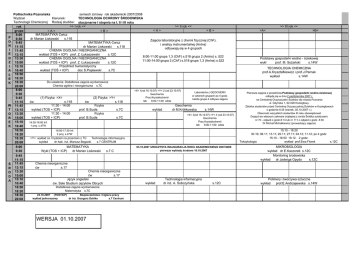 P O N I E D Z I A Ł E K W T O R E K Ś R O D A Politechnika Poznańska semestr zimowy rok akademicki 2007/2008 Wydział TECHNOLOGIA OCHRONY ŚRODOWISKA Kierunek: Technologii Chemicznej Rodzaj studiów: stacjonarne I stopnia na I, II i III roku >> I rok << >> II rok << rok <A> <B> grupa <A> <B> MATEMATYKA Ćwicz 8:00 dr Marian Liskowski s.118 9:30 Zajęcia laboratoryjne z chemii fizycznej (ChF), MATEMATYKA Ćwicz 9:45 i analizy instrumentalnej (AnIns) dr Marian Liskowski s.118 11:15 odbywają się w 4 grupach CHEMIA OGÓLNA I NIEORGANICZNA 11:45 wykład (TOŚ + ICP) prof. Z. Łukaszewski s.12C 13:15 8:00-11:00 grupa 1,3 (ChF) s.518 grupa 2 (AnIns) s. 522 CHEMIA OGÓLNA I NIEORGANICZNA 13:30 11:00-14:00 grupa 2 (ChF) s.518 grupa 1,3 (AnIns) s.522 wykład (TOŚ + ICP) prof. Z. Łukaszewski s.12C 15:00 Przedmiot humanistyczny 15:10 wykład (TOŚ + ICP) doc S.Popławski s.7C 16:40 16:50 18:20 Do ustalenia: Dodatkowe zajęcia wyrównawcze 18:30 Chemia ogólna i nieorganiczna s.7C 20:00 8:00 >X< 1(od 16.10.07) >Y< 2 (od 23.10.07) Laboratoria z GEOCHEMII Geochemia 9:30 w czterech grupach po 4 godz. Prac.Krystalochemii (1) Fizyka >X< (2) Fizyka >Y< 9:45 każda grupa 4 odbywa zajęcia lab 8:00-11:00 wilda ćw s.118 ćw s.118 11:15 11:30 - 14:00 Fizyka Geochemia 11:45 prof. B.Susła s.7C dr M.Królikowska s.14W wykład (TOS + ICP) wykład 13:15 11:30 - 14:00 Fizyka 13:30 >X< 3(od 16.10.07) >Y< 4 (od 23.10.07) wykład (TOS + ICP) prof. B.Susła s.7C 15:00 Geochemia Prac.Krystalochemii 15:10 14:30-16:00 Inf. lab 8:00-11:00 wilda 1 proj. s.47W 16:40 16:50 16:00-17:30 Inf. 2 proj. s.47W 18:20 >Y< wykład co II tydzień na przemian z TC Technologia informacyjna 18:30 wykład dr hab. inż. Mariusz Bogacki s.7 CENTRUM 20:00 MATEMATYKA 8:00 03.10.2007 UROCZYSTA INAUGURACJA ROKU AKADEMICKIEGO 2007/2008 pierwsze wykłady środowe 10.10.2007 Wykł (TOS + ICP) dr Marian Liskowski s.7 C 9:30 9:45 11:15 Chemia nieorganiczna 11:45 ćw s.17 13:15 Chemia nieorganiczna 13:30 ćw s.17 15:00 Technologia informacyjna Język angielski 15:10 wykład dr inż. A. Sobczyńska s.12C ćw. Sale Studium Języków Obcych 16:40 Dodatkowe zajęcia wyrównawcze 16:50 Matematyka s.7C 18:20 24.10.2007 (TOS+ICP) Bezpieczeństwo i higiena pracy 18:30 wykład jednorazowy dr inż. Grzegorz Dahlke s.7 Centrum 20:00 WERSJA 01.10.2007 >> III rok << >A< >B< Podstawy gospodarki wodno - ściekowej wykł prof. M. Sożański s.14W TECHNOLOGIA CHEMICZNA prof.A.Krysztafkiewicz i prof.J.Pernak wykład s.14W Pierwsze zajęcia z przedmiotu Podstawy gospodarki wodno-ściekowej odbędą się w dniu 2 października 2007 r. na Centralnej Oczyszczalni Ścieków dla miasta Poznania ul. Gdyńska 1, 62-028 Koziegłowy. Zbiórka studentów przed Centralną Oczyszczalnią Ścieków w Koziegłowach o godzinie 8.55 (wtorek, 02.10.2007 r.). Obecność wszystkich studentów III roku obowiązkowa! Dojazd we własnym zakresie (najlepiej z ronda Śródka autobusem: nr 70 - odjazd o godz.8:14 lub nr 111 o odjazd o godz. 8:30 Dr Michał Michałkiewicz (prowadzący zajęcia) 15:10 - 18:20 30.10; 06.11; 13.11; 20.11; 27.11; 04.12; 11.12; po 4 godz 15:10 - 16:50 19.12. 2 godz. Toksykologia wykład prof.Ewa Florek MIKROBIOLOGIA wykład dr E.Kaczorek s.12C Monitoring środowiska wykład dr Jadwiga Opydo s.12C Polimery i tworzywa sztuczne wykład prof.E.Andrzejewska s.14W s.12C C Z W A R T E K 8:00 9:30 9:45 11:15 11:45 13:15 13:30 15:00 15:10 16:40 Chemia organiczna wykład (łącznie z IPC) prof. A. Olszanowski 18.10. 13:00-14:00 Usługi bibl.inf. s.7C 18.10. 14:00-15:00 Usługi bibl.inf. 16:50 18:20 16:40-18:10 Inf. 3 proj. s.47W Zajęcia projektowe - komputerowe z TECHNOLOGII INFORMACYJNEJ odbędą się w 3 grupach (początek 8:00; 9:45 i 11:45) w Sali 47 na Wildzie w gmachu Kwestury 1. Analiza instrumentalna 2. Geochemia Zajęcia oznaczone : >X< odbywają się co drugi tydzień i rozpoczynają się w pierwszym tygodniu zajęć (zajęcia nad kreską) >Y< odbywają się co drugi tydzień i rozpoczynają się w drugim tygodniu zajęć (zajęcia pod kreską) ZOBACZ NA TABLICY WYKAZ TYGODNI DLA ZAJĘĆ ODBYWAJĄCYCH SIĘ CO DRUGI TYDZIEŃ. Pełne nazwy przedmiotów umieszczone są na planie studiów w sąsiedniej gablocie. Rodzaje zajęć to: wykł. - wykład; ćw. - ćwiczenia; Miejsce zajęć : Zebranie całego roku 04.10.2007 godz.8:00 sala 101 Wilda (B17) LABORATORIUM Technologia chemiczna Zakład Technologii Chemicznej WILDA zajęcia odbywają się 4 grupach zgodnie z podziałem w terminach 8:00-10:15; 10:30-12:45; 13:00-15:15; 15:30-17:45 18:20-19:50 Inf. 4 proj. s.47W Dodatkowe zajęcia wyrównawcze 18:30 Fizyka s.7C 20:00 8:00 WYCHOWANIE FIZYCZNE Zajęcia odbywają się na obiektach sportowych 9:30 zgodnie z podziałem dokonanym przez 9:45 STUDIUM WYCHOWANIA FIZYCZNEGO PP 11:15 P 11:45 Język angielski I 13:15 ćw. sale Studium Języków Obcych Ą 13:30 Wstęp do ekologii T 15:00 wykład dr JanUrbaniak s.12C E 15:10 K 16:40 16:50 18:20 Zajęcia: Usługi biblioteczne i informacyjne i BHP 18:30 obowiązkowe z zaliczeniem w indeksie 20:00 Egzaminy: 1. Matematyka 2. Fizyka UWAGA : Analiza instrumentalna wykł (łącznie z IPC) prof. H. Matusiewicz s. 7C Chemia fizyczna wykład (łącznie z IPC) prof. A. Lewandowski s.7C Zajęcia projektowe - komputerowe z TECHNOLOGII INFORMACYJNEJ odbędą się w 4 grupach 2 gr. wtorek i 2 gr.czwartek (dla studentów nie korzystających z zajęć wyrównawczych z fizyki) w sali 47 na Wildzie w gmachu Kwestury sem./s. - seminarium; proj./pr./p. - projekt; lab./l. - laboratorium; s.17,118,425,436,436x - Piotrowo,gmach WBMiZ; s.3W,5W,14W,34W,30W,49W - Wilda,budynek B17; s.38,58,47 Zakł.Technol.Chem. s.47W,49W - sala komputerowa i projektowa na II piętrze gmachu Kwestury na Wildzie s.21W - ul.Bergera, Zakł.Elektrochemii Stosowanej Podział na grupy będzie podany na listach lat studiów. Czekamy na roczliczenie sesji. Mogą być zmiany szczególnie na II roku gdzie wielu studentów prawdopodobnie nie zaliczy laboratoriów z chemii analit