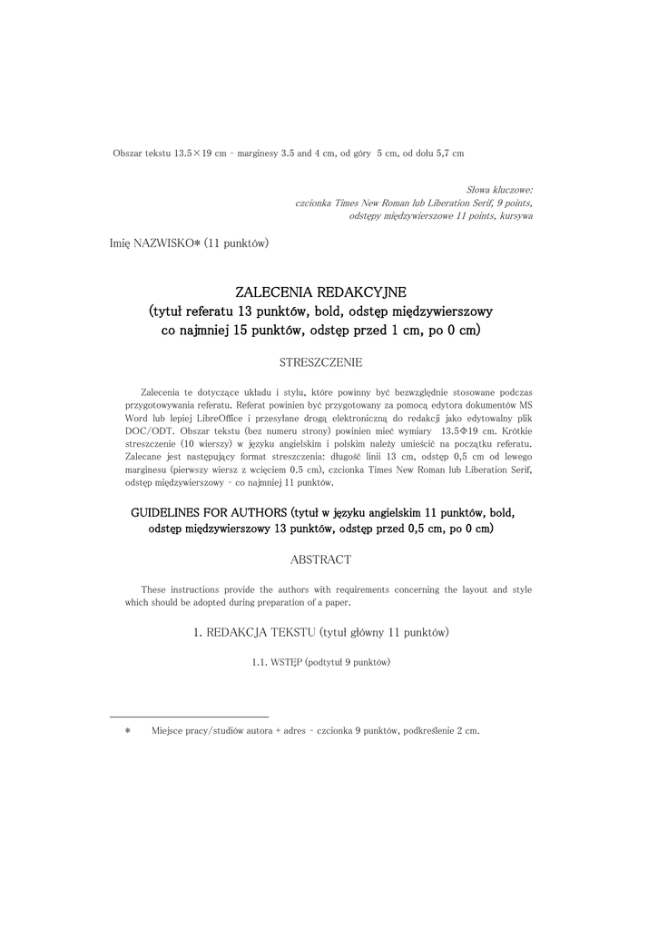 Obszar tekstu 13.5×19 cm – marginesy 3.5 and 4 cm, od góry 5 cm, od dołu 5,7 cm Słowa kluczowe: czcionka Times New Roman lub Liberation Serif, 9 points, odstępy międzywierszowe 11 points, kursywa Imię NAZWISKO* (11 punktów) ZALECENIA REDAKCYJNE (tytuł referatu 13 punktów, bold, odstęp międzywierszowy co najmniej 15 punktów, odstęp przed 1 cm, po 0 cm) STRESZCZENIE Zalecenia te dotyczące układu i stylu, które powinny być bezwzględnie stosowane podczas przygotowywania referatu. Referat powinien być przygotowany za pomocą edytora dokumentów MS Word lub lepiej LibreOffice i przesyłane drogą elektroniczną do redakcji jako edytowalny plik DOC/ODT. Obszar tekstu (bez numeru strony) powinien mieć wymiary 13.519 cm. Krótkie streszczenie (10 wierszy) w języku angielskim i polskim należy umieścić na początku referatu. Zalecane jest następujący format streszczenia: długość linii 13 cm, odstęp 0,5 cm od lewego marginesu (pierwszy wiersz z wcięciem 0.5 cm), czcionka Times New Roman lub Liberation Serif, odstęp międzywierszowy – co najmniej 11 punktów. GUIDELINES FOR AUTHORS (tytuł w języku angielskim 11 punktów, bold, odstęp międzywierszowy 13 punktów, odstęp przed 0,5 cm, po 0 cm) ABSTRACT These instructions provide the authors with requirements concerning the layout and style which should be adopted during preparation of a paper. 1. REDAKCJA TEKSTU (tytuł główny 11 punktów) 1.1. WSTĘP (podtytuł 9 punktów) * Miejsce pracy/studiów autora + adres – czcionka 9 punktów, podkreślenie 2 cm. Dołożymy starań by wszystkie pozytywnie zrecenzowane referaty zostały opublikowane w drukowanych materiałach pokonferencyjnych (być może z kodem ISBN). W tekście referatu należy używać określeń “rozdział'” w miejsce referatu/artykułu i sekcja. Akceptowane będą tylko oryginalne prace nie przekazywane lub opublikowane gdzie indziej. Pełny tekst referatu nie powinien być nie dłuższy niż 8 stron (zawsze parzysta liczba stron!). 1.2. STYL TEKSTU (9 punktów) Zasadniczy tekst artykułu powinny być złożony czcionką o rozmiarze 11 punktów, odstęp między wierszami co najmniej 13 punktów na całej długości linii, czyli 13,5 cm; Każdy nowy akapit powinien zaczynać się wcięciem pierwszego wiersza 0.5 cm. Nie zaleca się zostawiania dodatkowych pustych wierszy między akapitami. Nie należy rozpoczynać nowego akapitu w ostatnim wierszu kolumny/strony i unikać wpisywania ostatniego wiersza akapitu w nowej kolumnie/stronie. Ostatni wiersz akapitu powinien zawierać co najmniej 5 znaków. Pożądane jest by tekst zajmował całą stronę/kolumnę.. 1.3. WZORY MATEMATYCZNE I TABELKI (9 punktów) Wzory matematyczne należy wpisać przy użyciu czcionki wielkości 11 punktów. Powinny być one wyśrodkowane i numerowane w nawiasach po prawej stronie. Wszystkie symbole reprezentujące zmienne należy wpisać kursywą, zarówno we wzorach, jak i w tekście. Znaczenie symboli i oznaczeń wielkości fizycznych występujących we wzorach powinno być objaśnione w tekście. Należy pozostawić jeden wiersz odstępu między tekstem i wzorem. Tytuły tabel (także podpisów pod rysunkami) należy wpisać przy użyciu czcionki o rozmiarze 9 punktów i zachować odstęp między wierszami co najmniej 11 punktów. Tytuły tabel i podpisy powinny być wyśrodkowane. x= a1− c +b 10− d 2 (1) Inne zalecenia: – nie należy używać ukośników (slash) zamiast nawiasów, – należy używać myślnika (kod Alt 0150), a nie dywizu (-) do zaznaczenia zakresu, np., 3–45 Mpa. 2. ILUSTRACJE 2.1. STYL RYSUNKÓW Rysunki, wykresy, fotografie powinny być numerowane kolejno 1, 2,..., n. Podpisy pod rysunkami powinny być wyśrodkowane. Nie należy ich wpisywać jako normalnych wierszy tekstu, a dodawać jako element rysunku. Należy pozostawić jeden pusty wiersz między ilustracją i tekstem (przed i po). W zasadzie nie zaleca się stosowanie opływania rysunku tekstem. Jeśli jednak rysunek jest bardzo mały, można zastosować opływanie tekstem zgodnie z zasadą umieszczania go w lewej części stron parzystych, a w prawej części strony nieparzystych, czyli przy zewnętrznym marginesie strony. Podpisy pod rysunkami – czcionka 9 punktów z interlinią 11 punktów – bez końcowej kropki. Rysunki i zdjęcia powinny być włączone do tekstu. Rys. 1. Podpis pod rysunkiem bez końcowej kropki (9 punktów) Rysunki będą drukowane jako czarno-białe, więc pożądane jest unikanie umieszczania w dostarczanych materiałach rysunków kolorowych. Nie jest wykluczone, że w trakcie przygotowywania materiałów konferencyjnych do druku niezbędne będzie dodatkowe dostarczenie rysunków w we wskazanym formacie rastrowym lub wektorowym. Jak już wspomniano wcześniej, tabelki też powinny być numerowane kolejno i zawsze opatrzone tytułami umieszczonymi nad tabelką. Tytuły tabelek powinny być złożone czcionką 9-punktową i wyśrodkowane. LITERATURA (9 punktów) Odwołania do poszczególnych pozycje wymienionych w tekście należy podać w nawiasach, np., [3] lub [1, 4 ]. W spisie literatury, czyli w tej sekcji, uporządkowanie powinno być alfabetyczne wg nazwisk autora/autorów -rozmiar czcionki 9 punktów, odstęp wierszy co najmniej 11 punktów. Należy podać nazwiska wszystkich autorów, inicjały imion, tytuł książki (liczba kolejnych wydań lub objętość), nazwę czasopisma w przypadku artykułu, miejsca publikacji, wydawnictwo, rok, numer (w przypadku czasopism), zakres stron. W przypadku pozycji w języku rosyjskim należy użyć cyrylicy lub skorzystać z transliteracji. Dla źródeł internetowych należy podać nazwę witryny i nazwę zamieszczonego w niej materiału, a także datę odwiedzin. Poniżej zamieszczono przykłady. [1] KOWALSKI L., Zastosowanie doświadczalnej mechaniki zniszczenia czy kompozytów o matrycach cementowych. W: Mechanika kompozytów betonopodobnych, A.M. Brandt (Red.), Wrocław, Ossoli-neum, 1983, 449–