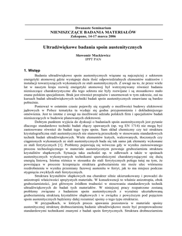 Dwunaste Seminarium NIENISZCZĄCE BADANIA MATERIAŁÓW Zakopane, 14-17 marca 2006 Ultradźwiękowe badania spoin austenitycznych Sławomir Mackiewicz IPPT PAN 1. Wstęp Badania ultradźwiękowe spoin austenitycznych wiązane są najczęściej z sektorem energetyki atomowej gdzie występuje duża ilość odpowiedzialnych elementów reaktorów i instalacji towarzyszących wykonanych ze stali austenitycznych. Z uwagi na to, że przez wiele lat w naszym kraju rozwój energetyki atomowej był wstrzymywany również badania nieniszczące charakterystyczne dla tego sektora nie były rozwijane i są stosunkowo mało znane polskim specjalistom. Brak jest również przepisów i unormowań w tym zakresie, zaś na kursach badań ultradźwiękowych techniki badań spoin austenitycznych omawiane są bardzo pobieżnie. Ponieważ w ostatnim czasie pojawiły się sygnały o możliwości budowy elektrowni jądrowych w Polsce tematyka ta wydaje się godna przypomnienia i dokładniejszego omówienia. Jest to istotne z uwagi na możliwość udziału polskich firm i specjalistów badań nieniszczących w budowie planowanych elektrowni. Dobrym punktem wyjścia do dyskusji o badaniach spoin austenitycznych jest pytanie dlaczego standardowe techniki badań złączy spawanych (np. wg EN 1714) nie mogą być zastosowane również do badań tego typu spoin. Sam skład chemiczny czy też struktura krystalograficzna stali austenitycznych nie stanowią przeszkody w stosowaniu standardowych technik badań ultradźwiękowych. Wiele elementów kutych, walcowanych, tłoczonych czy ciągnionych wykonanych ze stali austenitycznych bada się tak samo jak elementy wykonane ze stali ferrytycznych [1]. Problemy pojawiają się wówczas gdy w wyniku zastosowanego procesu technologicznego w materiale austenitycznym powstaje gruboziarnista struktura krystalitów słupkowych. Sytuacja taka zachodzi np. w odlewach a także w spoinach austenitycznych wykonywanych technikami spawalniczymi charakteryzującymi się dużą energią liniową. Istotna różnica w stosunku do stali ferrytycznych polega tutaj na tym, że powstająca w procesie krzepnięcia struktura gruboziarnista nie może ulec wtórnemu rozdrobnieniu w wyniku przemiany fazowej austenitu w ferryt, jak to ma miejsce podczas stygnięcia zwykłych stali ferrytycznych. Struktura krystalitów słupkowych ma charakter silnie ukierunkowany i prowadzi do anizotropii właściwości sprężystych materiału. W konsekwencji to właśnie anizotropia, obok gruboziarnistości, jest głównym źródłem trudności w stosowaniu standardowych technik ultradźwiękowych do badań tych materiałów. W niniejszej pracy rozpatrzone zostaną problemy związane z badaniem spoin austenitycznych z wyraźnie ukształtowaną gruboziarnistą strukturą krystalitów słupkowych i w związku z powyższym pod pojęciem spoin austenitycznych będziemy dalej rozumieć spoiny o tego typu strukturze. W przypadkach, w których proces spawania pozostawia w materiale spoiny austenitycznej strukturę drobnoziarnistą badanie ultradźwiękowe może być przeprowadzone standardowymi technikami znanymi z badań spoin ferrytycznych. Struktura drobnoziarnista często występuje np. w spoinach austenitycznych o małej grubości spawanych technikami o małej energii liniowej lub przy dużej szybkości odprowadzania ciepła. To czy określone złącza spawane mogą być badane technikami standardowymi należy rozstrzygnąć w oparciu o badania metalograficzne oraz testy ultradźwiękowe przeprowadzone na reprezentatywnych próbkach spoin. 2. Struktura i właściwości akustyczne spoin austenitycznych W wyniku krzepnięcia stopiwa spoiny austenitycznej kształtuje się w niej struktura gruboziarnista charakteryzująca się tym, że poszczególne krystality są wydłużone i zorientowane kierunkiem krystalograficznym [100] równolegle do kierunku odpływu ciepła. Z uwagi na geometrię jeziorka spawalniczego kierunek ten jest generalnie równoległy do kierunku grubości materiału jednak w pobliżu krawędzi bocznych spoiny może odchylać się w kierunku prostopadłości do granicy materiału rodzimego (patrz rys.1). Typowe przekroje złączy austenitycznych ze zobrazowaniem słupkowej struktury metalograficznej pokazano na rys. 1. Rys. 1. Typowe obrazy struktur krystalitu słupkowego w spoinach austenitycznych. Ziarna krystalitów mają często długości przekraczające 10 mm i szerokości ok. 1 mm. Długość krystalitów może być większa niż grubość ściegów spawalniczych co oznacza, że ciągłość ich struktury krystalicznej zostaje zachowana na granicach między kolejnymi warstwami stopiwa. Dokładny rozkład orientacji i rozmiarów ziaren zależy od rodzaju materiału, geometrii spoiny oraz zastosowanej technologii spawania jednak jego podstawowe cechy są następujące: • duże rozmiary i wyraźnie wydłużony kształt ziaren • dominująca orientacja krystalitów kierunkiem [100] równolegle do kierunku grubości, • brak wyraźnie wyróżnionej orientacji krystalitów w płaszczyźnie poziomej • odchylenia od pionowej orientacji krystalitów w pobliżu linii wtopu spoiny Powyższe cechy struktury metalograficznej spoiny austenitycznej wprowadzają określone trudności i ograniczenia w stosowaniu ultradźwiękowej metody badań. 2.1. Tłumienie i rozpraszanie wsteczne Duże rozmiary ziaren powodują wzrost rozpraszania fal ultradźwiękowych na granicach ziaren co powoduje zarówno znaczny wzrost współczynnika tłumienia jak też podwyższenie poziomu szumów strukturalnych. Oprócz ogólnego pogorszenia stosunku sygnał-szum interferencje fal rozproszonych na różnych granicach ziaren mogą czasem prowadzić do powstawania wskazań pozornych. Współczynnik tłumienia fal ultradźwiękowych szybko wzrasta z częstotliwością fali zaś przy tej samej częstotliwości jest wyraźnie większy dla fal poprzecznych niż podłużnych. Przykładowo, w typowej spoinie austenitycznej [2] współczyn
