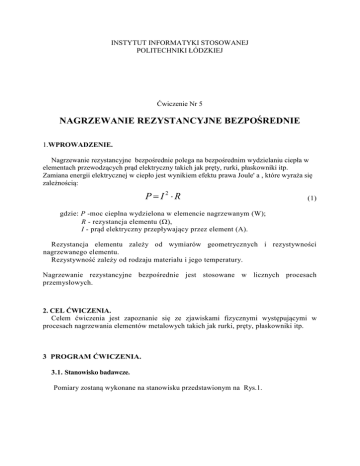 INSTYTUT INFORMATYKI STOSOWANEJ POLITECHNIKI ŁÓDZKIEJ Ćwiczenie Nr 5 NAGRZEWANIE REZYSTANCYJNE BEZPOŚREDNIE 1.WPROWADZENIE. Nagrzewanie rezystancyjne bezpośrednie polega na bezpośrednim wydzielaniu ciepła w elementach przewodzących prąd elektryczny takich jak pręty, rurki, płaskowniki itp. Zamiana energii elektrycznej w ciepło jest wynikiem efektu prawa Joule' a , które wyraża się zależnością: PI2 R (1) gdzie: P -moc cieplna wydzielona w elemencie nagrzewanym (W); R - rezystancja elementu (), I - prąd elektryczny przepływający przez element (A). Rezystancja elementu zależy od wymiarów geometrycznych i rezystywności nagrzewanego elementu. Rezystywność zależy od rodzaju materiału i jego temperatury. Nagrzewanie rezystancyjne bezpośrednie jest stosowane w licznych procesach przemysłowych. 2. CEL ĆWICZENIA. Celem ćwiczenia jest zapoznanie się ze zjawiskami fizycznymi występującymi w procesach nagrzewania elementów metalowych takich jak rurki, pręty, płaskowniki itp. 3 PROGRAM ĆWICZENIA. 3.1. Stanowisko badawcze. Pomiary zostaną wykonane na stanowisku przedstawionym na Rys.1. Rys.1. Stanowisko badawcze. Oznaczenia na Rys. l. : ATr - autotransformator 0-230 V V1, V2, Vp – woltomierze, Al - amperomierz, F - siła docisku, l - ciało nagrzewane - wsad, 2 - szczęki zasilające chłodzone wodą, T - termoelement, p.k. - przewody kompensacyjne. Nagrzewany wsad jest umieszczany między dwoma zespołami szczęk zasilających chłodzonych wodą. Rezystancja przejścia na styku szczęka-wsad jest nastawiana poprzez zmianę siły docisku F. Moc grzejna jest nastawiana przez zmianę napięcia zasilającego, przy użyciu autotransformatora ATr. Temperatura wsadu jest mierzona termoelementem opasującym NiCr-NiAl połączonym z miernikiem cyfrowym temperatury zaopatrzonym w układ samoczynnej korekcji wpływu zmian temperatury odniesienia. 3.1. Wyznaczanie charakterystyk roboczych układu. Dla kilku zadanych wartości napięcia U , zasilającego autotransformator ATr pomierzyć prąd pierwotny Il transformatora zasilającego, napięcie U2 na szczękach zasilających i temperaturę wsadu . Wyniki pomiarów zestawić w Tabeli l a w drugiej jej części wpisać następujące obliczone wartości: I 2 I1 z1 I 26,42 z2 1 P2 I 2 U 2 RW U2 I2 (2) (3) (4) Każdego pomiaru dokonywać przy określonej nastawionej wartości U1 po uzyskaniu cieplnego stanu ustalonego wg obserwacji wskazań miernika temperatury i amperomierza. Tabela 1 U1 V 5 30 60 85 110 I1 A U2 V ◦C I2 A P2 W Rw Ω W stanie cieplnie ustalonym przy U=70 V pomierzyć spadek napięcia między szczęką miedzianą chłodzoną wodą a wsadem przy różnych wartościach siły docisku F szczęki górnej. Wyniki zestawić w Tabeli 2 oraz obliczyć rezystancję przejścia Rp wg zależności: Rp Up I2 (5) Tabela 2 F kg U1 V I1 A Up V Rp Ω Wartość siły F należy przeliczać z wartości ściśnięcia sprężyny podstawie umieszczonej w układzie skali milimetrowej, wg zależności: l ustalonych F k l ; gdzie k 39,2 N / mm 4 OPRACOWANIE WYNIKÓW. Przedstawić graficznie następujące zależności: =f(P) , Rw=f(), Rp=f(F), przy ot=const przy F=const przy =const i ot=const Wyznaczyć średni cieplny współczynnik zmiany rezystancji wsadu w funkcji temperatury. Podać komentarze dotyczące uzyskanych wyników i rozkładu wzdłużnego temperatury wsadu. na (6) 5 LITERATURA. [1] Hering M., Podstawy elektrotermii cz.1. WNT, Warszawa 1992. [2] Zgraja J., Wykład z przedmiotu „Podstawy wymiany i generowania ciepła" PYTANIA KONTROLNE 1. 2. 3. 4. 5. Na czym polega nagrzewanie rezystancyjne bezpośrednie? Co mówi prawo Joule’a-Lenza? Jakie parametry wsadu wpływają na jego rezystancję? Od czego zależy rezystywność? W jaki sposób można zmieniać rezystancję przejścia uchwyt-wsad?
