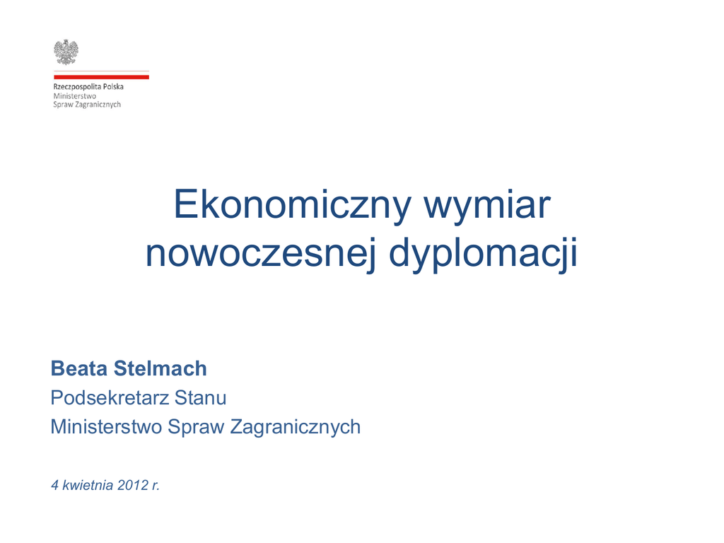 Ekonomiczny wymiar nowoczesnej dyplomacji Beata Stelmach Podsekretarz Stanu Ministerstwo Spraw Zagranicznych 4 kwietnia 2012 r. Globalne wyzwania POLITYCZNE GOSPODARCZE zadłużenie strefa euro dalsza integracja UE demografia „oburzeni”, „arabska wiosna” układ sił w świecie … SPOŁECZNE Globalne wyzwania • Zmiana układu sił - Szybki wzrost rynków wschodzących - Pozycja Chin: - od 2010 gospodarka nr 2 w świecie - największy światowy eksporter (1,9 bln USD w 2011 r.) - inwestycje w Ameryce Łacińskiej i Afryce większe niż zaangażowanie USA i UE - Kryzys zadłużenia i programy naprawcze państw rozwiniętych - Wydatki na zbrojenia w UE mniejsze niż w państwach azjatyckich Globalne wyzwania Największe gospodarki w 2050 wg. HSBC: The World in 2050 (styczeń 2012) Kraj Pozycja 2050 Zmiana wobec 2010 Chiny 1 +2 USA 2 -1 Indie 3 +5 Japonia 4 -2 Niemcy 5 -1 Wielka Brytania 6 -1 Brazylia 7 +2 Meksyk 8 +5 …. … … Polska 25 -1 Polska 2011/2012 2009 2010 2011 2012 (f) Wzrost PKB % 1,6 3,9 4,3 2,5 Obroty handlu zagranicznego (mld EUR) 205,7 254,6 286,2 --- Napływ FDI (mld EUR) 9,8 6,7 9,9 --- Wskaźnik Wielkość Lokata Polski na tle UE PKB w 2011r. (mld EUR) 398 6 Ludność w 2011 r. (mln) 38,1 6 Polska 2011/2012 KE: 2,5% wzrostu PKB w 2012 r. (2,9% wg. BŚ) 63% średniego PKB UE w 2010 (43% w 1995) 7- krotny wzrost PKB 1990-2010 20. gospodarka świata (wg. MFW, CIA, BŚ) Polska 2011/2012 2-krotny wzrost eksportu od akcesji 10-krotny wzrost eksportu 1990-2010 15-krotny wzrost obrotów handlowych 1990-2010 135,8 mld EUR – eksport w 2011 r. (rekordowy wzrost o 15,4 mld EUR rdr) 60% eksportu to wynik działalności przedsiębiorstw zagranicznych w Polsce Polska 2011/2012 2011: napływ FDI 9,9 mld EUR (+47% rdr) 2010: napływ FDI 6,7 mld EUR (12 366 nowych miejsc pracy – 3. miejsce w UE) 110 mld EUR inwestycji zagranicznych 1990-2010 UNCTAD: 6-krotny wzrost wartości polskich FDI 2005-2010 6. miejsce w World Investment Report UNCTAD Priorytety polityki zagranicznej Silna Polska w silnej unii politycznej Wiarygodny sojusznik w stabilnym ładzie euroatlantyckim Otwartość na różne wymiary współpracy regionalnej Promocja Polski za granicą Priorytety polskiej polityki zagranicznej Skuteczna służba zagraniczna Strategia współpracy rozwojowej, promocji demokracji i praw człowieka Polska Prezydencja w Radzie UE 184 dni • Ponad 400 projektów kulturalnych za granicą • Ok. 30 tys. delegatów w Polsce • 2 150 akredytowanych dziennikarzy • Spotkania: 452 w Polsce; 1 940 w Brukseli • 50 formalnych i nieformalnych spotkań ministrów UE • Ponad 300 spotkań eksperckich • …i ponad 230 kg zjedzonych „krówek” Promocja MARKA NARODOWA Dyplomacja ekonomiczna Dyplomacja publiczna i kulturalna Promocja Dyplomacja publiczna i kulturalna Zróżnicowane narzędzia Instytuty Polskie Konferencje naukowe, wydarzenia kulturalne Edukacja i nauka: katedry j. polskiego, wymiana studentów, stypendia Wizyty studyjne Promocja Dyplomacja ekonomiczna Promocja Polski jako stabilnej gospodarki Osiągnięcia transformacji Wspieranie polskich przedsiębiorstw Promocja polskiego rynku kapitałowego Przyciąganie inwestorów zagranicznych Promocja Przykładowe działania dyplomacji ekonomicznej Ok. 600 interwencji polskich dyplomatów w 60 krajach w 2011 r. Konferencje i seminaria, przybliżanie rynków zagranicznych Komponent gospodarczy oficjalnych wizyt zagranicznych Perspektywiczne kierunki Populacja mln wzrost PKB (%, MFW) handel zagraniczny z Polską 2011 (mln EUR; %) 2010 2011 2012 (f) eksport % import % obroty razem % 8,80% Chiny 1 339,0 10,4 9,2 8,2 1 347,9 0,99% 13 245,5 14 593,4 5,10% Rosja 143,0 4,0 4,1 3,3 6 143,8 4,53% 18 377,7 12,21% 24 521,5 8,57% Brazylia 192,3 7,5 2,9 3,0 271,2 0,20% 740,2 0,49% 1 011,4 0,35% Meksyk 112,3 5,4 4,1 3,5 311,1 0,23% 255,1 0,17% 566,2 0,20% Chile 17,2 5,2 6,5 4,7 34,8 0,03% 150,3 0,10% 185,1 0,06% Peru 29,5 8,8 6,2 5,6 26,7 0,02% 38,9 0,03% 65,6 0,02% Argentyna 40,1 6,1 4,5 4,0 73,5 0,05% 576,8 0,38% 650,3 0,23% Kolumbia 46,3 4,3 4,9 4,5 37,9 0,03% 98,4 0,07% 136,3 0,05% MSZ otwarty na współpracę Departament Dyplomacji Ekonomicznej MSZ 148 placówek zagranicznych [email protected] Dziękuję za uwagę Beata Stelmach Podsekretarz Stanu Ministerstwo Spraw Zagranicznych 4 kwietnia 2012 r.