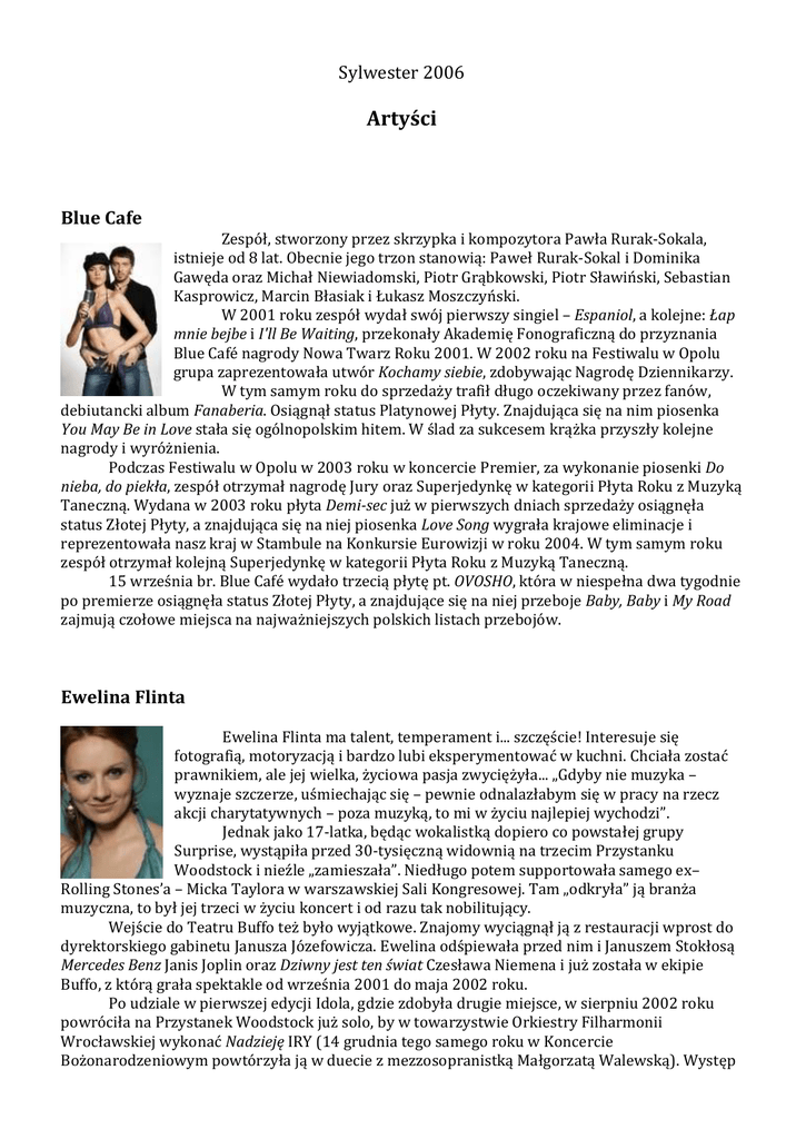 Sylwester 2006 Artyści Blue Cafe Zespół, stworzony przez skrzypka i kompozytora Pawła Rurak-Sokala, istnieje od 8 lat. Obecnie jego trzon stanowią: Paweł Rurak-Sokal i Dominika Gawęda oraz Michał Niewiadomski, Piotr Grąbkowski, Piotr Sławiński, Sebastian Kasprowicz, Marcin Błasiak i Łukasz Moszczyński. W 2001 roku zespół wydał swój pierwszy singiel – Espaniol, a kolejne: Łap mnie bejbe i I'll Be Waiting, przekonały Akademię Fonograficzną do przyznania Blue Café nagrody Nowa Twarz Roku 2001. W 2002 roku na Festiwalu w Opolu grupa zaprezentowała utwór Kochamy siebie, zdobywając Nagrodę Dziennikarzy. W tym samym roku do sprzedaży trafił długo oczekiwany przez fanów, debiutancki album Fanaberia. Osiągnął status Platynowej Płyty. Znajdująca się na nim piosenka You May Be in Love stała się ogólnopolskim hitem. W ślad za sukcesem krążka przyszły kolejne nagrody i wyróżnienia. Podczas Festiwalu w Opolu w 2003 roku w koncercie Premier, za wykonanie piosenki Do nieba, do piekła, zespół otrzymał nagrodę Jury oraz Superjedynkę w kategorii Płyta Roku z Muzyką Taneczną. Wydana w 2003 roku płyta Demi-sec już w pierwszych dniach sprzedaży osiągnęła status Złotej Płyty, a znajdująca się na niej piosenka Love Song wygrała krajowe eliminacje i reprezentowała nasz kraj w Stambule na Konkursie Eurowizji w roku 2004. W tym samym roku zespół otrzymał kolejną Superjedynkę w kategorii Płyta Roku z Muzyką Taneczną. 15 września br. Blue Café wydało trzecią płytę pt. OVOSHO, która w niespełna dwa tygodnie po premierze osiągnęła status Złotej Płyty, a znajdujące się na niej przeboje Baby, Baby i My Road zajmują czołowe miejsca na najważniejszych polskich listach przebojów. Ewelina Flinta Ewelina Flinta ma talent, temperament i... szczęście! Interesuje się fotografią, motoryzacją i bardzo lubi eksperymentować w kuchni. Chciała zostać prawnikiem, ale jej wielka, życiowa pasja zwyciężyła... „Gdyby nie muzyka – wyznaje szczerze, uśmiechając się – pewnie odnalazłabym się w pracy na rzecz akcji charytatywnych – poza muzyką, to mi w życiu najlepiej wychodzi”. Jednak jako 17-latka, będąc wokalistką dopiero co powstałej grupy Surprise, wystąpiła przed 30-tysięczną widownią na trzecim Przystanku Woodstock i nieźle „zamieszała”. Niedługo potem supportowała samego ex– Rolling Stones’a – Micka Taylora w warszawskiej Sali Kongresowej. Tam „odkryła” ją branża muzyczna, to był jej trzeci w życiu koncert i od razu tak nobilitujący. Wejście do Teatru Buffo też było wyjątkowe. Znajomy wyciągnął ją z restauracji wprost do dyrektorskiego gabinetu Janusza Józefowicza. Ewelina odśpiewała przed nim i Januszem Stokłosą Mercedes Benz Janis Joplin oraz Dziwny jest ten świat Czesława Niemena i już została w ekipie Buffo, z którą grała spektakle od września 2001 do maja 2002 roku. Po udziale w pierwszej edycji Idola, gdzie zdobyła drugie miejsce, w sierpniu 2002 roku powróciła na Przystanek Woodstock już solo, by w towarzystwie Orkiestry Filharmonii Wrocławskiej wykonać Nadzieję IRY (14 grudnia tego samego roku w Koncercie Bożonarodzeniowym powtórzyła ją w duecie z mezzosopranistką Małgorzatą Walewską). Występ Eweliny z Orkiestrą znalazł się w dokumencie Przystanek Woodstock 2002 – Najgłośniejszy Film Polski. Jej debiutancki album Przeznaczenie zaledwie po trzech miesiącach od daty premiery otrzymał miano Złotej Płyty. Koncerty to jej żywioł. Również te na festiwalach, m.in. w Opolu, Karlshamn, Sopocie. Ale niezależnie od tego, czy jest niepokorna, czy liryczna, jak często, za co i przez kogo nagradzana (a nagród, zarówno tych od branży, jak i fanów zebrała sporo – dwa razy z rzędu za wokalistkę roku Superjedynkę na Festiwalu w Opolu 2003 i 2004, Różę Gali, Eska Music Awards, Mikrofony Popcornu), w głowie jej się nie przewraca. Jak twierdzi: „Jestem dziewczyną z sąsiedztwa, może trochę zwariowaną i ciekawą świata... na pewno na tyle odważną by podążać za swoimi marzeniami”. Podczas koncertu charytatywnego Jolanty Kwaśniewskiej Ladies Ewelina, jakby symbolicznie, zaśpiewała Zaproście mnie do stołu... Przy krajowym, muzycznym „okrągłym stole” ma już swoje stałe miejsce, ale nie zamierza na tym poprzestać. Sama mówi: „Na swoją pozycję pracuje się całe życie, ja przygotowuję właśnie trzecią, solową płytą. Dojrzałam i pewnie trochę wszystkich zaskoczę. Premiera wiosną 2007”. Kayah Uznawana za najlepszą polską wokalistkę. Bezapelacyjnie najbardziej charyzmatyczna gwiazda rodzimej sceny muzycznej. Udział artystki w każdym przedsięwzięciu muzycznym gwarantuje światowy poziom i znakomite show. Kayah wydała 6 płyt: Kamień, Zebra, Kayah i Bregovic, JakaJaKayah, Stereo typ, The best & The Rest. Koncert artystki to w zasadzie „koncert życzeń”. Supermenka, Na językach, Śpij, Kochany śpij, Byłam Różą, Testosteron – to tylko niektóre z jej przebojów. Kayah, najbardziej medialna polska artystka, ma na swoim koncie ponad milion sprzedanych płyt. Krzysztof Krawczyk Wokalista, gitarzysta, kompozytor. Śpiewu uczył się w Średniej Szkole Muzycznej w Łodzi. Debiutował w 1963 roku w zespole Trubadurzy, z którym w różnych składach personalnych pracował do 1976 roku. Największe sukcesy Trubadurzy odnieśli w składzie: Ryszard Poznakowski, Krzysztof Krawczyk, Marian Lichtmann, Sławek Kowalewski. Ich najbardziej znane przeboje to: Znamy się tylko z widzenia, Krajobrazy, Byłaś tu, Kim jesteś, Ej, Sobótka, Sobótka. Karierę solową Krzysztof Krawczyk rozpoczął w 1973 roku. Zadebiutował płytą Byłaś mi nadzieją i programem Kochałem Panią. Rok 2006 to 60. rok życia Krzysztofa Krawczyka. 8 września obchodził urodziny, które uczcił premierą najnowszej płyty zatytułowanej Tacy samotni. Pracował nad nią od marca 2005 roku. Powrócił do komp