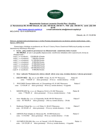 Mazowieckie Centrum Leczenia Chorób Płuc i Gruźlicy ul. Narutowicza 80, 05-400 Otwock, tel. (22) 344 64 00, 344 64 71, FAX (22) 344-64-74, centr. (22) 344 62 00 http://www.otwock-szpital.pl e-mail:[email protected] MCLChPiG –Gr.IV A/20PN/2016 Otwock, dn. 21.10.2016r Dotyczy :postępowania przetargowego w trybie Przetarg nieograniczony na dostawę sprzętu medycznego, znak Sprawy 20PN/2016 Zamawiający działając na podstawie art. 86 ust.5 Ustawy Prawo Zamówień Publicznych podaje na stronie internetowej informacje dotyczące : • kwoty , jaką zamierza przeznaczyć na sfinansowanie zamówieni, która wynosi: 382 500,00zł ,w tym w przypadku dopuszczenia możliwości składania ofert częściowych, kwotę na sfinansowanie : część 1 w wysokości . 120.000,00 zł brutto część 2 w wysokości . 7 000,00 zł brutto część 3 w wysokości . 14 500,00zł brutto część 4 w wysokości . 8 000,00zł brutto część 5 w wysokości . 35 000,00zł brutto część 6 w wysokości . 50 000,00zł brutto część 7 w wysokości . 140 000,00zł brutto część 8 w wysokości . 8 000,00zł brutto • 1. 2. firm i adresów Wykonawców, którzy złożyli oferty oraz ceny, terminu dostawy i okresu gwarancji : ASCOR MED Sp. z o. o. al. KEN 18 lok. 38, 02-797 Warszawa Pakiet D cena - 7 020,00 zł okres gwarancji – 24 m-ce termin dostawy – 14 dni POLYMED Tomasz Idźkowski, ul. Żeromskiego 45, 01-882 Warszawa cena - 12 636,00 zł okres gwarancji – 60 m-cy; termin dostawy –6 tygodni Pakiet C 3. MEDITRADE Sp. z o.o. ul. Okopowa 56 kl.A, 01-042 Warszawa cena – 7 786,00 zł okres gwarancji – 12 m-cy; termin dostawy – 5 dni Pakiet B 4. Areo -Medika Sp. z o.o. ul. Kopernika 36/40, 00-924 Warszawa cena - 50 760,00 zł okres gwarancji – 24m-ce; termin dostawy – 20 dni Pakiet F 5. Medtronic Poland Sp. z o. o. ul. Polna 11, 00-633 Warszawa cena – 44 424,00 zł okres gwarancji – 24 m-cy; termin dostawy – 14 dni Pakiet F 6. ABINOX Piotr Szłapka ul. Słoneczna 98, 64-000 Kiełczewo cena - 6 334,50zł okres gwarancji – 60 m-cy; termin dostawy – 13 dni 7 OLYMPUS POLSKA Sp. z o.o. ul. Suwak 3, 02-676 Warszawa Pakiet A cena - 124 255,08 zł okres gwarancji – 36 m-cy; termin dostawy – 6 tygodni Pakiet C 8 GETINGE Poland Sp. z o.o. ul. Osmańska 14, 02-823 Warszawa cena - 33 853,00 zł okres gwarancji – 24m-ce ; termin dostawy – 6 tygodni 9 Przedsiębiorstwo Handlowo-Usługowe SELMA IMPORT -EXPORT Anna Selma 02-716 Warszawa, ul. Cieszyńska 4 lok.85 Pakiet H cena - 7 995,00 zł okres gwarancji – 24m-ce ; termin dostawy – 6 tygodni 10 Multimed Sp. z o. o. ul. Brukowa 6, 91-341 Łódź cena - 139 629,60 zł okres gwarancji – 24m-ce ; termin dostawy – 6 tygodni Do wiadomości : strona internetowa Zamawiającego www.otwock-szpital.pl Pakiet E Pakiet G