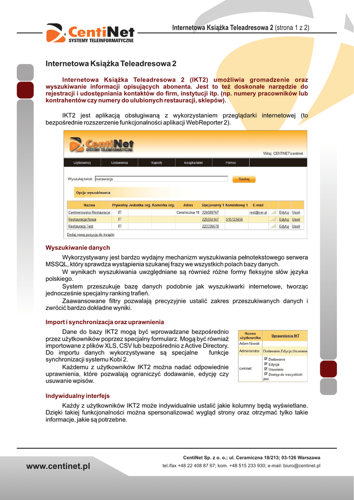 Internetowa Książka Teleadresowa 2 (strona 1 z 2) Internetowa Książka Teleadresowa 2 Internetowa Książka Teleadresowa 2 (IKT2) umożliwia gromadzenie oraz wyszukiwanie informacji opisujących abonenta. Jest to też doskonałe narzędzie do rejestracji i udostępniania kontaktów do firm, instytucji itp. (np. numery pracowników lub kontrahentów czy numery do ulubionych restauracji, sklepów). IKT2 jest aplikacją obsługiwaną z wykorzystaniem przeglądarki internetowej (to bezpośrednie rozszerzenie funkcjonalności aplikacji WebReporter 2). Wyszukiwanie danych Wykorzystywany jest bardzo wydajny mechanizm wyszukiwania pełnotekstowego serwera MSSQL, który sprawdza wystąpienia szukanej frazy we wszystkich polach bazy danych. W wynikach wyszukiwania uwzględniane są również różne formy fleksyjne słów języka polskiego. System przeszukuje bazę danych podobnie jak wyszukiwarki internetowe, tworząc jednocześnie specjalny ranking trafień. Zaawansowane filtry pozwalają precyzyjnie ustalić zakres przeszukiwanych danych i zwrócić bardzo dokładne wyniki. Import i synchronizacja oraz uprawnienia Dane do bazy IKT2 mogą być wprowadzane bezpośrednio przez użytkowników poprzez specjalny formularz. Mogą być równiaż importowane z plików XLS, CSV lub bezpośrednio z Active Directory. Do importu danych wykorzystywane są specjalne funkcje synchronizacji systemu Kobi 2. Każdemu z użytkowników IKT2 można nadać odpowiednie uprawnienia, które pozwalają ograniczyć dodawanie, edycję czy usuwanie wpisów. Indywidualny interfejs Każdy z użytkowników IKT2 może indywidualnie ustalić jakie kolumny będą wyświetlane. Dzięki takiej funkcjonalności można spersonalizować wygląd strony oraz otrzymać tylko takie informacje, jakie są potrzebne. CentiNet Sp. z o. o.; ul. Ceramiczna 18/213; 03-126 Warszawa www.centinet.pl tel./fax +48 22 408 87 67; kom. +48 515 233 930; e-mail: [email protected] Internetowa Książka Teleadresowa 2 (strona 2 z 2) Architektura i uniwersalność systemu Baza IKT2 udostępnia kilkadziesiąt parametrów, wśród nich między innymi: nazwę, imię i nazwisko, instytucję, departament, MPK (miejsca powstawania kosztów) itp. Wpisom można nadać jeden ze statusów: prywatny lub publiczny. Status publiczny oznacza czy wpis będzie widoczny dla innych użytkowników IKT2. Dostęp do danych IKT2 możliwy jest jedynie dla członków specjalnej, uprawnionej grupy. Autoryzacja użytkownika zintegrowana jest z Active Directory lub przez podanie indywidualnego hasła. Funkcje zewnętrzne Pola specjalne IKT2 posiadają przypisane funkcje, które jednym kliknięciem pozwalają wysłać wiadomość e-mail czy też zestawić połączenie telefoniczne korzystając z aparatów Cisco, Avaya, softphonów lub Skype. Intergracja z urządzeniami Internetową Książkę Teleadresową 2 integrować można z Cisco CallManager co pozwala bazę danych IKT2 wykorzystać jako prywatną książkę telefoniczną CCM w celu wyświetlania i przeszukiwania informacji z poziomu aparatu telefonicznego. CentiNet Sp. z o. o.; ul. Ceramiczna 18/213; 03-126 Warszawa www.centinet.pl tel./fax +48 22 408 87 67; kom. +48 515 233 930; e-mail: [email protected]