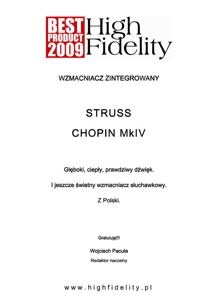 WZMACNIACZ ZINTEGROWANY STRUSS CHOPIN MkIV Głęboki, ciepły, prawdziwy dźwięk. I jeszcze świetny wzmacniacz słuchawkowy. Z Polski. Gratuluję!!! Gratuluję!!! Wojciech Pacuła Redaktor naczelny www.highfidelity.pl 2009-06-17 Struss Chopin Mk IV Wzmacniacz STRUSS Chopin ma siedmioletnią tradycję. Pierwszy test wzmacniacza został umieszczony w miesięczniku „Audio-Video” 6/2002 (test przeprowadzony przez red. Ludwika Igielskiego). Do 2009 roku powstawały następne edycje. Czwarta, MK IV została powierzona do testu w 2008 roku. Test ukazał się w „Audio-Video” 10/2008 (test przeprowadzony przez red. naczelnego Filipa Kulpę). Sugestie wynikające z testu w „Audio-Video” 10/2008 zaowocowały wprowadzeniem w 2009 roku szeregu zmian w mechanicznej budowie wzmacniacza jak i torze sygnałowym. Zmiany mechaniczne to: 1.Zmiana zacisków głośnikowych 2.Zmiana transformatorów (nowe posiadają najwyŜszego gatunku duńskie rdzenie) 3.Usztywniono konstrukcję przez dodanie miedzianych wkładów pod transformatory Zmiany w torze sygnałowym to: 1. Zmiana przewodu sygnałowego pomiędzy selektorem wejść a potencjometrem na Gotham GAC1. 2. Zmiana potencjometru volume na Alps Blue Velvet. 3. Zmiana kondensatorów elektrolitycznych na ekskluzywne Jamicony for audio – HT105, 835k0(M), 4x22000 µF. 4. Zmodyfikowano wzmacniacz słuchawkowy (dostosowany do pracy ze słuchawkami o niskich impedancjach). 5. Wprowadzono korekty we wzmacniaczu gramofonowym MM. 6. Zwiększono prąd spoczynkowy tranzystorów wyjściowych. 7. Skrócono ścieŜki wyprowadzeń do głośników o ½. Wszystkie zmiany spowodowały usunięcie drobnych uwag opisanych w teście w „Audio-Video” 10/2008. Uległy zmianie parametry wzmacniacza: Moc wyjściowa: 2x105 VA/8 Ohm, 2x195 VA/4 Ohm Pasmo przenoszenia: 10 Hz – 150 kHz Czułość wejść: 325 mV - wejścia liniowe (4), 2,5 mV - wejście "phono" MM Dynamika: 130 dB Masa netto: 14,5 kg Ponadto od stycznia 2009 w firmie STRUSS AMPLIFIERS pojawiła się nowa osoba - Jacek HrynkiewiczStruss (36 letni syn Zdzisława Hrynkiewicz-Struss). Syn przejął produkcję i marketing. W związku z tym produkcja została przeniesiona do Bielska-Białej. Zdzisław Hrynkiewicz-Struss zajmuje się opracowywaniem nowych konstrukcji oraz serwisem. Cena: 13400 zł Źródło: Struss © Copyright HIGH Fidelity 2009, Created by B