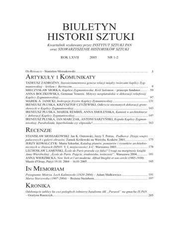 BIULETYN HISTORII SZTUKI Kwartalnik wydawany przez INSTYTUT SZTUKI PAN oraz STOWARZYSZENIE HISTORYKÓW SZTUKI ROK LXVII 2005 NR 1-2 OD REDAKCJI Stanis³aw Mossakowski............................................................................................ ARTYKU£Y I KOMUNIKATY 5 TADEUSZ ZADRO¯NY, Starotestamentowa geneza relacji miêdzy twórcami kaplicy Zygmuntowskiej królem i Berreccim............................................................................................ 9 MIECZYS£AW MORKA, Kaplica Zygmuntowska. Król Salomon princeps fundator......... 59 ANNA BOCZKOWSKA, Geminae Veneres. Motywy neoplatoñskie w dekoracji reliefowej Kaplicy Zygmuntowskiej............................................................................................................ 97 MAREK A. JANICKI, Inskrypcje fryzów Kaplicy Zymuntowskiej........................................... 131 IRENEUSZ P£USKA, KRZYSZTOF CZY¯EWSKI, Odkrycie nieznanych dekoracji groteskowych w Kaplicy Zygmuntowskiej.......................................................................................... 143 IRENEUSZ P£USKA, MAREK REMBI, ANNA SMOLEÑSKA, Kamieñ w architekturze i dekoracji Kaplicy Zygmuntowskiej......................................................................................... 147 IRENEUSZ P£USKA, JAN MARCZAK, ANTONI SARZYÑSKI, Kopu³a Kaplicy Zygmuntowskiej. Paraboloida, hiperboloida czy elipsoida?.................................................................. 163 RECENZJE STANIS£AW MOSSAKOWSKI: Jan K. Ostrowski, Jerzy T. Petrus, Podhorce. Dzieje wnêtrz pa³acowych i galerii obrazów, Zamek Królewski na Wawelu, Kraków 2001........................... 175 JERZY KOWALCZYK: Maria Szkur³at, Katalog planów, pomiarów i rysunków architektonicznych w zbiorach ISPAN. T. I, miejscowoci A-C. Warszawa 2003...................................... 178 LECHOS£AW LAMEÑSKI, École de Paris prawda czy fa³sz? Uwagi na marginesie ksi¹¿ki Anny Wierzbickiej École de Paris. Pojêcie, rodowisko, twórczoæ, Warszawa 2004............. 181 ANNA WIERZBICKA, New York et lart moderne. Alfred Stieglitz et son cercle (1905-1930). Musée dOrsay, Pary¿ 19.10. 2004 16.01 2005......................................................................... 185 IN MEMORIAM Po¿egnanie Mistrza. Lech Kalinowski (1920-2004) Adam Ma³kiewicz................................ 191 Maria Starzewska (1907-2004) Bo¿ena Steinborn................................................................. 197 KRONIKA Ods³oniêcie tablicy ku czci poleg³ych ¿o³nierzy batalionu AK Parasol na gmachu IS PAN – Gra¿yna Ruszczyk................................................................................................................... 205 LISTY DO REDAKCJI W sprawie listu Witalisa Wolnego Izabella Galicka, Hanna Sygietyñska.............................. W sprawie nekrologu Adama Mi³obêdzkiego autorstwa Marty Leniakowskiej El¿bieta Gieysztor-Mi³obêdzka............................................................................................................... Przeciw wydawniczemu nadu¿yciu Ewa Chojecka................................................................ List Zarz¹du G³ównego Stowarzyszenia In¿ynierów i Techników Przemys³u Hutniczego w Polsce..................................................................................................................................... 209 211 215 215 BULLETIN OF ART HISTORY A quarterly published by the INSTITUTE OF ART HISTORY OF THE POLISH ACADEMY OF SCIENCES (IS-PAN) in conjunction with the ART HISTORIANS’ SOCIETY YEAR LXVII 2005 No.1-2 FROM THE EDITORIAL-STAFF Stanis³aw Mossakowski................................................................ 5 ARTICLES TADEUSZ ZADRO¯NY, The Old-Testament Genesis of the relations between the creators of the Sigismund Chapel: King Sigismund I and Bartolomeo Berrecci..................................... 9 MIECZYS£AW MORKA, The Sigismund Chapel. King Solomon, princeps fundator............. 59 ANNA BOCZKOWSKA, Geminae Veneres. Neo-Platonic Motifs in the Relief Decoration of the Sigismund Chapel............................................................................................................. 97 MAREK A. JANICKI, Inscriptions of the Friezes in the Sigismund Chapel............................ 131 IRENEUSZ P£USKA, KRZYSZTOF CZY¯EWSKI, Discovery of Grotesque Decorations in the Sigismund Chapel............................................................................................................. 143 IRENEUSZ P£USKA, MAREK REMBI, ANNA SMOLEÑSKA, Stone in the Architecture and Decoration of the Sigismund Chapel next to the Wawel................................ 147 IRENEUSZ P£USKA, JAN MARCZAK, ANTONI SARZYÑSKI, Cupola of the Sigismund Chapel: paraboloid, hyperboloid or ellipsoid?......................................................................... 163 REVIEWS STANIS£AW MOSSAKOWSKI: Jan K. Ostrowski, Jerzy T. Petrus, Podhorce. Dzieje wnêtrz pa³acowych i galerii obrazów, Zamek Królewski na Wawelu, Kraków 2001........................... 175 JERZY KOWALCZYK: Maria Szkur³at, Katalog planów, pomiarów i rysunków architektonicznych w zbiorach IS PAN, (Catalogue of maps, scale diagrams and architectural drawings in the collections of IS PAN), Vol I, place names A-C, Warszawa 2003................................... 178 LECHOS£AW LAMEÑSKI, École de Paris prawda czy fa³sz? Uwagi na marginesie ksi¹¿ki Anny Wierzbickiej École de Paris. Pojêcie, rodowisko, twórczoæ, (École de Paris, true or false? Comments in the margin of Anna Wierzbickas monograph, École de Paris. Concept, milieu, creative work), Warszawa 2004.................................................................................... 181 ANNA WIERZBICKA, New York et lart moderne. Alfred Stieglitz et son cercle (1905-1930). Musée dOrsay, Pary¿ 19.10. 2004 16.01 2005........................................................................ 185 IN M