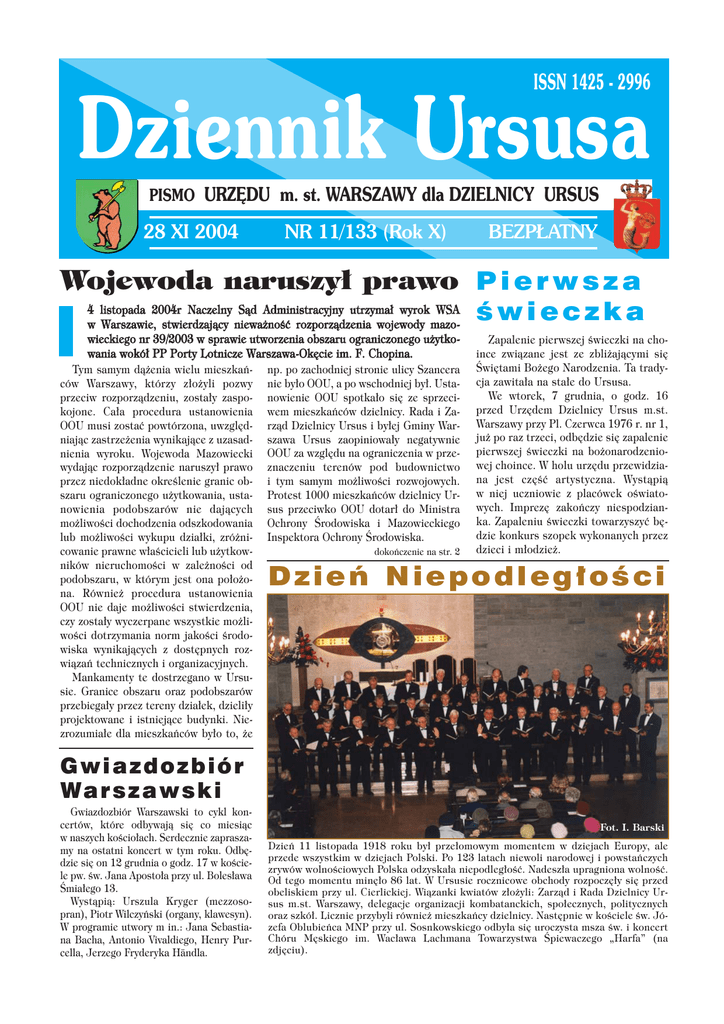 ISSN 1425 - 2996 Dziennik Ursusa PISMO URZĘDU m. st. WARSZAWY dla DZIELNICY URSUS 28 XI 2004 NR 11/133 (Rok X) BEZPŁATNY Wojewoda naruszył prawo P i e r w s z a 4 listopada 2004r Naczelny Sąd Administracyjny utrzymał wyrok WSA œwieczka w Warszawie, stwierdzający nieważność rozporządzenia wojewody mazowieckiego nr 39/2003 w sprawie utworzenia obszaru ograniczonego użytkowania wokół PP Porty Lotnicze Warszawa-Okęcie im. F. Chopina. Tym samym dążenia wielu mieszkańców Warszawy, którzy złożyli pozwy przeciw rozporządzeniu, zostały zaspokojone. Cała procedura ustanowienia OOU musi zostać powtórzona, uwzględniając zastrzeżenia wynikające z uzasadnienia wyroku. Wojewoda Mazowiecki wydając rozporządzenie naruszył prawo przez niedokładne określenie granic obszaru ograniczonego użytkowania, ustanowienia podobszarów nie dających możliwości dochodzenia odszkodowania lub możliwości wykupu działki, zróżnicowanie prawne właścicieli lub użytkowników nieruchomości w zależności od podobszaru, w którym jest ona położona. Również procedura ustanowienia OOU nie daje możliwości stwierdzenia, czy zostały wyczerpane wszystkie możliwości dotrzymania norm jakości środowiska wynikających z dostępnych rozwiązań technicznych i organizacyjnych. Mankamenty te dostrzegano w Ursusie. Granice obszaru oraz podobszarów przebiegały przez tereny działek, dzieliły projektowane i istniejące budynki. Niezrozumiałe dla mieszkańców było to, że np. po zachodniej stronie ulicy Szancera nie było OOU, a po wschodniej był. Ustanowienie OOU spotkało się ze sprzeciwem mieszkańców dzielnicy. Rada i Zarząd Dzielnicy Ursus i byłej Gminy Warszawa Ursus zaopiniowały negatywnie OOU za względu na ograniczenia w przeznaczeniu terenów pod budownictwo i tym samym możliwości rozwojowych. Protest 1000 mieszkańców dzielnicy Ursus przeciwko OOU dotarł do Ministra Ochrony Środowiska i Mazowieckiego Inspektora Ochrony Środowiska. dokończenie na str. 2 Zapalenie pierwszej świeczki na choince związane jest ze zbliżającymi się Świętami Bożego Narodzenia. Ta tradycja zawitała na stałe do Ursusa. We wtorek, 7 grudnia, o godz. 16 przed Urzędem Dzielnicy Ursus m.st. Warszawy przy Pl. Czerwca 1976 r. nr 1, już po raz trzeci, odbędzie się zapalenie pierwszej świeczki na bożonarodzeniowej choince. W holu urzędu przewidziana jest część artystyczna. Wystąpią w niej uczniowie z placówek oświatowych. Imprezę zakończy niespodzianka. Zapaleniu świeczki towarzyszyć będzie konkurs szopek wykonanych przez dzieci i młodzież. Dzieñ Niepodleg³oœci Gwiazdozbiór Warszawski Gwiazdozbiór Warszawski to cykl koncertów, które odbywają się co miesiąc w naszych kościołach. Serdecznie zapraszamy na ostatni koncert w tym roku. Odbędzie się on 12 grudnia o godz. 17 w kościele pw. św. Jana Apostoła przy ul. Bolesława Śmiałego 13. Wystąpią: Urszula Kryger (mezzosopran), Piotr Wilczyński (organy, klawesyn). W programie utwory m in.: Jana Sebastiana Bacha, Antonio Vivaldiego, Henry Purcella, Jerzego Fryderyka Händla. Fot. I. Barski Dzień 11 listopada 1918 roku był przełomowym momentem w dziejach Europy, ale przede wszystkim w dziejach Polski. Po 123 latach niewoli narodowej i powstańczych zrywów wolnościowych Polska odzyskała niepodległość. Nadeszła upragniona wolność. Od tego momentu minęło 86 lat. W Ursusie rocznicowe obchody rozpoczęły się przed obeliskiem przy ul. Cierlickiej. Wiązanki kwiatów złożyli: Zarząd i Rada Dzielnicy Ursus m.st. Warszawy, delegacje organizacji kombatanckich, społecznych, politycznych oraz szkół. Licznie przybyli również mieszkańcy dzielnicy. Następnie w kościele św. Józefa Oblubieńca MNP przy ul. Sosnkowskiego odbyła się uroczysta msza św. i koncert Chóru Męskiego im. Wacława Lachmana Towarzystwa Śpiewaczego „Harfa” (na zdjęciu). II Dziennik Wojewoda naruszył prawo dokończenie ze str. 1 Na spotkaniu zorganizowanym przez Radę i Zarząd Dzielnicy Ursus z przedstawicielami: PP „Porty Lotnicze”, Wojewody Mazowieckiego i Urzędu m. st. Warszawy, które odbyło się w „Arsusie”, w październiku ubiegłego roku, dyrektor Biura OOU PP „PL” Tomasz Szawłowski zapewniał przybyłych ok. 1000 mieszkańców Ursusa, że będą wypłacane odszkodowania w związku ze spadkiem cen nieruchomości i zastosowaniem zabezpieczeń akustycznych takich jak: okna, drzwi, ściany i stropy o zwiększonej izolacyjności. Zachęcał do składania wniosków, nawet przez lokatorów nie będących właścicielami nieruchomości. Odzew mieszkańców był masowy. W Urzędzie Dzielnicy udostępniono wnioski, zapewniono pomoc przy ich wypełnianiu. Jak się dowiedzieliśmy, w pierwszym roku ustanowienia OOU z całej Warszawy złożono powyżej 2000 wniosków. Wnioski z Ursusa stanowiły około 25 % ich ogólnej liczby. Jest to sukces w dotarciu do świadomości ludzi, tym bardziej, że szacowano liczbę wniosków z Warszawy na 10000. PP „Porty Lotnicze” jednak płacić nie zamierzały. I to w całym OOU. W jednakowo brzmiących odpowiedziach odmawiały wykupu lub wypłaty odszkodowania na podstawie przepisów rozporządzenia wojewody mazowieckiego nr 39/2003 i kierowały wnioskodawców na drogę składania pozwów w sądach cywilnych. Jedną z takich odpowiedzi możemy przeczytać na tablicach ogłoszeniowych RSM-u. Zawsze w rozporządzeniu znajdował się punkt, który pozwalał wykpić się od odszkodowania. Obecnie należy się spodziewać, że wszyscy, którzy złożyli wnioski dostaną zawiadomienia z PP „Porty Lotnicze”, że w związku z nieważnością rozporządzenia nr 39/2003 nie będą one rozpatrywane i ulegną archiwizacji. Czy będą mogły być wykorzystane, czy będzie trzeba złożyć tylko uzupełnienia czy całkiem nowe, odpowie na to rozporządzenie wojewody. Również Ci, którzy uzyskali decyzje o warunkach zabudowy i zagospodarowania terenu lub pozwolenia