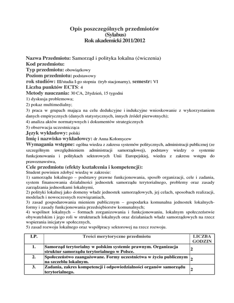 Opis poszczególnych przedmiotów (Sylabus) Rok akademicki 2011/2012 Nazwa Przedmiotu: Samorząd i polityka lokalna (ćwiczenia) Kod przedmiotu: Typ przedmiotu: obowiązkowy Poziom przedmiotu: podstawowy rok studiów: III/studia I-go stopnia (tryb stacjonarny), semestr: VI Liczba punktów ECTS: 4 Metody nauczania: 30 CA, 2/tydzień, 15 tygodni 1) dyskusja problemowa; 2) pokaz multimedialny; 3) praca w grupach mająca na celu dedukcyjne i indukcyjne wnioskowanie z wykorzystaniem danych empirycznych (danych statystycznych, innych źródeł pierwotnych); 4) analiza aktów normatywnych i dokumentów strategicznych 5) obserwacja uczestnicząca Język wykładowy: polski Imię i nazwisko wykładowcy: dr Anna Kołomycew Wymagania wstępne: ogólna wiedza z zakresu systemów politycznych, administracji publicznej (ze szczególnym uwzględnieniem administracji samorządowej), podstawy wiedzy o systemie funkcjonowania i politykach sektorowych Unii Europejskiej, wiedza z zakresu wstępu do prawoznawstwa, Cele przedmiotu (efekty kształcenia i kompetencji): Student powinien zdobyć wiedzę w zakresie: 1) samorządu lokalnego – podstawy prawne funkcjonowania, sposób organizacji, cele i zadania, system finansowania działalności jednostek samorządu terytorialnego, problemy oraz zasady zarządzania jednostkami lokalnymi, 2) polityki lokalnej jako domeny władz jednostek samorządowych, jej celach, sposobach realizacji, modelach i nowoczesnych rozwiązaniach, 3) zasad gospodarowania mieniem publicznym – gospodarka komunalna jednostek lokalnychformy i zasady funkcjonowania przedsiębiorstw komunalnych; 4) wspólnot lokalnych – formach zorganizowania i funkcjonowaniu, lokalnym społeczeństwie obywatelskim i jego roli w strukturach lokalnych oraz działaniach władz samorządowych na rzecz wspierania inicjatyw społecznych, 5) zasad rozwoju lokalnego oraz współpracy sektorowej na rzecz rozwoju. LP. 1. 2. 3. Treści merytoryczne przedmiotu LICZBA GODZIN Samorząd terytorialny w polskim systemie prawnym. Organizacja 2 struktur samorządu terytorialnego w Polsce. Społeczeństwo zaangażowane. Formy uczestnictwa w życiu publicznym 2 na szczeblu lokalnym. Zadania, zakres kompetencji i odpowiedzialności organów samorządu 2 terytorialnego. 4. 5. Akty prawa miejscowego w hierarchii źródeł prawa powszechnie obowiązującego. Podmioty, rodzaje, specyfika i procedura uchwalania 2 aktów prawa miejscowego. Polityka społeczna jako polityka sektorowa szczebla lokalnego. Zakres zadań i kompetencje władz samorządowych w zakresie polityki 2 społecznej. 6. System finansowania działalności jednostek samorządu terytorialnego. Budżet jednostki samorządowej – struktura i procedura uchwalania. 4 Podatki i opłaty lokalne. 7. Gospodarka komunalna – zakres i specyfika zadań. 8. Działalność gospodarcza jednostek samorządu terytorialnego. 2 2 9. Nadzór i kontrola nad jednostkami samorządu terytorialnego. Kryteria 2 i zakres działań kontrolnych. 10. Rozwój społeczno-gospodarczy jednostek terytorialnych. Czynniki i instrumenty rozwoju na szczeblu lokalnym i regionalnym. 2 11. Zarządzanie procesami rozwoju w jednostkach samorządu terytorialnego. 2 12. Programy i strategie rozwoju lokalnego i regionalnego. Rola i znaczenie 2 instrumentów planistycznych w rozwoju jednostek terytorialnych. 13. Współpraca jednostek samorządu terytorialnego. Formy, możliwości i bariery współpracy. 14. Międzynarodowe kontakty samorządów oraz współpraca sektorowa na szczeblu lokalnym. 2 2 Metody oceny: - aktywne uczestnictwo w zajęciach, - uzyskanie pozytywnych ocen z testów sprawdzający wiadomości (sesja letnia) Spis zalecanych lektur: Literatura podstawowa: Dolnicki B., Samorząd terytorialny, Wolters Kluwer, Warszawa 2009. Gospodarka regionalna i lokalna, red. Z. Strzelecki, PWN, Warszawa 2008. Izdebski H., Samorząd terytorialny. Podstawy ustroju i działania, LexisNexis, Warszawa 2006. Leoński Z.: Samorząd terytorialny w RP, wyd. C.H. Beck, Warszawa 2006. Miszczuk A., Miszczuk M., Żuk K., Gospodarka samorządu terytorialnego, Wyd. Naukowe PWN, Warszawa 2007. Miszczuk M., System podatków i opłat samorządowych w Polsce, Wydawnictwo C.H. Beck, Warszawa 2009. Piasecki A.K., Samorząd terytorialny i wspólnoty lokalne, PWN, Warszawa 2009. Polityka lokalna, właściwości, determinanty, podmioty, red. E. Ganowicz, L. Rubisz, Wydawnictwo Adam Marszałek, Toruń 2008. Swianiewicz P., Finanse samorządowe. Koncepcje, realizacja, polityki lokalne, Municipium 2011. Zawicki M., Nowe zarządzanie publiczne, Polskie Wydawnictwo Ekonomiczne 2011. Literatura uzupełniająca: Borodo A., Samorząd terytorialny. System prawno-finansowy, LexisNexis, Warszawa 2004. Chmielnicki P., Świadczenie usług przez samorząd terytorialny w Polsce. Zagadnienia ustrojowoprawne, Municipium, Warszawa 2005. Finanse samorządowe: narzędzia, decyzje, procesy, M. Dylewski, B. Filipiak, M. GorzałczyńskaKoczkodaj, PWN, Warszawa 2006. Kańduła S., Przybylska J., Organizacja działalności gospodarczej samorządu terytorialnego w Polsce, Wydawnictwo Akademii Ekonomicznej w Poznaniu, Poznań 2008. Leoński Z., Samorząd terytorialny w RP, wyd. C.H. Beck, Warszawa 2006. Ofiarska M., Formy publicznoprawne współdziałania jednostek samorządu terytorialnego, Wydawnictwo C.H. Beck, Warszawa 2008. Pająk K., Samorząd terytorialny i jego wewnętrzna transformacja, Wydawnictwo Adam Marszalek, Toruń 2007. Polityka społeczna. Podręcznik akademicki, red. G. Firlit-Fesnak, M. Szylko-Skoczny, PWN, Warszawa 2007. Potoczek A., Jachowicz S., Administracja publiczna w procesie zarządzania rozwojem lokalnym i regionalnym, Wydawnictwo Wyższej Szkoły Suwalsko-Mazurskiej im. Papieża Jana Pawła II w Suwałkach, Toruń – Warszawa 2005. Samorząd lokalny w Polsce. Społeczno-polityczne aspekty funkcjonowania, red. S. Michałowski, A. Pawłowska, Wydawnictwo UMCS, Lublin 2004. Samorząd w Polsce. Istota, formy, zadania, red. S. Wykręt