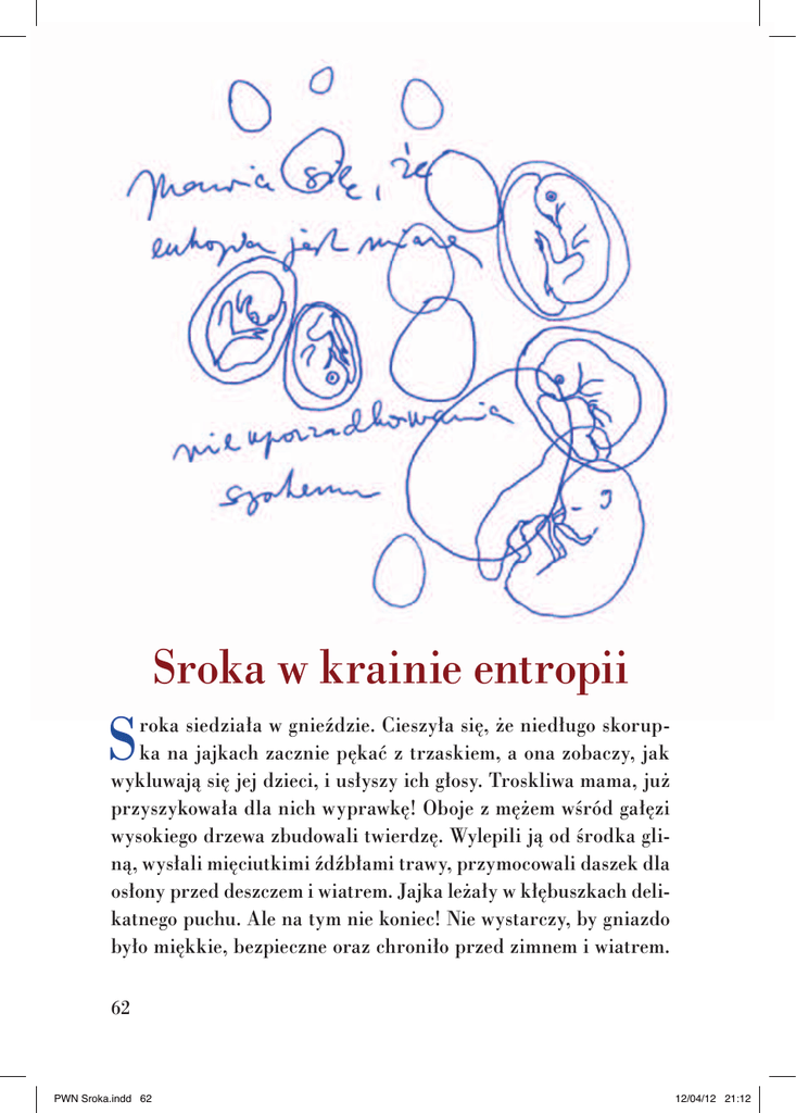 S Sroka w krainie entropii roka siedziała w gnieździe. Cieszyła się, że niedługo skorupka na jajkach zacznie pękać z trzaskiem, a ona zobaczy, jak wykluwają się jej dzieci, i usłyszy ich głosy. Troskliwa mama, już przyszykowała dla nich wyprawkę! Oboje z mężem wśród gałęzi wysokiego drzewa zbudowali twierdzę. Wylepili ją od środka gliną, wysłali mięciutkimi źdźbłami trawy, przymocowali daszek dla osłony przed deszczem i wiatrem. Jajka leżały w kłębuszkach delikatnego puchu. Ale na tym nie koniec! Nie wystarczy, by gniazdo było miękkie, bezpieczne oraz chroniło przed zimnem i wiatrem. 62 PWN Sroka.indd 62 12/04/12 21:12 Musi też być ładne! Sroka dała upust swej artystycznej naturze i na ścianach porozwieszała różne ozdoby, które miały nauczyć jej dzieci miłości do piękna. Ach! Przyszła matka rozmarzyła się, patrząc na stworzone przez siebie wnętrze. Po prawej stronie, pomiędzy splecionymi gałązkami, tkwił w ścianie złamany guzik, który mienił się przepięknie w promieniach słońca. Na lewo błyszczała gwiazda wybita na rewersie jakiejś monety. Z przodu połyskiwał klucz w ramce z kilku niedopałków, a po przeciwnej stronie lśniło sreberko z wieczka od jogurtu. W gnieździe było mnóstwo przedmiotów o najwyższym poziomie artystycznym. W czasie swoich podróży państwo srokostwo widzieli wiele różnych gniazd – zdarzało im się wybierać z nich jajka – ale żadne z nich nie było urządzone z takim przepychem. Dzięki temu sroki doszły do wniosku, iż wśród ptactwa znajdują się na najwyższym szczeblu rozwoju, jako że przedstawiciele innych gatunków nie mieli takiego zamiłowania do sztuki oraz wyczucia stylu. Matka poruszyła się na jajkach. Zdrętwiała jej noga? Nie, to drgnęło jedno jajko… Czyżby? Tak! Po drugiej stronie już stuka w skorupkę malutki słodki dziobek! Nie minęło wiele czasu, a młode były na świecie. Piątka roz szczebiotanych piskląt z wiecznie rozdziawionymi dziobami. Pożywienie, które znosili im rodzice po kilka razy na godzinę, znikało w nich jak w przepastnych dziurach. Do tego maluchy robiły w gnieździe straszny bałagan. Małe dzieci – radość, ale i kłopot. Wkrótce sroki poczuły, że są tym wszystkim zmęczone. Mieć takie rozkoszne maleństwa to piękna rzecz, ale z drugiej strony – mamie i tacie tak mało czasu zostaje na własne życie! Cały dzień nic tylko latają w poszukiwaniu czegoś do jedzenia, a kiedy wieczorem małe oczka i dzioby nareszcie się zamykają, zmęczeni rodzice ledwie z grubsza posprzątają gniazdo, a potem od razu padają na posłania. 63 PWN Sroka.indd 63 12/04/12 21:12 – Słuchaj – powiedział tato pewnego wieczoru – tak dalej być nie może. Jak długo jeszcze te nasze pociechy będą małe? – Nie wiem – odpowiedziała mama. – Ale… takie z nich rozkoszne berbecie… – Może i rozkoszne – rzucił tato. – Ale są też męczące. Ciągle piszczą i wołają jeść, są nienażarte! – Nie wiedziałeś tego, kiedy się ze mną żeniłeś? – odparowała mama. – Że dzieci to radość, ale i kłopot? – Z tobą się żeniłem, nie z… – warknął tato. Mama zdrętwiała. – Co chcesz przez to powiedzieć? Że nie kochasz naszych dzieci? – Ależ kocham! Ale kochałbym je jeszcze bardziej, gdyby dały mi trochę odetchnąć! – To co mam zrobić? – zirytowała się mama. – Wpakować je z powrotem do jajek? Masz dzieci, więc jesteś za nie odpowiedzialny. Ciesz się, że są takie udane! Tatuś spróbował mamę ugłaskać: – Ja wiem… Kocham nasze pisklęta i jestem z nich dumny. Ale przecież od czasu do czasu moglibyśmy wziąć do nich nianię i gdzieś wyskoczyć tylko we dwoje! Nikomu by to nie zaszkodziło, prawda? Mama przyznała mu rację. Też była zmęczona dzieciakami, więc następnego dnia dali ogłoszenie do gazety: „Szukamy dobrej i ofiarnej niani na krótki czas do małych sroczątek i sprzątania gniazda. Oferty ze zwięzłym życiorysem proszę przysyłać na nasz adres. Sroki”. Tatuś w biurze podróży wykupił wycieczkę i oboje z mamą już cieszyli się na myśl o tym, że nareszcie odpoczną sobie bez dzieci. Sroka wiedziała, że będzie tęsknić do małych. Nawet gdyby wyjechali z mężem na najpiękniejszą nadmorską plażę, wszędzie będzie widzieć ich oczka, a każdy dźwięk przypomni jej ich popiskiwanie. A kiedy 64 PWN Sroka.indd 64 12/04/12 21:12 wieczorem tatuś przyniósł kopertę pełną odpowiedzi na ogłoszenie, pomyślała sobie: „Może lepiej nie jechać na żaden urlop?…”. Pan sroka usiadł na gałęzi i zaczął czytać: – Posłuchaj. Ta niania ma podobno kilkuletnią praktykę. Zainteresowania: przyroda, sport i taniec. Chętnie opowiada bajki, prowadzi zabawy ruchowe dla piskląt. Lubi sprzątać. Pasowałaby, prawda? – Hm… brzmi nieźle. A następna? Tatuś odwrócił kartkę. – Ta druga jest podobno starsza i bardziej doświadczona. Uwielbia pisklątka. Gniazdo wyczyści dokładnie. – Tatuś podniósł wzrok znad kartki: – Też dobra? – Mogłaby być… – Mama się zamyśliła. – Jak się nazywa i skąd pochodzi? – Mieszka w pobliskiej wiosce, a nazywa się kuna Karolina. – Kuna Karolina?! – wykrzyknęła mama. – Tak jest napisane… – Żadna kuna nie będzie opiekować się naszymi dziećmi! To by dopiero było! – Faktycznie – przytaknął tatuś. – Nie bardzo pasuje. – A ta pierwsza? – Ta pierwsza się nazywa… – Tatuś przewracał kartki – …Kizia Mizia. – No nie, Kizia Mizia! – zawołała mama. – Przenigdy! Zostawiłaby nam w gnieździe tylko parę piórek na pamiątkę! – To prawda – przyznał tato skruszony i dalej przeglądał papiery. – Mam tu jeszcze jedną… Lubi sport i książki… – Nie chcę tego słuchać! – przerwała mama. – Czytaj ich imiona. – Dobrze, chwileczkę – wyjąkał tatuś. – A więc… jest tu jeszcze lisica Sylwia, to chyba te