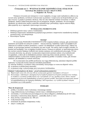 Ćwiczenie nr 2 – WYZNACZANIE GĘSTOŚCI CIAŁ STAŁYCH Instrukcja dla studenta Ćwiczenie nr 2 – WYZNACZANIE GĘSTOŚCI CIAŁ STAŁYCH Instrukcja dla studenta (wersja z dnia 8 X 2016) A. Majhofer i R. Nowak, Niniejsze ćwiczenie jest nietypowe w tym względzie, że jego część rachunkowa odbywa się na tym samy spotkaniu, na którym wykonywane są pomiary i rozpoczyna się bezpośrednio po tym, gdy wszyscy w grupie te pomiary ukończą. Gdy nie cały materiał zostanie rozważony w trakcie spotkanie, analiza zadań kontynuowana jest na następnym, drugim, spotkaniu. Na tym drugim spotkaniu, po ukończeniu analizy materiału rachunkowego, prowadzący zajęcia omawia błędy, jakie pojawiły się w raportach z pierwszego ćwiczenia. WYMAGANIA TEORETYCZNE • Definicja gęstości masy i prawo Archimedesa • Definicja niepewności standardowej pojedynczego pomiaru i niepewności standardowej średniej arytmetycznej i ich interpretacja • Rozwinięcie Taylora WSTĘP W ćwiczeniu WAHADŁO MATEMATYCZNE rozpatrywaliśmy sytuację, gdy powtarzanie pomiarów prowadziło do różnych wyników – inaczej mówiąc, badaliśmy wpływ przypadkowych zaburzeń na rozkład wyników pomiarów, a zatem i na dokładność wyniku końcowego. Zdarza się jednak, że powtarzając pomiary uzyskujemy ten sam wynik. Nie należy stąd wyciągać wniosku, że pomiar jest bezbłędny i nie występują czynniki losowe. Oznacza to jedynie, że spowodowany przez nie rozrzut wartości badanej wielkości jest istotnie mniejszy niż rozdzielczość przyrządu. W tym ćwiczeniu dowiemy się, jak przy wyznaczaniu niepewności pomiaru należy ową rozdzielczość uwzględniać, a także jak na dokładność pomiaru wpływają różne metody pomiaru. Naszym zadaniem będzie wyznaczenie średniej gęstości metalowej próbki w kształcie walca, jak również ustalenie, jak dokładnie tę wartość mierzymy. Do wyznaczania mas próbki posłużymy się wagą elektroniczną, natomiast objętość próbki będziemy wyznaczali trzema różnymi metodami pośrednimi: A) mierząc średnicę i wysokość walca suwmiarką i korzystając ze wzoru na objętość walca; B) za pomocą wyskalowanej menzurki; C) za pomocą wagi, wykorzystując przy tym prawo Archimedesa. Zadanie 1 (obowiązkowe do domu – przed wykonaniem pomiarów) a) Wyprowadź wzory (2), (3) oraz (4) na wyznaczanie gęstości metodami A, B oraz C. b) Korzystając z informacji o dostępnych przyrządach pomiarowych (patrz poniżej) oraz wiedząc, że średnica i wysokość próbki mieści się w przedziale 2-5 cm, spróbuj ocenić, która z metod pomiarowych pozwoli najdokładniej wyznaczyć gęstość próbki. Zaryzykuj uszeregowanie metod od najdokładniejszej do najmniej dokładnej. Jak rozpoznasz, czy wyniki uzyskane różnymi metodami są ze sobą zgodne? POMIARY Masz do dyspozycji: • próbkę w kształcie walca wykonaną z nieznanego metalu; • wagę elektroniczną wyświetlającą wartość masy z dokładnością do 0,01 g; • suwmiarkę z wyświetlaczem pozwalającym na odczyt długości z dokładnością do 0,01 mm; • menzurkę z naniesioną skalą objętości – podziałka skali co 1cm3; • dużą zlewkę o pojemności ok. 300 cm3; • wodę destylowaną; • termometr do pomiaru temperatury wody; • statyw i cienką nić. 1 Ćwiczenie nr 2 – WYZNACZANIE GĘSTOŚCI CIAŁ STAŁYCH Instrukcja dla studenta Wykonanie pomiarów Podczas wykonywania pomiarów pamiętaj o szczegółowej dokumentacji, tj. notuj wszystkie mierzone wartości oraz wszystkie inne informacje, które mogą mieć znaczenie podczas analizowania uzyskanych wyników. Pomiar mas próbki • W pierwszym kroku wyznacz masę próbki. Rozpocznij od wypoziomowania i tarowania wagi. Wytrzyj próbkę ręcznikiem papierowym, aby usunąć z niej kurz i wszelkie zabrudzenia. Pomiar masy próbki powtórz co najmniej 3 razy. Jeśli wyniki będą różne, to kontynuuj serię pomiarów w celu wiarygodnego ocenienia parametrów rozkładu wyników (wartości średniej i jej niepewności standardowej). Jeśli wyniki będą się powtarzały, to możesz uznać, że odchylenia przypadkowe są mniejsze niż wartość odpowiadająca najmniejszej podziałce skali i nie ma potrzeby wydłużać serii pomiarów. Wyznaczanie objętości próbki Metoda A. • Za pomocą suwmiarki wykonaj wielokrotne pomiary średnicy D próbki. Pamiętaj, że przedmiot wyglądający jak walec może w rzeczywistości nim nie być – poza przekonaniem się (jak podczas pomiaru masy), czy powtarzanie pomiaru w tym samym miejscu daje ten sam wynik, wykonaj pomiary kilku średnic tego samego przekroju w różnych miejscach i dla różnych wysokości. W ten sposób sprawdzisz, czy dopuszczalne jest założenie, że przekrój próbki na każdej wysokości jest kołem o tym samym promieniu. • W podobny sposób powtarzaj pomiary suwmiarką wysokości H próbki w różnych miejscach. Metoda B. • Za pomocą menzurki (o średnicy nieznacznie większej od średnicy próbki) wypełnionej wodą z kranu wyznacz objętość próbki. Nalej w tym celu wody do menzurki tak, aby jej poziom pokrywał się z jedną z kresek skali – zwróć uwagę jaki wpływ na dokładność odczytu ma kształt powierzchni wody (menisk) oraz położenie Twego oka względem powierzchni cieczy (paralaksa) – odczytaj objętość V1. Następnie podwieś próbkę na cienkiej nitce (pozwala na to mała śrubka w jednej z podstaw każdej z próbek) i ostrożnie zanurz ją całkowicie w menzurce, a następnie odczytaj nowy poziom wody, tj. objętość V2. Na ogół nowy poziom nie będzie pokrywał się z żadnym ze znaczników skali – czy można wiarygodnie odczytać ułamek szerokości działki do najbliższego znacznika? Jeśli tak, to wyznacz tę wartość i zapisz wynik. Czy powtarzanie tego pomiaru jest celowe? Jeśli tak, wykonaj odpowiednią serię pomiarów. Różnica odczytanych objętości to poszukiwana objętość próbki. • • • • Metoda C