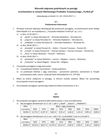 Warunki odprawy podróżnych na pociągi uruchamiane w ramach Markowego Produktu Turystycznego „TurKol.pl” (obowiązują w dniach 11, 18 i 19.02.2017 r.) §1 Podstawowe informacje 1. Niniejsze warunki odprawy obowiązują dla poniższych pociągów, uruchamianych przez Koleje Dolnośląskie S.A. we współpracy z „Turystyka Kolejowa TurKol.pl” sp. z o.o.: 1) w dniu 11.02.2017 r.: a) „Apsik” w relacji Wrocław Gł. – Wrocław Nadodrze – Wrocław Gł., b) „Gapcio” w relacji Wrocław Gł. – Wrocław Nadodrze – Wrocław Gł., c) „Hałabała” w relacji Wrocław Gł. – Wrocław Nadodrze – Wrocław Gł., 2) w dniu 18.02.2017 r.: a) „Koziołek” w relacji Poznań Gł. – Kiekrz – Poznań Franowo – Poznań Gł., b) „Franek” w relacji Poznań Gł. – Poznań Garbary – Poznań Franowo – Poznań Gł., c) „Pyra” w relacji Wolsztyn – Poznań – Wolsztyn, 3) w dniu 19.02.2017 r.: a) „Kasztelan” w relacji Wolsztyn – Leszno – Głogów – Leszno – Wolsztyn, b) „Twierdza” w relacji Głogów – Nowa Sól – Głogów. 2. Z przejazdu pociągiem mogą skorzystać: 1) na podstawie biletów normalnych – każdy podróżny, 2) na podstawie biletów z ulgą ustawową – uprawnieni podróżni, wymienieni w Taryfie przewozowej osób, rzeczy i zwierząt Kolei Dolnośląskich S.A. (TP-KD), 3. Bilety są ważne wyłącznie w pociągu, w którym zostały wydane. Bilety nie uprawniają do przejazdu innymi pociągami. 4. Do przejazdu pociągami uprawniają wyłącznie bilety wymienione w § 2. §2 Opłaty 1. Do przejazdu pociągiem uprawnia bilet jednorazowy z ceną zryczałtowaną: 1) dla pociągów określonych w § 1 ust. 1 pkt 1 („Apsik”, „Gapcio”, „Hałabała”): Bilet Bilet z ulgą ustawową normalny 33% 37% 49% 51% 78% 93% 95% 19,00 zł 12,73 zł 11,97 zł 9,69 zł 9,31 zł 4,18 zł 1,33 zł 0,95 zł 100% 0,00 zł 2) dla pociągów określonych w § 1 ust. 1 pkt 2 lit. a („Koziołek”) oraz b („Franek”): Bilet Bilet z ulgą ustawową normalny 33% 37% 49% 51% 78% 93% 95% 29,00 zł 19,43 zł 18,27 zł 14,79 zł 14,21 zł 6,38 zł 2,03 zł 1,45 zł 100% 0,00 zł 1 3) dla pociągów określonych w § 1 ust. 1 pkt 2 lit. c („Pyra”) oraz pkt 3 lit. b („Twierdza”): Bilet Bilet z ulgą ustawową normalny 33% 37% 49% 51% 78% 93% 95% 100% 39,00 zł 26,13 zł 24,57 zł 19,89 zł 19,11 zł 8,58 zł 2,73 zł 1,95 zł 0,00 zł 4) dla pociągu określonego w § 1 ust. 1 pkt 3 lit. a („Kasztelan”): Bilet Bilet z ulgą ustawową normalny 33% 37% 49% 51% 78% 93% 69,00 zł 46,23 zł 43,47 zł 35,19 zł 33,81 zł 15,18 zł 4,83 zł 95% 3,45 zł 100% 0,00 zł 2. Od cen wskazanych w ust. 1 nie udziela się dalszych ulg i rabatów. 3. Oprócz biletów wymienionych w ust. 1 dopuszcza się przewóz podróżnych na podstawie ofert własnych „Turystyka Kolejowa TurKol.pl” sp. z o.o.: 1) „Karnet TurKol.pl 2017” – według cen normalnych i z ulgami handlowymi, 2) „Bilet sieciowy „TurKol.pl 2017” – według cen normalnych i z ulgami handlowymi. 4. Regulaminy ofert, o których mowa w ust. 3 są dostępne na stronie internetowej www.TurKol.pl. §3 Sprzedaż biletów 1. Bilety, o których mowa w § 2 ust. 1 można nabyć: 1) za pośrednictwem strony internetowej www.TurKol.pl – wyłącznie w przedsprzedaży, 2) u kierownika pociągu – wyłącznie przed odjazdem pociągu, w ramach wolnych miejsc. 2. W ramach przedsprzedaży, o której mowa w ust. 1 pkt 1, na stronie internetowej www.TurKol.pl należy wypełnić formularz zamówienia i po otrzymaniu potwierdzenia dokonać płatności na wskazane konto (przelew internetowy, wpłata w banku lub na poczcie). Po zaksięgowaniu płatności podróżny otrzymuje potwierdzenie, z którym należy zgłosić się do kierownika pociągu, który wydaje bilet na przejazd. Szczegółowe informacje w zakresie przedsprzedaży są dostępne: 1) na stronie internetowej www.TurKol.pl, 2) pod numerem Infolinii TurKol.pl (+48) 603-366-366 w dni robocze w godzinach od 09:00 do 17:00 (telefon w sieci Play, opłata według taryfy operatora). 3. Termin rozpoczęcia przedsprzedaży zostaje każdorazowo ogłoszony na stronie internetowej www.TurKol.pl. 4. Ze względów organizacyjnych i bezpieczeństwa liczba miejsc w każdym z pociągów jest ograniczona. 2 §4 Zmiana/rozwiązanie umowy przewozu 1. Podróżny może zmienić/rozwiązać umowę przewozu przed rozpoczęciem podróży na pisemny wniosek skierowany drogą elektroniczną na adres [email protected]. W przypadku rozwiązania umowy potrąca się odstępne w wysokości 10% ceny biletu. Potrącenia nie stosuje się jeżeli rozwiązanie umowy przewozu wynika z przyczyn występujących po stronie Kolei Dolnośląskich S.A. lub „Turystyka Kolejowa TurKol.pl” sp. z o.o. 2. Podróżny może zmienić umowę przewozu w miejscu zatrzymania pociągu na drodze przewozu uzyskując od kierownika pociągu stosowne poświadczenie na bilecie i nabywając nowy bilet na przejazd. O zwrot należności podróżny może wnioskować drogą pisemnej reklamacji, wniesionej zgodnie z zapisami § 24 i § 25 RP-KD. 3. Podróżny może rozwiązać umowę przewozu w miejscu zatrzymania pociągu na drodze przewozu uzyskując od kierownika pociągu stosowne poświadczenie na bilecie. O zwrot należności podróżny może wnioskować drogą pisemnej reklamacji, wniesionej zgodnie z zapisami § 24 i § 25 RP-KD. W przypadku uznania reklamacji od ceny biletu potrąca się odstępne w wysokości 10% ceny biletu. Potrącenia nie stosuje się jeżeli rozwiązanie umowy przewozu wynika z przyczyn występujących po stronie Kolei Dolnośląskich S.A. lub „Turystyka Kolejowa TurKol.pl” sp. z o.o. 4. Podróżny z biletem ulgowym, który w momencie kontroli nie posiada dokumentu uprawniającego do ulgi jest zobowiązany nabyć bilet normalny. Na niewykorzystanym bilecie ulgowym obsługa pociągu umieszcza stosowną adnotację. O zwrot należności za niewykorzystany bilet ulgowy 