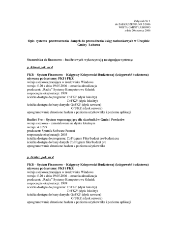 Załącznik Nr 1 do ZARZĄDZENIA NR 5/2006 WÓJTA GMINY ŁUBOWO z dnia 20 czerwca 2006 Opis systemu przetwarzania danych do prowadzenia ksiąg rachunkowych w Urzędzie Gminy Łubowo Stanowiska ds finansowo – budżetowych wykorzystują następujące systemy: p. Klimek pok. nr 4 FKB – System Finansowo – Księgowy Ksiegowości Budżetowej (księgowość budżetowa) używane podsystemy: FKJ i FKZ wersja sieciowa pracująca w środowisku Windows wersja: 5.20 z dnia 19.05.2006 – ostatnia aktualizacja producent: „Radix” Systemy Komputerowe Gdańsk rozpoczęcie eksploatacji: 1999 ścieżka dostępu do programu: C:\FKJ\ (dysk lokalny) C:\FKZ\ (dysk lokalny) ścieżka dostępu do bazy danych: G:\FKJ\ (dysk serwera) G:\FKZ\ (dysk serwera) oprogramowanie chronione hasłem z poziomu użytkownika i poziomu aplikacji Budżet Pro – System wspomagający dla skarbników Gmin i Powiatów wersja sieciowa – zainstalowana na dysku lokalnym wersja: 4.0.229 producent: Sputnik Software Poznań rozpoczęcie eksploatacji: 2003 ścieżka dostępu do programu: C:\Program Files\budzet pro\budzet.exe ścieżka dostępu do bazy danych C:\Program files\budzet pro oprogramowanie chronione hasłem z poziomu użytkownika p. Zeidler pok. nr 4 FKB – System Finansowo – Księgowy Ksiegowości Budżetowej (księgowość budżetowa) używane podsystemy: FKJ i FKZ wersja sieciowa pracująca w środowisku Windows wersja: 5.20 z dnia 19.05.2006 – ostatnia aktualizacja producent: „Radix” Systemy Komputerowe Gdańsk rozpoczęcie eksploatacji: 1999 ścieżka dostępu do programu: C:\FKJ\ (dysk lokalny) C:\FKZ\ (dysk lokalny) ścieżka dostępu do bazy danych: G:\FKJ\ (dysk serwera) G:\FKZ\ (dysk serwera) oprogramowanie chronione hasłem z poziomu użytkownika i poziomu aplikacji dodatkowo na drugiej partycji dysku lokalnego, zainstalowano system FKB z odrębną bazą służy on przetwarzaniu danych dotyczących projektów ZPORR ścieżka dostępu do programu: D:\FKZ\ D:\FKJ\ ścieżka dostępu do bazy danych: D:\FKZ\ D:\FKJ\ instalacja została opatrzona unikalnym hasłem – program jest chroniony z poziomu użytkownika i poziomu aplikacji Stanowiska ds finansowych – wymiar podatków, windykacja należności wykorzystuje następujące oprogramowanie: p. Ignaczak pok. nr 3 WIP – System Windykacji Należności wersja – jednostanowiskowa wersja 5.34 z dnia 17.05.2006 – ostatnia aktualizacja producent: „Radix” Systemy Komputerowe Gdańsk rozpoczęcie eksploatacji: 1991 ścieżka dostępu do programu: C:\WIP\ (dysk lokalny) ścieżka dostępu do bazy danych C:\WIP\ (dysk lokalny) oprogramowanie chronione hasłem z poziomu użytkownika i poziomu aplikacji p. Kurzawińska pok. nr 3 RP – Rejestr pojazdów wersja – jednostanowiskowa producent -PLUS Programy Komputerowe Poznań rozpoczęcie eksploatacji: 1991 ścieżka dostępu do programu: C:\RP\ ścieżka dostępu do bazy danych: C:\RP\ oprogramowanie chronione hasłem z poziomu użytkownika p. Kurzawińska pok. nr 3 POGRUN - System Naliczania Podatków od Gruntów i Nieruchomości wersja – jednostanowiskowa producent: „Radix” Systemy Komputerowe Gdańsk rozpoczęcie eksploatacji: 1995 ścieżka dostępu do programu: C:\POGRUN\ (dysk lokalny) ścieżka dostępu do bazy danych C:\POGRUN\ (dysk lokalny) oprogramowanie chronione hasłem z poziomu użytkownika i poziomu aplikacji