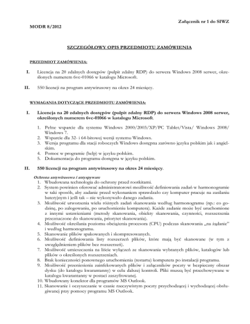 Załącznik nr 1 do SIWZ MODR 8/2012 SZCZEGÓŁOWY OPIS PRZEDMIOTU ZAMÓWIENIA PRZEDMIOT ZAMÓWIENIA: I. II. Licencja na 20 zdalnych dostępów (pulpit zdalny RDP) do serwera Windows 2008 serwer, określonych numerem 6vc-01066 w katalogu Microsoft. 550 licencji na program antywirusowy na okres 24 miesięcy. WYMAGANIA DOTYCZĄCE PRZEDMIOTU ZAMÓWIENIA: I. Licencja na 20 zdalnych dostępów (pulpit zdalny RDP) do serwera Windows 2008 serwer, określonych numerem 6vc-01066 w katalogu Microsoft. 1. Pełne wsparcie dla systemu Windows 2000/2003/XP/PC Tablet/Vista/ Windows 2008/ Windows 7. 2. Wsparcie dla 32- i 64-bitowej wersji systemu Windows. 3. Wersja programu dla stacji roboczych Windows dostępna zarówno języku polskim jak i angielskim. 4. Pomoc w programie (help) w języku polskim. 5. Dokumentacja do programu dostępna w języku polskim. II. 550 licencji na program antywirusowy na okres 24 miesięcy. Ochrona antywirusowa i antyspyware 1. Wbudowana technologia do ochrony przed rootkitami. 2. System powinien oferować administratorowi możliwość definiowania zadań w harmonogramie w taki sposób, aby zadanie przed wykonaniem sprawdzało czy komputer pracuje na zasilaniu bateryjnym i jeśli tak – nie wykonywało danego zadania. 3. Możliwość utworzenia wielu różnych zadań skanowania według harmonogramu (np.: co godzinę, po zalogowaniu, po uruchomieniu komputera). Każde zadanie może być uruchomione z innymi ustawieniami (metody skanowania, obiekty skanowania, czynności, rozszerzenia przeznaczone do skanowania, priorytet skanowania). 4. Możliwość określania poziomu obciążenia procesora (CPU) podczas skanowania „na żądanie” i według harmonogramu. 5. Skanowanie plików spakowanych i skompresowanych. 6. Możliwość definiowania listy rozszerzeń plików, które mają być skanowane (w tym z uwzględnieniem plików bez rozszerzeń). 7. Możliwość umieszczenia na liście wyłączeń ze skanowania wybranych plików, katalogów lub plików o określonych rozszerzeniach. 8. Brak konieczności ponownego uruchomienia (restartu) komputera po instalacji programu. 9. Możliwość przeniesienia zainfekowanych plików i załączników poczty w bezpieczny obszar dysku (do katalogu kwarantanny) w celu dalszej kontroli. Pliki muszą być przechowywane w katalogu kwarantanny w postaci zaszyfrowanej. 10. Wbudowany konektor dla programów MS Outlook. 11. Skanowanie i oczyszczanie w czasie rzeczywistym poczty przychodzącej i wychodzącej obsługiwanej przy pomocy programu MS Outlook. 12. Skanowanie i oczyszczanie poczty przychodzącej POP3 "w locie" (w czasie rzeczywistym), zanim zostanie dostarczona do klienta pocztowego zainstalowanego na stacji roboczej (niezależnie od konkretnego klienta pocztowego). 13. Automatyczna integracja skanera POP3 z dowolnym klientem pocztowym bez konieczności zmian w konfiguracji. 14. Możliwość definiowania różnych portów dla POP3, na których ma odbywać się skanowanie. 15. Możliwość opcjonalnego dołączenia informacji o przeskanowaniu do każdej odbieranej wiadomości e-mail lub tylko do zainfekowanych wiadomości e-mail. 16. Skanowanie ruchu HTTP na poziomie stacji roboczych. Zainfekowany ruch jest automatycznie blokowany a użytkownikowi wyświetlane jest stosowne powiadomienie. 17. Blokowanie możliwości przeglądania wybranych stron internetowych. Listę blokowanych stron internetowych określa administrator. Program musi umożliwić blokowanie danej strony internetowej po podaniu na liście całej nazwy strony lub tylko wybranego słowa występujące w nawie strony. 18. Automatyczna integracja z dowolną przeglądarką internetową bez konieczności zmian w konfiguracji. 19. Możliwość definiowania różnych portów dla HTTP, na których ma odbywać się skanowanie. 20. Wbudowane dwa niezależne moduły heurystyczne – jeden wykorzystujący pasywne metody heurystyczne (heurystyka) i drugi wykorzystujący aktywne metody heurystyczne oraz elementy sztucznej inteligencji (zaawansowana heurystyka). Musi istnieć możliwość wyboru z jaką heurystyka ma odbywać się skanowanie – z użyciem jednej i/lub obu metod jednocześnie. 21. Możliwość skanowania wyłącznie z zastosowaniem algorytmów heurystycznych tj. wyłączenie skanowania przy pomocy sygnatur baz wirusów. 22. Aktualizacje modułów analizy heurystycznej. 23. Możliwość automatycznego wysyłania nowych zagrożeń (wykrytych przez metody heurystyczne) do laboratoriów producenta bezpośrednio z programu (nie wymaga ingerencji użytkownika). Użytkownik musi mieć możliwość określenia rozszerzeń dla plików, które nie powinny być wysyłane automatycznie, oraz czy próbki zagrożeń powinny być wysyłane w pełni automatycznie czy też po dodatkowym potwierdzeniu przez użytkownika. 24. Możliwość wysyłania wraz z próbką komentarza dotyczącego nowego zagrożenia i adresu email użytkownika, na który producent może wysłać dodatkowe pytania dotyczące zgłaszanego zagrożenia. 25. Wysyłanie zagrożeń do laboratorium powinno być możliwe z serwera zdalnego zarządzania i lokalnie z każdej stacji roboczej w przypadku komputerów mobilnych. 26. Możliwość automatycznego wysyłania powiadomienia o wykrytych zagrożeniach do dowolnej stacji roboczej w sieci lokalnej. 27. Interfejs programu powinien oferować funkcję pracy w trybie bez grafiki gdzie cały interfejs wyświetlany jest w formie formatek i tekstu. 28. Program powinien umożliwiać skanowanie ruchu sieciowego wewnątrz szyfrowanych protokołów HTTPS i POP3S. 29. Program powinien skanować ruch HTTPS transparentnie bez potrzeby konfiguracji zewnętrznych aplikacji takich jak przeglądarki Web lub programy pocztowe. 30. Administrator powinien mieć możliwość zdefiniowania portów TCP na których aplikacja będzie realizowała proces skanowania ruchu szyfrowanego. 31. Możliwość zabezpieczenia konfiguracji programu hasłem, w taki sposób aby użytkownik siedzący przy komputerze p