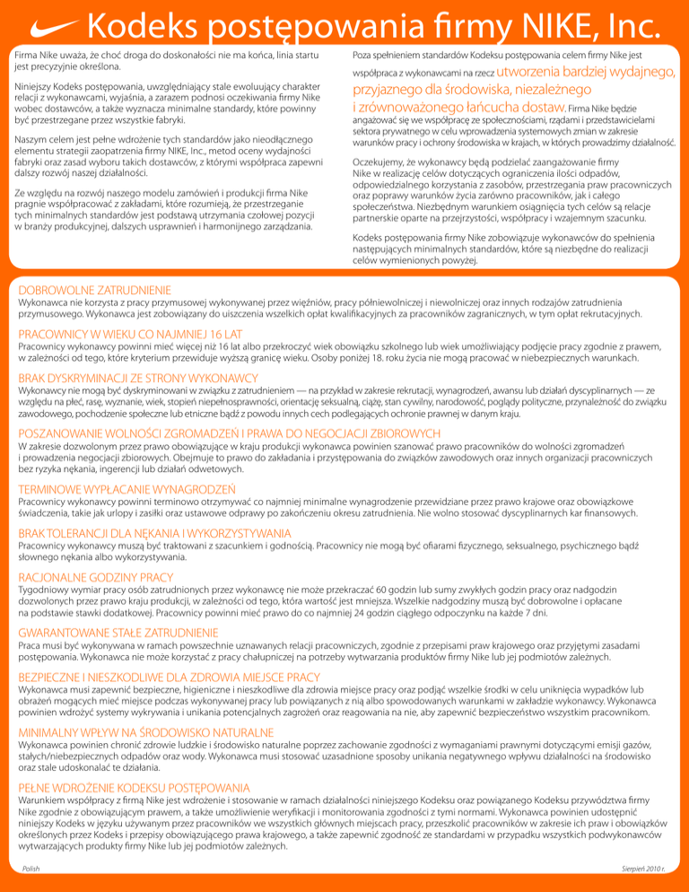 SKodeks postępowania firmy NIKE, Inc. Firma Nike uważa, że choć droga do doskonałości nie ma końca, linia startu jest precyzyjnie określona. Poza spełnieniem standardów Kodeksu postępowania celem firmy Nike jest Niniejszy Kodeks postępowania, uwzględniający stale ewoluujący charakter relacji z wykonawcami, wyjaśnia, a zarazem podnosi oczekiwania firmy Nike wobec dostawców, a także wyznacza minimalne standardy, które powinny być przestrzegane przez wszystkie fabryki. przyjaznego dla środowiska, niezależnego i zrównoważonego łańcucha dostaw. Firma Nike będzie Naszym celem jest pełne wdrożenie tych standardów jako nieodłącznego elementu strategii zaopatrzenia firmy NIKE, Inc., metod oceny wydajności fabryki oraz zasad wyboru takich dostawców, z którymi współpraca zapewni dalszy rozwój naszej działalności. Ze względu na rozwój naszego modelu zamówień i produkcji firma Nike pragnie współpracować z zakładami, które rozumieją, że przestrzeganie tych minimalnych standardów jest podstawą utrzymania czołowej pozycji w branży produkcyjnej, dalszych usprawnień i harmonijnego zarządzania. współpraca z wykonawcami na rzecz utworzenia bardziej wydajnego, angażować się we współpracę ze społecznościami, rządami i przedstawicielami sektora prywatnego w celu wprowadzenia systemowych zmian w zakresie warunków pracy i ochrony środowiska w krajach, w których prowadzimy działalność. Oczekujemy, że wykonawcy będą podzielać zaangażowanie firmy Nike w realizację celów dotyczących ograniczenia ilości odpadów, odpowiedzialnego korzystania z zasobów, przestrzegania praw pracowniczych oraz poprawy warunków życia zarówno pracowników, jak i całego społeczeństwa. Niezbędnym warunkiem osiągnięcia tych celów są relacje partnerskie oparte na przejrzystości, współpracy i wzajemnym szacunku. Kodeks postępowania firmy Nike zobowiązuje wykonawców do spełnienia następujących minimalnych standardów, które są niezbędne do realizacji celów wymienionych powyżej. DOBROWOLNE ZATRUDNIENIE Wykonawca nie korzysta z pracy przymusowej wykonywanej przez więźniów, pracy półniewolniczej i niewolniczej oraz innych rodzajów zatrudnienia przymusowego. Wykonawca jest zobowiązany do uiszczenia wszelkich opłat kwalifikacyjnych za pracowników zagranicznych, w tym opłat rekrutacyjnych. PRACOWNICY W WIEKU CO NAJMNIEJ 16 LAT Pracownicy wykonawcy powinni mieć więcej niż 16 lat albo przekroczyć wiek obowiązku szkolnego lub wiek umożliwiający podjęcie pracy zgodnie z prawem, w zależności od tego, które kryterium przewiduje wyższą granicę wieku. Osoby poniżej 18. roku życia nie mogą pracować w niebezpiecznych warunkach. BRAK DYSKRYMINACJI ZE STRONY WYKONAWCY Wykonawcy nie mogą być dyskryminowani w związku z zatrudnieniem — na przykład w zakresie rekrutacji, wynagrodzeń, awansu lub działań dyscyplinarnych — ze względu na płeć, rasę, wyznanie, wiek, stopień niepełnosprawności, orientację seksualną, ciążę, stan cywilny, narodowość, poglądy polityczne, przynależność do związku zawodowego, pochodzenie społeczne lub etniczne bądź z powodu innych cech podlegających ochronie prawnej w danym kraju. POSZANOWANIE WOLNOŚCI ZGROMADZEŃ I PRAWA DO NEGOCJACJI ZBIOROWYCH W zakresie dozwolonym przez prawo obowiązujące w kraju produkcji wykonawca powinien szanować prawo pracowników do wolności zgromadzeń i prowadzenia negocjacji zbiorowych. Obejmuje to prawo do zakładania i przystępowania do związków zawodowych oraz innych organizacji pracowniczych bez ryzyka nękania, ingerencji lub działań odwetowych. TERMINOWE WYPŁACANIE WYNAGRODZEŃ Pracownicy wykonawcy powinni terminowo otrzymywać co najmniej minimalne wynagrodzenie przewidziane przez prawo krajowe oraz obowiązkowe świadczenia, takie jak urlopy i zasiłki oraz ustawowe odprawy po zakończeniu okresu zatrudnienia. Nie wolno stosować dyscyplinarnych kar finansowych. BRAK TOLERANCJI DLA NĘKANIA I WYKORZYSTYWANIA Pracownicy wykonawcy muszą być traktowani z szacunkiem i godnością. Pracownicy nie mogą być ofiarami fizycznego, seksualnego, psychicznego bądź słownego nękania albo wykorzystywania. RACJONALNE GODZINY PRACY Tygodniowy wymiar pracy osób zatrudnionych przez wykonawcę nie może przekraczać 60 godzin lub sumy zwykłych godzin pracy oraz nadgodzin dozwolonych przez prawo kraju produkcji, w zależności od tego, która wartość jest mniejsza. Wszelkie nadgodziny muszą być dobrowolne i opłacane na podstawie stawki dodatkowej. Pracownicy powinni mieć prawo do co najmniej 24 godzin ciągłego odpoczynku na każde 7 dni. GWARANTOWANE STAŁE ZATRUDNIENIE Praca musi być wykonywana w ramach powszechnie uznawanych relacji pracowniczych, zgodnie z przepisami praw krajowego oraz przyjętymi zasadami postępowania. Wykonawca nie może korzystać z pracy chałupniczej na potrzeby wytwarzania produktów firmy Nike lub jej podmiotów zależnych. BEZPIECZNE I NIESZKODLIWE DLA ZDROWIA MIEJSCE PRACY Wykonawca musi zapewnić bezpieczne, higieniczne i nieszkodliwe dla zdrowia miejsce pracy oraz podjąć wszelkie środki w celu uniknięcia wypadków lub obrażeń mogących mieć miejsce podczas wykonywanej pracy lub powiązanych z nią albo spowodowanych warunkami w zakładzie wykonawcy. Wykonawca powinien wdrożyć systemy wykrywania i unikania potencjalnych zagrożeń oraz reagowania na nie, aby zapewnić bezpieczeństwo wszystkim pracownikom. MINIMALNY WPŁYW NA ŚRODOWISKO NATURALNE Wykonawca powinien chronić zdrowie ludzkie i środowisko naturalne poprzez zachowanie zgodności z wymaganiami prawnymi dotyczącymi emisji gazów, stałych/niebezpiecznych odpadów oraz wody. Wykonawca musi stosować uzasadnione sposoby unikania negatywnego wpływu działalności na środowisko oraz stale udoskonalać te działania. PEŁNE WDROŻENIE KODEKSU POSTĘPOWANIA Warunkiem współpracy z firmą Nike jest wdrożenie i stosowanie w ramach