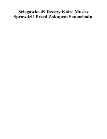 Ściągawka 49 Rzeczy Które Musisz Sprawdzić Przed Zakupem Samochodu Sprawdzanie czy samochód jest po wypadku 1. Czy szyby są oryginalne – sprawdź oznakowania na szybach 2. Czy pasy bezpieczeństwa są oryginalne – sprawdź rok produkcji na naszywkach. 3. Szpary między elementami samochodu – sprawdź czy wszędzie są takie same 4. Łączenia elementów karoserii – sprawdź czy nigdzie nie ma podejrzanych, nie oryginalnych spawów. 5. Porównaj rok produkcji części – porównaj rok produkcji i oznaczenia klapki od bezpieczników z innymi częściami metalowymi i plastikowymi pod maską w celu weryfikacji ich oryginalności 6. Czy przednie nadkola są oryginalne – sprawdź obecność znaku marki w miejscu gdzie łączą się maska i przednie nadkola (podnieś maskę). 7. Spawy amortyzatorów – sprawdź pod maską miejsce spawu amortyzatorów – wklęsła dziurka oznacza oryginalny spaw. 8. Sprawdź kolor lakieru pod uszczelkami – odsuń trochę uszczelki po otwarciu bocznych drzwi oraz tylnej klapy i sprawdź czy nie ma pod nimi innego koloru lakieru niż kolor samochodu. 9. Czy bieżnik opon równo się ściera 10. Sprawdź mocowanie maski – (opcjonalne) możesz poluzować śrubę mocowania maski. Jeżeli maska jest oryginalna, pod śrubą będzie inny kolor lakieru niż kolor samochodu. 11. Sprawdź grubość lakieru – użyj miernika grubości lakieru na różnych częściach karoserii żeby potwierdzić ich oryginalność. 12. Sprawdź kolor podkładu pod rysami – jeżeli pod rysami na lakierze widzisz podkład koloru żółtego lub szarego, to duża szansa że dana część była wymieniana. 13. Czy elementy plastikowe były klejone – poszukaj złamań lub spawów na elementach plastikowych. Sprawdzanie stanu silnika oraz części układu jazdy 1. Czystość silnika – jeżeli silnik jest czysty jak po umyciu, to bądź ostrożny 2. Sprawdź poziom oleju – jeżeli olej jest poniżej wartości minimalnej, samochód może spalać olej 3. Sprawdź kolor oleju – jeżeli olej jest czarny, to oznacza że olej jest bardzo stary i zużyty. Olej powinien być przezroczysty. 4. Sprawdź poziom kompresji – odkręć korek wlewu oleju w silniku i zapal silnik. Jeżeli mocno dmucha to silnik ma słabą kompresję. 5. Osad – jeżeli pod korkiem wlewu oleju silnikowego widoczny jest biały osad, to silnik jest do kapitalnego remontu. 6. Stuki – podejdź do zapalonego silnika i przysłuchaj się jego pracy. Stuki i nierówna praca oznaczają problemy. 7. Kontrolka oleju – kontrolka ciśnienia oleju powinna zapalić się i zgasnąć przy zapalaniu samochodu. Wskaźnik ciśnienia oleju przez cały czas powinien wskazywać wartość minimum 1.5 8. Komunikaty ostrzegawcze – jeżeli na desce rozdzielczej wyświetlają się komunikaty ostrzegawcze, to możesz spodziewać się usterek w danych częściach bez względu na zapewnienia sprzedawcy. 9. Poziom płynu w chłodnicy – poniżej minimum płynu chłodniczego w zbiorniku wyrównawczym? Silnik może się przegrzewać. 10. Pasek rozrządu - zapytaj sprzedawcy czy i kiedy był wymieniany pasek rozrządu. Jeżeli potwierdzi że był, to zapytaj czy była z nim również wymieniona „rolka napinacza”. 11. Czy samochód dymi – jeżeli samochód dymi przy zapalaniu i podczas pracy, to albo bierze olej, albo silnik jest uszkodzony. Starsze samochody z silnikiem diesla mogą przy zapalaniu puścić trochę dymu. 12. Czy silnik równo chodzi – odpal silnik i zostaw go bez gazu. Silnik powinien pracować równo i nie powinien sam zwiększać lub zmniejszać swoich obrotów („falować”). 13. Luz na łożyskach – złap za każde z kół i poruszaj mocno ciągnąc do siebie i pchając do przodu. Jeżeli wyczuwasz duży luz, to oznacza że samochód ma zużyte łożyska. Minimalny luz jest poprawny. 14. Tarcze hamulcowe – zajrzyj na tarce hamulcowe i sprawdź czy nie są popękane i jak bardzo są starte. 15. Opony – sprawdź czy bieżniki opon na każdej z osi są takie same. 16. Amortyzatory – Naciśnij kilka razy całym ciężarem swojego ciała na karoserię nad każdym z kół. Sprawny amortyzator wyhamuje po drugim naciśnięciu. Jazda próbna 1. Sprawdź wyposażenie – sprawdź dokładnie czy całe wyposażenie samochodu jest sprawne. Szczególną uwagę zwróć na klimatyzację. 2. Upewnij się że samochód jest „zimny” - przy odpalaniu samochodu spójrz na wskaźnik temperatury silnika i upewnij się że jest na zero. 3. Ssanie – czy ssanie wyłącza się poprawnie gdy silnik się nagrzeje (po przejechaniu około 5km)? 4. Przyśpieszanie – podczas jazdy przetestuj wolne, równomierne przyśpieszanie na każdym z biegów, oraz szybkie i agresywne. 5. Skrzynia biegów – biegi powinny wchodzić płynnie, nie zgrzytać i nie powinny wyskakiwać same! Na każdym biegu płynnie i spokojnie przekręć cały zakres obrotów, a potem przetestuj szybkie przyśpieszanie przez cały zakres obrotów. 6. Bieg cofania – przetestuj bieg wsteczny. 7. Puść kierownicę podczas jazdy – rozpędź się do prędkości 40km/h – 60km/h i po upewnieniu się że jesteś na pustej drodze i nie ma żadnego niebezpieczeństwa puść kierownicę. Czy samochód znosi? 8. Przetestuj hamulce – oprócz normalnego hamowania: 9. 1. Rozpędź się i zacznij hamować równomiernym i stopniowym wciskaniem pedału hamulca, aż dociśniesz pedał do maksimum a samochód się zatrzyma. 2. Wykonaj próbę awaryjnego hamowania poprzez rozpędzenie się i szybkie i głębokie wciśnięcie pedału hamulca. 3. Przetestuj hamulec ręczny – zaciągnij go przy postoju i spróbuj ruszyć na pół-sprzęgle. Jeżeli samochód będzie miał problemy z ruszeniem, to znaczy że hamulec ręczny działa poprawnie. Sprawdź pełny skręt – skręć maksymalnie koła i zacznij jechać robiąc koło dodając jednocześnie trochę gazu. Nic nie stuka, skrzypi i nie przeskakuje? 10. Wykonaj szybkie skręty – podczas jazdy z pr