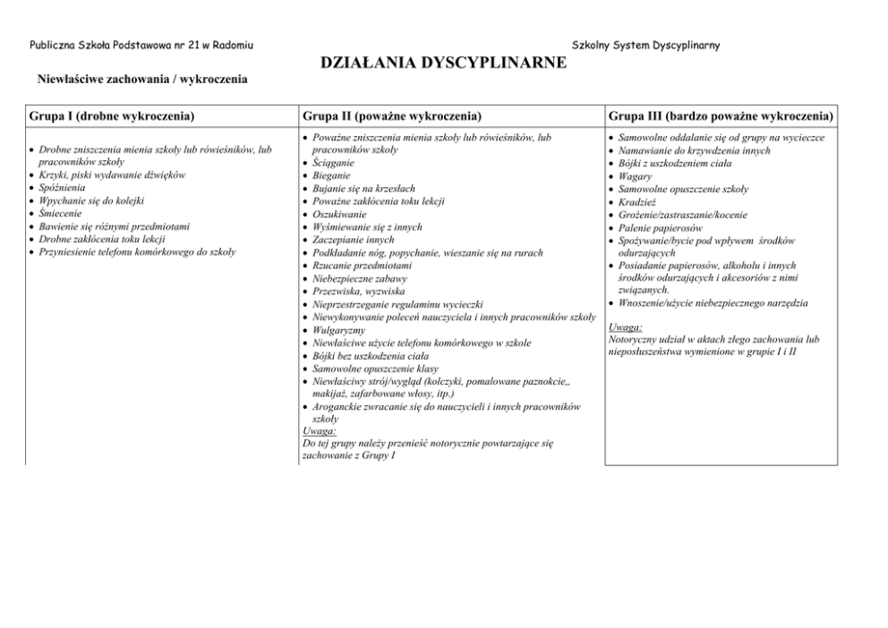 Publiczna Szkoła Podstawowa nr 21 w Radomiu Szkolny System Dyscyplinarny DZIAŁANIA DYSCYPLINARNE Niewłaściwe zachowania / wykroczenia Grupa I (drobne wykroczenia) Drobne zniszczenia mienia szkoły lub rówieśników, lub pracowników szkoły Krzyki, piski wydawanie dźwięków Spóźnienia Wpychanie się do kolejki Śmiecenie Bawienie się różnymi przedmiotami Drobne zakłócenia toku lekcji Przyniesienie telefonu komórkowego do szkoły Grupa II (poważne wykroczenia) Grupa III (bardzo poważne wykroczenia) Poważne zniszczenia mienia szkoły lub rówieśników, lub pracowników szkoły Ściąganie Bieganie Bujanie się na krzesłach Poważne zakłócenia toku lekcji Oszukiwanie Wyśmiewanie się z innych Zaczepianie innych Podkładanie nóg, popychanie, wieszanie się na rurach Rzucanie przedmiotami Niebezpieczne zabawy Przezwiska, wyzwiska Nieprzestrzeganie regulaminu wycieczki Niewykonywanie poleceń nauczyciela i innych pracowników szkoły Wulgaryzmy Niewłaściwe użycie telefonu komórkowego w szkole Bójki bez uszkodzenia ciała Samowolne opuszczenie klasy Niewłaściwy strój/wygląd (kolczyki, pomalowane paznokcie,, makijaż, zafarbowane włosy, itp.) Aroganckie zwracanie się do nauczycieli i innych pracowników szkoły Uwaga: Do tej grupy należy przenieść notorycznie powtarzające się zachowanie z Grupy I Samowolne oddalanie się od grupy na wycieczce Namawianie do krzywdzenia innych Bójki z uszkodzeniem ciała Wagary Samowolne opuszczenie szkoły Kradzież Grożenie/zastraszanie/kocenie Palenie papierosów Spożywanie/bycie pod wpływem środków odurzających Posiadanie papierosów, alkoholu i innych środków odurzających i akcesoriów z nimi związanych. Wnoszenie/użycie niebezpiecznego narzędzia Uwaga: Notoryczny udział w aktach złego zachowania lub nieposłuszeństwa wymienione w grupie I i II Publiczna Szkoła Podstawowa nr 21 w Radomiu Szkolny System Dyscyplinarny Pierwsze wykroczenie: Naprawa, odkupienie lub zadośćuczynienie w inny sposób Rozmowa uczeń – nauczyciel Posprzątanie po sobie Przejście na koniec kolejki Złożenie przedmiotu (zabawki, telefonu, gry, itp.) w depozyt u nauczyciela do końca dnia Pierwsze wykroczenie: Rozmowa U-W-P-N Czasowe ograniczenie możliwości poruszania się na przerwie Odebranie przedmiotu Telefon i ozdoby (kolczyki itp.) są przekazywane w depozyt do wice-dyrektora i odbierają go rodzice razem z uczniem Zawieszenie w przywilejach 1-3 dni Zmycie makijażu (akcesoria dostępne w sekretariacie) Uczeń uczy się na pamięć regulaminu wycieczki Dziecko informuje rodziców telefonicznie lub listownie o swoim niewłaściwym zachowaniu Pierwsze wykroczenie: Rozmowa U-W-P-N-R-D Zawieszenie w przywilejach 5-10 dni Przepadek papierosów, alkoholu, akcesoriów i niebezpiecznych narzędzi Skierowanie do odpowiedniego programu Zwrot lub odkupienie skradzionego przedmiotu Otoczenie opieką poszkodowanego (przez sprawcę)i/lub zadośćuczynienie za porozumieniem stron Wykonanie plakatu lub napisanie pracy o szkodliwości palenia lub stosowania środków odurzających Nieoficjalna rozmowa z policją Kolejne wykroczenie: Dziecko informuje rodziców telefonicznie lub listownie o swoim niewłaściwym zachowaniu Rozmowa U-W-N Posprzątanie większego obszaru Czasowe ograniczenie możliwości poruszania się na przerwie (odosobnienie) Zawieszenie w przywilejach na 1-3 dni Kolejne wykroczenie: Zawieszenie w przywilejach 3-5 dni Rozmowa U-W-P-N-R Skierowanie do odpowiedniego programu Kolejne wykroczenie: Wewnątrzszkolne procedury postępowania w sytuacjach kryzysowych (sąd, policja) Zespół wychowawczy