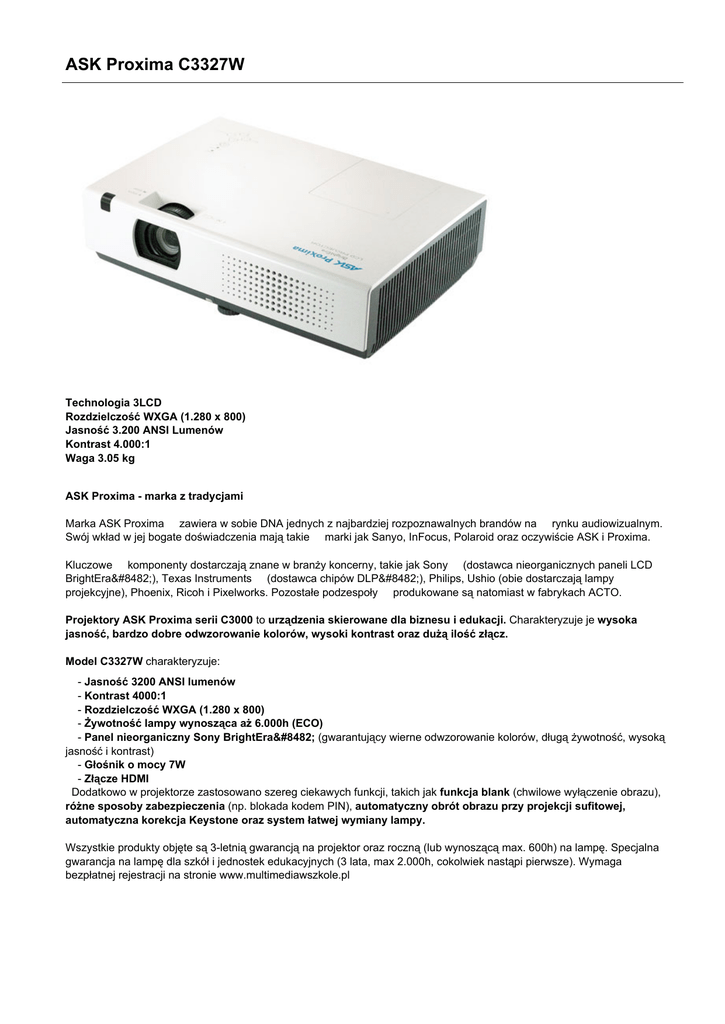 ASK Proxima C3327W Technologia 3LCD Rozdzielczość WXGA (1.280 x 800) Jasność 3.200 ANSI Lumenów Kontrast 4.000:1 Waga 3.05 kg ASK Proxima - marka z tradycjami Marka ASK Proxima zawiera w sobie DNA jednych z najbardziej rozpoznawalnych brandów na rynku audiowizualnym. Swój wkład w jej bogate doświadczenia mają takie marki jak Sanyo, InFocus, Polaroid oraz oczywiście ASK i Proxima. Kluczowe komponenty dostarczają znane w branży koncerny, takie jak Sony (dostawca nieorganicznych paneli LCD BrightEra™), Texas Instruments (dostawca chipów DLP™), Philips, Ushio (obie dostarczają lampy projekcyjne), Phoenix, Ricoh i Pixelworks. Pozostałe podzespoły produkowane są natomiast w fabrykach ACTO. Projektory ASK Proxima serii C3000 to urządzenia skierowane dla biznesu i edukacji. Charakteryzuje je wysoka jasność, bardzo dobre odwzorowanie kolorów, wysoki kontrast oraz dużą ilość złącz. Model C3327W charakteryzuje: - Jasność 3200 ANSI lumenów - Kontrast 4000:1 - Rozdzielczość WXGA (1.280 x 800) - Żywotność lampy wynosząca aż 6.000h (ECO) - Panel nieorganiczny Sony BrightEra™ (gwarantujący wierne odwzorowanie kolorów, długą żywotność, wysoką jasność i kontrast) - Głośnik o mocy 7W - Złącze HDMI Dodatkowo w projektorze zastosowano szereg ciekawych funkcji, takich jak funkcja blank (chwilowe wyłączenie obrazu), różne sposoby zabezpieczenia (np. blokada kodem PIN), automatyczny obrót obrazu przy projekcji sufitowej, automatyczna korekcja Keystone oraz system łatwej wymiany lampy. Wszystkie produkty objęte są 3-letnią gwarancją na projektor oraz roczną (lub wynoszącą max. 600h) na lampę. Specjalna gwarancja na lampę dla szkół i jednostek edukacyjnych (3 lata, max 2.000h, cokolwiek nastąpi pierwsze). Wymaga bezpłatnej rejestracji na stronie www.multimediawszkole.pl