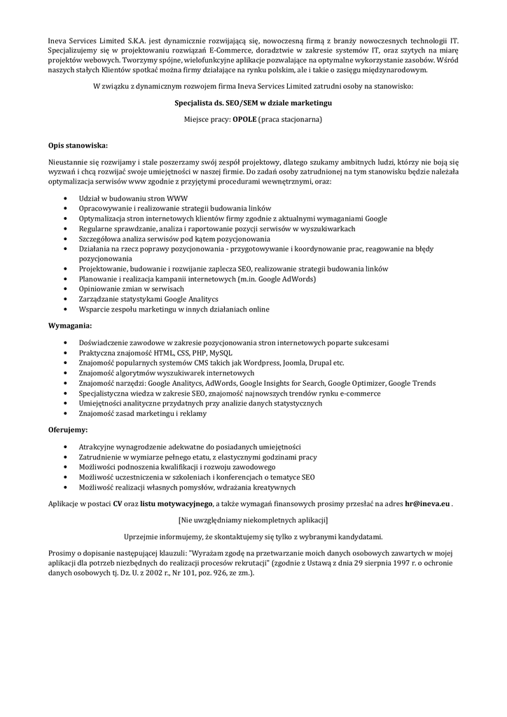 Ineva Services Limited S.K.A. jest dynamicznie rozwijającą się, nowoczesną firmą z branży nowoczesnych technologii IT. Specjalizujemy się w projektowaniu rozwiązań E-Commerce, doradztwie w zakresie systemów IT, oraz szytych na miarę projektów webowych. Tworzymy spójne, wielofunkcyjne aplikacje pozwalające na optymalne wykorzystanie zasobów. Wśród naszych stałych Klientów spotkać można firmy działające na rynku polskim, ale i takie o zasięgu międzynarodowym. W związku z dynamicznym rozwojem firma Ineva Services Limited zatrudni osoby na stanowisko: Specjalista ds. SEO/SEM w dziale marketingu Miejsce pracy: OPOLE (praca stacjonarna) Opis stanowiska: Nieustannie się rozwijamy i stale poszerzamy swój zespół projektowy, dlatego szukamy ambitnych ludzi, którzy nie boją się wyzwań i chcą rozwijać swoje umiejętności w naszej firmie. Do zadań osoby zatrudnionej na tym stanowisku będzie należała optymalizacja serwisów www zgodnie z przyjętymi procedurami wewnętrznymi, oraz: • • • • • • • • • • • Udział w budowaniu stron WWW Opracowywanie i realizowanie strategii budowania linków Optymalizacja stron internetowych klientów firmy zgodnie z aktualnymi wymaganiami Google Regularne sprawdzanie, analiza i raportowanie pozycji serwisów w wyszukiwarkach Szczegółowa analiza serwisów pod kątem pozycjonowania Działania na rzecz poprawy pozycjonowania - przygotowywanie i koordynowanie prac, reagowanie na błędy pozycjonowania Projektowanie, budowanie i rozwijanie zaplecza SEO, realizowanie strategii budowania linków Planowanie i realizacja kampanii internetowych (m.in. Google AdWords) Opiniowanie zmian w serwisach Zarządzanie statystykami Google Analitycs Wsparcie zespołu marketingu w innych działaniach online Wymagania: • • • • • • • • Doświadczenie zawodowe w zakresie pozycjonowania stron internetowych poparte sukcesami Praktyczna znajomość HTML, CSS, PHP, MySQL Znajomość popularnych systemów CMS takich jak Wordpress, Joomla, Drupal etc. Znajomość algorytmów wyszukiwarek internetowych Znajomość narzędzi: Google Analitycs, AdWords, Google Insights for Search, Google Optimizer, Google Trends Specjalistyczna wiedza w zakresie SEO, znajomość najnowszych trendów rynku e-commerce Umiejętności analityczne przydatnych przy analizie danych statystycznych Znajomość zasad marketingu i reklamy Oferujemy: • • • • • Atrakcyjne wynagrodzenie adekwatne do posiadanych umiejętności Zatrudnienie w wymiarze pełnego etatu, z elastycznymi godzinami pracy Możliwości podnoszenia kwalifikacji i rozwoju zawodowego Możliwość uczestniczenia w szkoleniach i konferencjach o tematyce SEO Możliwość realizacji własnych pomysłów, wdrażania kreatywnych Aplikacje w postaci CV oraz listu motywacyjnego, a także wymagań finansowych prosimy przesłać na adres [email protected] . [Nie uwzględniamy niekompletnych aplikacji] Uprzejmie informujemy, że skontaktujemy się tylko z wybranymi kandydatami. Prosimy o dopisanie następującej klauzuli: "Wyrażam zgodę na przetwarzanie moich danych osobowych zawartych w mojej aplikacji dla potrzeb niezbędnych do realizacji procesów rekrutacji" (zgodnie z Ustawą z dnia 29 sierpnia 1997 r. o ochronie danych osobowych tj. Dz. U. z 2002 r., Nr 101, poz. 926, ze zm.).