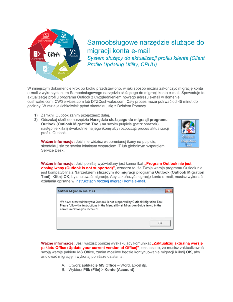 Samoobsługowe narzędzie służące do migracji konta e-mail System służący do aktualizacji profilu klienta (Client Profile Updating Utility, CPUU) W niniejszym dokumencie krok po kroku przedstawiono, w jaki sposób można zakończyć migrację konta e-mail z wykorzystaniem Samoobsługowego narzędzia służącego do migracji konta e-mail. Spowoduje to aktualizację profilu programu Outlook z uwzględnieniem nowego adresu e-mail w domenie cushwake.com, CWServices.com lub DTZCushwake.com. Cały proces może potrwać od 45 minut do godziny. W razie jakichkolwiek pytań skontaktuj się z Działem Pomocy. 1) Zamknij Outlook zanim przejdziesz dalej. 2) Odszukaj skrót do narzędzia Narzędzia służącego do migracji programu Outlook (Outlook Migration Tool) na swoim pulpicie (patrz obrazek), następnie kliknij dwukrotnie na jego ikonę aby rozpocząć proces aktualizacji profilu Outlook. Ważne informacje: Jeśli nie widzisz wspomnianej ikony na pulpicie, skontaktuj się ze swoim lokalnym wsparciem IT lub globalnym wsparciem Service Desk. Ważne informacje: Jeśli poniżej wyświetlany jest komunikat „Program Outlook nie jest obsługiwany (Outlook is not supported)”, oznacza to, że Twoja wersja programu Outlook nie jest kompatybilna z Narzędziem służącym do migracji programu Outlook (Outlook Migration Tool). Kliknij OK, by anulować migrację. Aby zakończyć migrację konta e-mail, musisz wykonać działania opisane w Instrukcjach ręcznej migracji konta e-mail. Ważne informacje: Jeśli widzisz poniżej wyskakujący komunikat „Zaktualizuj aktualną wersję pakietu Office (Update your current version of Office)”, oznacza to, że musisz zaktualizować swoją wersję pakietu MS Office, zanim możliwe będzie kontynuowanie migracji.Kliknij OK, aby anulować migrację, i wykonaj poniższe działania. A. Otwórz aplikację MS Office – Word, Excel itp. B. Wybierz Plik (File) > Konto (Account). C. Kliknij przycisk Opcje aktualizacji (Update Options) i wybierz opcję Aktualizuj teraz (Update Now). W razie wyświetlenia stosownego komunikatu zamknij wszystkie aplikacje MS Office. Pakiet Office sprawdzi, czy dostępne są aktualizacje i w razie ich dostępności pobierze je. D. Po zakończeniu aktualizacji pakietu Office wróć do Kroku 8 i ponownie uruchom Narzędzie służące do migracji programu Outlook (Outlook Migration Tool). 3) W przypadku znalezienia ukrytego komunikatu zobaczysz ten wyskakujący komunikat. Ważne jest, by nie uruchamiać żadnych aplikacji (zwłaszcza aplikacji Outlook i Skype dla firm) do momentu zakończenia aktualizacji profilu programu Outlook. Kliknij OK. 4) Po kliknięciu OK wszystkie aplikacje MAPI zostaną zamknięte (tj. Outlook i Skype dla firm); zostanie uruchomiony System służący do aktualizacji profilu klienta (CPUU). Jeśli nie klikniesz OK, komunikat sam zamknie się po dwóch minutach, po czym system CPUU zostanie uruchomiony automatycznie. Proces aktualizacji może potrwać 30– 45 minut. . 5) Po zakończeniu procesu zobaczysz ten wyskakujący komunikat. Kliknij OK. 6) Otwórz program Outlook. Gdy zostanie wyświetlony komunikat z prośbą o podanie danych uwierzytelniających, wprowadź adres e-mail w domenie cushwake.com, CWServices.com lub DTZCushwake.com oraz hasło sieciowe. Program Outlook wczyta Twój profil i połączy się z Twoją nową skrzynką pocztową Cushman & Wakefield Office 365. Cała zawartość Twojego konta e-mail zostanie poddana migracji, jednak możesz nie zobaczyć w skrzynce pocztowej wiadomości starszych niż sześć miesięcy. Aby uzyskać więcej informacji, zapoznaj się z Najczęściej zadawanymi pytaniami dotyczącymi poczty elektronicznej w programie Outlook. 7) Wyślij testową wiadomość e-mail z prywatnego konta e-mail na swój adres e-mail w domenie cushwake.com, CWServices.com lub DTZCushwake.com i upewnij się, że została ona odebrana.