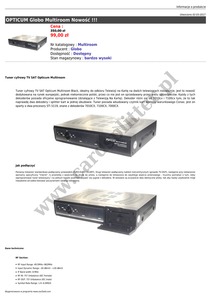 Informacje o produkcie Utworzono 02-03-2017 OPTICUM Globo Multiroom Nowość !!! Cena : 350,00 zł 99,00 zł Nr katalogowy : Multiroom Producent : Globo Dostępność : Dostępny Stan magazynowy : bardzo wysoki .p l Tuner cyfrowy TV SAT Opticum Multiroom ar d sp lit te r Tuner cyfrowy TV SAT Opticum Multiroom Black, idealny do odbioru Telewizji na Kartę na dwóch telewizorach niezależnie. Jest to nowość dedykowana na rynek europejski, jednak niekoniecznie polski, przez co nie jest on sprzedawany przez wielu sprzedawców. Każdy z tych dekoderów posiada oficjalne oprogramowanie (działające z Telewizją Na Kartę). Dekoder różni się od 7010cx i 7100cx tym, że to tak naprawdę dwa dekodery i splitter kart w jednej obudowie. Tuner posiada wbudowany czytnik kart dostępu warunkowego Conax. Jest on oparty o dwa procesory STi 5119, znane z dekoderów 7010CX, 7100CX, 7000CX. Jak podłączyć w w w .c Pierwszy telewizor standardowo podłączamy przewodem EURO-EURO (SCART). Drugi telewizor podłączamy kablem koncentrycznym (gniazdo TV-OUT), następnie przy telewizorze wpinamy specyficzny "trójnik", tj przelotkę z wejściem na diodę do pilota, a następnie do telewizora do zwykłego wejścia antenowego - musimy pamiętać o tym, żeby zaprogramować tuner telewizyjny i na jednym kanale powinien pojawić się sygnał z dekodera. W zestawie są oczywiście dwa identyczne piloty, tak aby każdy użytkownik mógł niezależnie od siebie kierować poczynaniami swojego telewizora. Dane techniczne: RF Section: ● RF Input Range: 49.5MHz~862MHz ● Input Dynamic Range: -20 dBmV~ +20 dBmV ● IF Band width: 8 MHz ● RF IN: 75? Unbalance (IEC Female) ● RF OUT: 75? Unbalance (IEC male) ● Symbol Rate Range: 1.9~6.9MS/S Wygenerowano w programie www.oscGold.com ● Supporting system: DVB-C (QAM) Compliant ● Multi-Demodulation Selection:16 QAM, 32 QAM, 64 QAM, 128 QAM and 256 QAM Video format: MPEG-II Main profile/Main level ● Audio format : MPEG-II layer I&II ● Aspect Ratio: 16:9, 4:3 ● Audio sampling rate: 32,44.1, 48kHz ● Audio Type: Mono; Dual Mono; Stereo; Joint stereo ● Graphic display: 720x576(PAL), 720x480(NTSC) w w w .c ar d sp lit te r ● .p l A/V Mode: Microprocessor & Memories ● Processor: 200 MIPS based CPU ● RAM: 64Mbits ● FLASH: 16Mbits .p l Informacje o produkcie Power & Environment Condition Supply Voltage: Free Voltage (100~250V AC, 50/60Hz) ● Supply Power: Max.30W sp lit te r ● Physical Specification: ● Weight: 2.0Kg ● Dimensions: 300(W) x 235(D) x 65(H)mm Connection: ● Cable RF input: F-type (Digital) ● Cable loop out: 950-2150MHz ● Scart: TV (RGB, CVBS, YPb,Pr) ● Video: RCA Composite Video, (CVBS) ● Audio: Audio left, Audio right ● Digital Audio: Digital Coaxial Audio Output For Room 2 only ar d For Room 1 only: Cable RF input: F-type (Digital) ● Cable RF loop out: 950-2150MHz ● Video: Composite Video ● Audio: Audio left, Audio right ● Control Output: 0/12V out ● RF Modulator output: UHF CH 21-69 Adjustable, F-type& Remote sensor ● Control Voltage :12V ● RS232:9 way D Rs232 DCE serial port w w W zestawie: w .c ● ● Tuner ● 2x Pilot ● Trójnik ● Zdalny odbiornik podczerwieni ● Instrukcja (angielska) Gwarancja 24 miesiące. Wygenerowano w programie www.oscGold.com w w .p l sp lit te r ar d w .c