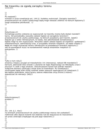 Straż Miejska Włocławek Na trawniku za zgodą zarządcy terenu 18.09.2010. Po niedzieli wchodzi w życie nowelizacja art. 144 § 1 kodeksu wykroczeń. Zarządcy terenów przeznaczonych do użytku publicznego będą mogli wskazać zieleńce na których będziemy mogli swobodnie piknikować. Dotychczas z formalnego punktu widzenia za wypoczynek na trawniku można było dostać mandat karny. Od poniedziałku wszystko zależeć będzie od zarządców terenów przeznaczonych do użytku publicznego, na których posadzony jest trawnik. Jeżeli dopuści go o celów rekreacyjnych, to każdy, bez jakichkolwiek konsekwencji, będzie mógł na nim wypoczywać. Wszystko zatem zależeć będzie od wspólnot i spółdzielni mieszkaniowych, administracji oraz, w przypadku terenów miejskich, od władz miasta. Będą oni mogli wyznaczać tereny rekreacyjne na posiadanych terenach zielonych, zaś na pozostałych liczyć na konsekwentne reakcje strażników miejskich i policjantów. Tylko w tym roku strażnicy miejscy przyjęli od mieszkańców 141 interwencji, nałożyli 88 mandatów karnych, skierowali dwa wnioski o ukaranie do Sądu Rejonowego we Włocławku oraz pouczyli 71 osób z tego artykułu. Dotychczasowo karani byli jednak niemal wyłącznie kierowcy parkujący swoje auta na trawnikach. Po nowelizacji municypalni będą mieli mniej rozterek wobec pieszych wędrujących po zieleńcach. Nie będzie dylematów, które tereny zielone właściciele chcą chronić a które dopuszczać do rekreacji. (NS) ======= Dotychczasowy przepis: Art. 144. § 1. Kto na terenach przeznaczonych do użytku publicznego niszczy lub uszkadza roślinność albo depcze trawnik lub zieleniec lub też dopuszcza do niszczenia ich przez zwierzęta znajdujące się pod jego nadzorem, http://www.strazmiejska.um.wlocl.pl Kreator PDF Utworzono 2 March, 2017, 17:24 Straż Miejska Włocławek Znowelizowany przepis Art. 144. § 1. Kto na terenach przeznaczonych do użytku publicznego niszczy lub uszkadza roślinność albo depcze trawnik lub zieleniec lub lub też dopuszcza do niszczenia ich roślinności przez zwierzęta znajdujące się pod jego nadzorem albo na terenach przeznaczonych do użytku publicznego depcze trawnik lub zieleniec w miejscach innych niż wyznaczone dla celów rekreacji przez właściwego zarządcę terenu, http://www.strazmiejska.um.wlocl.pl Kreator PDF Utworzono 2 March, 2017, 17:24