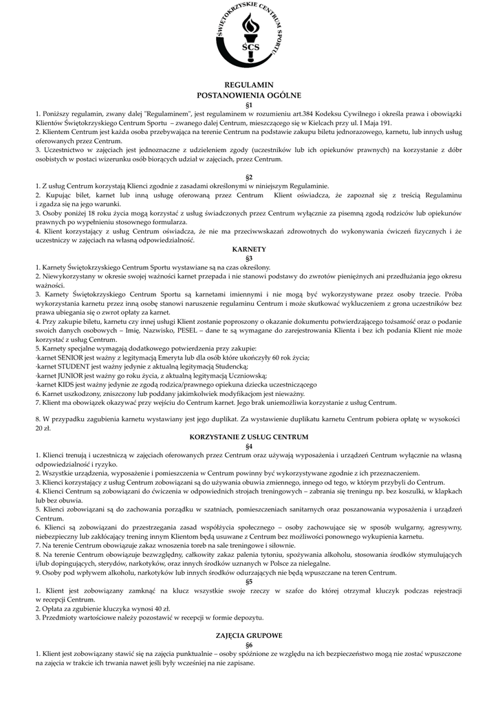 REGULAMIN POSTANOWIENIA OGÓLNE §1 1. Poniższy regulamin, zwany dalej "Regulaminem", jest regulaminem w rozumieniu art.384 Kodeksu Cywilnego i określa prawa i obowiązki Klientów Świętokrzyskiego Centrum Sportu – zwanego dalej Centrum, mieszczącego się w Kielcach przy ul. I Maja 191. 2. Klientem Centrum jest każda osoba przebywająca na terenie Centrum na podstawie zakupu biletu jednorazowego, karnetu, lub innych usług oferowanych przez Centrum. 3. Uczestnictwo w zajęciach jest jednoznaczne z udzieleniem zgody (uczestników lub ich opiekunów prawnych) na korzystanie z dóbr osobistych w postaci wizerunku osób biorących udział w zajęciach, przez Centrum. §2 1. Z usług Centrum korzystają Klienci zgodnie z zasadami określonymi w niniejszym Regulaminie. 2. Kupując bilet, karnet lub inną usługę oferowaną przez Centrum Klient oświadcza, że zapoznał się z treścią Regulaminu i zgadza się na jego warunki. 3. Osoby poniżej 18 roku życia mogą korzystać z usług świadczonych przez Centrum wyłącznie za pisemną zgodą rodziców lub opiekunów prawnych po wypełnieniu stosownego formularza. 4. Klient korzystający z usług Centrum oświadcza, że nie ma przeciwwskazań zdrowotnych do wykonywania ćwiczeń fizycznych i że uczestniczy w zajęciach na własną odpowiedzialność. KARNETY §3 1. Karnety Świętokrzyskiego Centrum Sportu wystawiane są na czas określony. 2. Niewykorzystany w okresie swojej ważności karnet przepada i nie stanowi podstawy do zwrotów pieniężnych ani przedłużania jego okresu ważności. 3. Karnety Świętokrzyskiego Centrum Sportu są karnetami imiennymi i nie mogą być wykorzystywane przez osoby trzecie. Próba wykorzystania karnetu przez inną osobę stanowi naruszenie regulaminu Centrum i może skutkować wykluczeniem z grona uczestników bez prawa ubiegania się o zwrot opłaty za karnet. 4. Przy zakupie biletu, karnetu czy innej usługi Klient zostanie poproszony o okazanie dokumentu potwierdzającego tożsamość oraz o podanie swoich danych osobowych – Imię, Nazwisko, PESEL – dane te są wymagane do zarejestrowania Klienta i bez ich podania Klient nie może korzystać z usług Centrum. 5. Karnety specjalne wymagają dodatkowego potwierdzenia przy zakupie: ·karnet SENIOR jest ważny z legitymacją Emeryta lub dla osób które ukończyły 60 rok życia; ·karnet STUDENT jest ważny jedynie z aktualną legitymacją Studencką; ·karnet JUNIOR jest ważny go roku życia, z aktualną legitymacją Uczniowską; ·karnet KIDS jest ważny jedynie ze zgodą rodzica/prawnego opiekuna dziecka uczestniczącego 6. Karnet uszkodzony, zniszczony lub poddany jakimkolwiek modyfikacjom jest nieważny. 7. Klient ma obowiązek okazywać przy wejściu do Centrum karnet. Jego brak uniemożliwia korzystanie z usług Centrum. 8. W przypadku zagubienia karnetu wystawiany jest jego duplikat. Za wystawienie duplikatu karnetu Centrum pobiera opłatę w wysokości 20 zł. KORZYSTANIE Z USŁUG CENTRUM §4 1. Klienci trenują i uczestniczą w zajęciach oferowanych przez Centrum oraz używają wyposażenia i urządzeń Centrum wyłącznie na własną odpowiedzialność i ryzyko. 2. Wszystkie urządzenia, wyposażenie i pomieszczenia w Centrum powinny być wykorzystywane zgodnie z ich przeznaczeniem. 3. Klienci korzystający z usług Centrum zobowiązani są do używania obuwia zmiennego, innego od tego, w którym przybyli do Centrum. 4. Klienci Centrum są zobowiązani do ćwiczenia w odpowiednich strojach treningowych – zabrania się treningu np. bez koszulki, w klapkach lub bez obuwia. 5. Klienci zobowiązani są do zachowania porządku w szatniach, pomieszczeniach sanitarnych oraz poszanowania wyposażenia i urządzeń Centrum. 6. Klienci są zobowiązani do przestrzegania zasad współżycia społecznego – osoby zachowujące się w sposób wulgarny, agresywny, niebezpieczny lub zakłócający trening innym Klientom będą usuwane z Centrum bez możliwości ponownego wykupienia karnetu. 7. Na terenie Centrum obowiązuje zakaz wnoszenia toreb na sale treningowe i siłownie. 8. Na terenie Centrum obowiązuje bezwzględny, całkowity zakaz palenia tytoniu, spożywania alkoholu, stosowania środków stymulujących i/lub dopingujących, sterydów, narkotyków, oraz innych środków uznanych w Polsce za nielegalne. 9. Osoby pod wpływem alkoholu, narkotyków lub innych środków odurzających nie będą wpuszczane na teren Centrum. §5 1. Klient jest zobowiązany zamknąć na klucz wszystkie swoje rzeczy w szafce do której otrzymał kluczyk podczas rejestracji w recepcji Centrum. 2. Opłata za zgubienie kluczyka wynosi 40 zł. 3. Przedmioty wartościowe należy pozostawić w recepcji w formie depozytu. ZAJĘCIA GRUPOWE §6 1. Klient jest zobowiązany stawić się na zajęcia punktualnie – osoby spóźnione ze względu na ich bezpieczeństwo mogą nie zostać wpuszczone na zajęcia w trakcie ich trwania nawet jeśli były wcześniej na nie zapisane. 2. Na zajęcia grupowe wpuszczana jest ściśle określona limitem ilość osób – o wejściu na zajęcia decyduje kolejność przyjścia. 3. Centrum zastrzega sobie prawo do wprowadzenia zapisów na zajęcia grupowe oraz wskazania terminu i sposobu dokonywania takich zapisów. 4. Klient uczestniczący w zajęciach jest zobowiązany przestrzegać wskazówek instruktora i stosować się do jego uwag. 5. Klient jest zobowiązany poinformować instruktora przed rozpoczęciem zajęć o wszystkich ewentualnych ograniczeniach zdrowotnych i/lub kontuzjach. 6. W szczególnych przypadkach Centrum ma prawo nie wyrazić zgody na udział klienta w zajęciach. Należą do nich między innymi: ·Brak odpowiedniego stroju lub obuwia ·Spóźnienie zagrażające powstaniu kontuzji ·Niedopasowanie poziomu zaawansowania uczestnika do rodzaju zajęć ·Zachowanie zagrażające zdrowiu lub zakłócające trening innym osobom 7. Podczas uczestnictwa w zajęciach obowiązuje zakaz żucia gumy, noszenia dużej, zagra