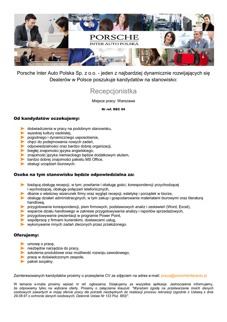 Porsche Inter Auto Polska Sp. z o.o. - jeden z najbardziej dynamicznie rozwijających się Dealerów w Polsce poszukuje kandydatów na stanowisko: Recepcjonistka Miejsce pracy: Warszawa Nr ref. REC 04 Od kandydatów oczekujemy: doświadczenia w pracy na podobnym stanowisku, wysokiej kultury osobistej, pogodnego i dynamicznego usposobienia, chęci do podejmowania nowych zadań, odpowiedzialności oraz bardzo dobrej organizacji, biegłej znajomości języka angielskiego, znajomość języka niemieckiego będzie dodatkowym atutem, bardzo dobrej znajomości pakietu MS Office, obsługi urządzeń biurowych. Osoba na tym stanowisku będzie odpowiedzialna za: bieżącą obsługę recepcji, w tym: powitanie i obsługę gości, korespondencji przychodzącej i wychodzącej, obsługę połączeń telefonicznych, dbanie o właściwy wizerunek firmy oraz wygląd recepcji, estetykę i porządek w biurze, obsługę działań administracyjnych, w tym zakup i gospodarowanie materiałami biurowymi oraz literaturą handlową, przygotowanie korespondencji, pism firmowych, podstawowych analiz i zestawień (Word, Excel), wsparcie działu handlowego w zakresie przygotowywania analizy i raportów sprzedażowych, przygotowywanie prezentacji w programie Power Point, współpracę z firmami kurierskimi, dostawcami usług, wykonywanie innych zadań zleconych przez przełożonego. Oferujemy: umowę o pracę, niezbędne narzędzia do pracy, szkolenia produktowe oraz możliwość rozwoju zawodowego, pracę w doświadczonym zespole, pakiet socjalny. Zainteresowanych kandydatów prosimy o przesyłanie CV ze zdjęciem na adres e-mail: [email protected] W temacie e-maila prosimy wpisać nr ref. ogłoszenia. Dziękujemy za wszystkie aplikacje. Jednocześnie informujemy, że odpowiemy tylko na wybrane oferty. Prosimy o załączenie klauzuli: "Wyrażam zgodę na przetwarzanie moich danych osobowych zawartych w mojej ofercie pracy dla potrzeb niezbędnych do realizacji procesu rekrutacji (zgodnie z Ustawą z dnia 29.08.97 o ochronie danych osobowych, Dziennik Ustaw Nr 133 Poz. 883)".