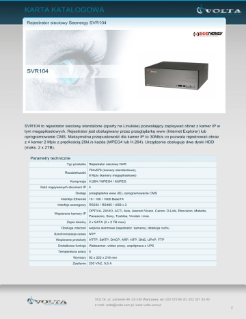 KARTA KATALOGOWA Rejestrator sieciowy Seenergy SVR104 SVR104 SVR104 to rejestrator sieciowy standalone (oparty na Linuksie) pozwalający zapisywać obraz z kamer IP w tym megapikselowych. Rejestrator jest obsługiwany przez przeglądarkę www (Internet Explorer) lub oprogramowanie CMS. Maksymalna przepustowość dla kamer IP to 30Mb/s co pozwala rejestrować obraz z 4 kamer 2 Mpix z prędkością 25kl./s każda (MPEG4 lub H.264). Urządzenie obsługuje dwa dyski HDD (maks. 2 x 2TB). Parametry techniczne Typ produktu Rejestrator sieciowy NVR Rozdzielczość 704x576 (kamery standardowe), 8 Mpix (kamery megapikselowe) Kompresja H.264 / MPEG4 / MJPEG Ilość nagrywanych strumieni IP 4 Dostęp przeglądarka www (IE), oprogramowanie CMS Interfejs Ethernet 10 / 100 / 1000 BaseTX Interfejs szeregowy RS232 / RS485 / USB x 2 Wspierane kamery IP OPTIVA, ZAVIO, ACTi, Axis, Arecont Vision, Canon, D-Link, Etrovision, Mobotix, Panasonic, Sony, Toshiba, Vivotek i inne. Zapis lokalny 2 x SATA (2 x 2 TB max) Obsługa zdarzeń wejścia alarmowe (rejestrator, kamera), detekcja ruchu Synchronizacja czasu NTP Wspierane protokoły HTTP, SMTP, DHCP, ARP, NTP, DNS, UPnP, FTP Dodatkowe funkcje Webserwer, wideo proxy, współpraca z UPS Temperatura pracy 5 Wymiary 82 x 222 x 216 mm Zasilanie 230 VAC, 0,5 A VOLTA, ul. Jutrzenki 94, 02-230 Warszawa, tel. 022 572 90 20, 022 331 33 00 e-mail: [email protected], www.volta.com.pl 1