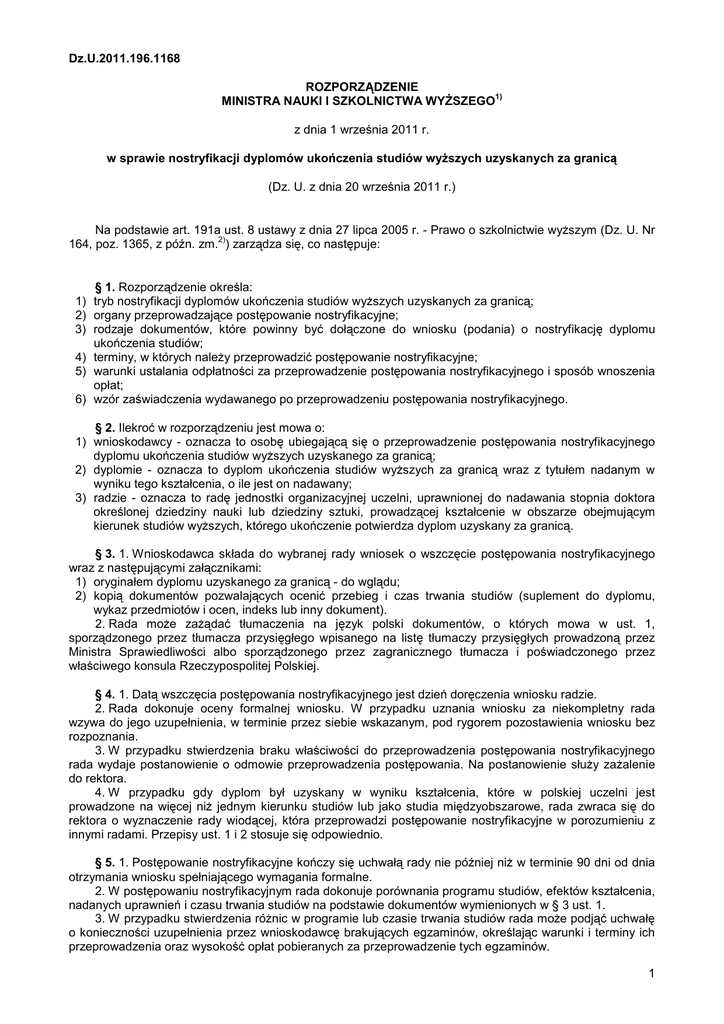 Dz.U.2011.196.1168 ROZPORZĄDZENIE 1) MINISTRA NAUKI I SZKOLNICTWA WYŻSZEGO z dnia 1 września 2011 r. w sprawie nostryfikacji dyplomów ukończenia studiów wyższych uzyskanych za granicą (Dz. U. z dnia 20 września 2011 r.) Na podstawie art. 191a ust. 8 ustawy z dnia 27 lipca 2005 r. - Prawo o szkolnictwie wyższym (Dz. U. Nr 2) 164, poz. 1365, z późn. zm. ) zarządza się, co następuje: § 1. Rozporządzenie określa: 1) tryb nostryfikacji dyplomów ukończenia studiów wyższych uzyskanych za granicą; 2) organy przeprowadzające postępowanie nostryfikacyjne; 3) rodzaje dokumentów, które powinny być dołączone do wniosku (podania) o nostryfikację dyplomu ukończenia studiów; 4) terminy, w których należy przeprowadzić postępowanie nostryfikacyjne; 5) warunki ustalania odpłatności za przeprowadzenie postępowania nostryfikacyjnego i sposób wnoszenia opłat; 6) wzór zaświadczenia wydawanego po przeprowadzeniu postępowania nostryfikacyjnego. § 2. Ilekroć w rozporządzeniu jest mowa o: 1) wnioskodawcy - oznacza to osobę ubiegającą się o przeprowadzenie postępowania nostryfikacyjnego dyplomu ukończenia studiów wyższych uzyskanego za granicą; 2) dyplomie - oznacza to dyplom ukończenia studiów wyższych za granicą wraz z tytułem nadanym w wyniku tego kształcenia, o ile jest on nadawany; 3) radzie - oznacza to radę jednostki organizacyjnej uczelni, uprawnionej do nadawania stopnia doktora określonej dziedziny nauki lub dziedziny sztuki, prowadzącej kształcenie w obszarze obejmującym kierunek studiów wyższych, którego ukończenie potwierdza dyplom uzyskany za granicą. § 3. 1. Wnioskodawca składa do wybranej rady wniosek o wszczęcie postępowania nostryfikacyjnego wraz z następującymi załącznikami: 1) oryginałem dyplomu uzyskanego za granicą - do wglądu; 2) kopią dokumentów pozwalających ocenić przebieg i czas trwania studiów (suplement do dyplomu, wykaz przedmiotów i ocen, indeks lub inny dokument). 2. Rada może zażądać tłumaczenia na język polski dokumentów, o których mowa w ust. 1, sporządzonego przez tłumacza przysięgłego wpisanego na listę tłumaczy przysięgłych prowadzoną przez Ministra Sprawiedliwości albo sporządzonego przez zagranicznego tłumacza i poświadczonego przez właściwego konsula Rzeczypospolitej Polskiej. § 4. 1. Datą wszczęcia postępowania nostryfikacyjnego jest dzień doręczenia wniosku radzie. 2. Rada dokonuje oceny formalnej wniosku. W przypadku uznania wniosku za niekompletny rada wzywa do jego uzupełnienia, w terminie przez siebie wskazanym, pod rygorem pozostawienia wniosku bez rozpoznania. 3. W przypadku stwierdzenia braku właściwości do przeprowadzenia postępowania nostryfikacyjnego rada wydaje postanowienie o odmowie przeprowadzenia postępowania. Na postanowienie służy zażalenie do rektora. 4. W przypadku gdy dyplom był uzyskany w wyniku kształcenia, które w polskiej uczelni jest prowadzone na więcej niż jednym kierunku studiów lub jako studia międzyobszarowe, rada zwraca się do rektora o wyznaczenie rady wiodącej, która przeprowadzi postępowanie nostryfikacyjne w porozumieniu z innymi radami. Przepisy ust. 1 i 2 stosuje się odpowiednio. § 5. 1. Postępowanie nostryfikacyjne kończy się uchwałą rady nie później niż w terminie 90 dni od dnia otrzymania wniosku spełniającego wymagania formalne. 2. W postępowaniu nostryfikacyjnym rada dokonuje porównania programu studiów, efektów kształcenia, nadanych uprawnień i czasu trwania studiów na podstawie dokumentów wymienionych w § 3 ust. 1. 3. W przypadku stwierdzenia różnic w programie lub czasie trwania studiów rada może podjąć uchwałę o konieczności uzupełnienia przez wnioskodawcę brakujących egzaminów, określając warunki i terminy ich przeprowadzenia oraz wysokość opłat pobieranych za przeprowadzenie tych egzaminów. 1 4. W przypadku, o którym mowa w ust. 3, postępowanie nostryfikacyjne zostaje zakończone w terminie 30 dni od dnia wpływu dokumentów potwierdzających wykonanie uchwały. § 6. 1. Postępowanie nostryfikacyjne kończy się uchwałą rady w sprawie: 1) uznania dyplomu za równoważny z odpowiednim polskim dyplomem ukończenia studiów wyższych i tytułem zawodowym albo 2) odmowy uznania dyplomu za równoważny z odpowiednim polskim dyplomem ukończenia studiów wyższych i tytułem zawodowym. 2. Rada odmawia uznania dyplomu za równoważny z odpowiednim polskim dyplomem ukończenia studiów wyższych w przypadku, gdy: 1) instytucja, która wydała dyplom, lub instytucja, w której prowadzone było kształcenie: a) nie były w dniu wydania dyplomu akredytowanymi uczelniami w rozumieniu prawa wewnętrznego państw, w których systemach szkolnictwa wyższego działają, lub realizowały program studiów nieposiadający akredytacji w dniu wydania dyplomu, lub b) nie działają w systemie szkolnictwa wyższego żadnego państwa; 2) instytucja, która wydała dyplom, realizowała na terenie innego kraju program studiów wyższych lub jego część niezgodnie z obowiązującymi w tym kraju przepisami; 3) wnioskodawca nie wykonał obowiązków wynikających z uchwały, o której mowa w § 5 ust. 3. 3. Od uchwał, o których mowa w ust. 1, wnioskodawcy przysługuje odwołanie do senatu uczelni. § 7. W przypadku podjęcia uchwały, o której mowa w § 6 ust. 1 pkt 1, jednostka organizacyjna uczelni, w której przeprowadzono postępowanie nostryfikacyjne, wydaje zaświadczenie, którego wzór stanowi załącznik do rozporządzenia. § 8. 1. Kierownik jednostki organizacyjnej, której rada przeprowadza postępowanie nostryfikacyjne, ustala wysokość opłaty za przeprowadzenie postępowania, biorąc pod uwagę koszty poniesione w związku z postępowaniem, przy czym opłata nie może być wyższa niż 50% minimalnej stawki wynagrodzenia zasadniczego profesora zwyczajnego, określonej w przepisach o warunkach wynagradzania za pracę i przyznawania innych świadczeń zwi