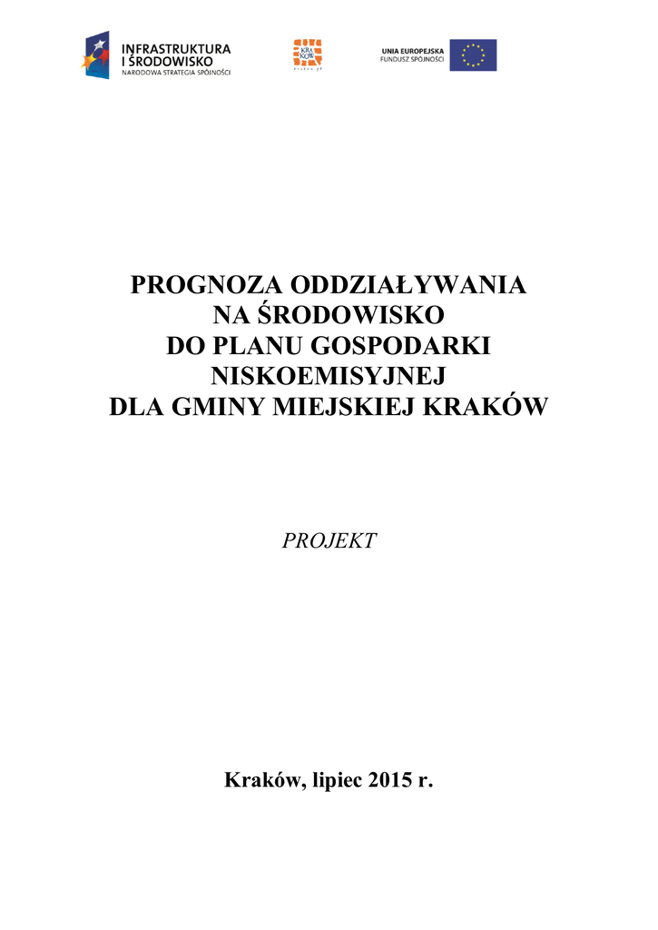 PROGNOZA ODDZIAŁYWANIA NA ŚRODOWISKO DO PLANU GOSPODARKI NISKOEMISYJNEJ DLA GMINY MIEJSKIEJ KRAKÓW PROJEKT Kraków, lipiec 2015 r. [strona niezadrukowana] 2 Zamawiający: Gmina Miejska Kraków Urząd Miasta Krakowa Wykonawca: Konsorcjum firm: Consus Carbon Engineering sp. z o.o. oraz Andrzej Łazęcki Projektowanie Systemów Grzewczych Kierownictwo projektu: mgr inż. Justyna Wysocka-Golec Zespół autorów: mgr inż. Gabriela Cieślik Andrzej Łazęcki Projektowanie Systemów Grzewczych mgr inż. Agnieszka Gielar-Fotin mgr inż. Andrzej Łazęcki mgr inż. Paulina Kępka inż. Szymon Ptak mgr Tomasz Pawelec inż. Edyta Kapała 3 [strona niezadrukowana] 4 ZAWARTOŚĆ OPRACOWANIA 1. WPROWADZENIE ..................................................................................................................................... 8 1.1 1.2 1.3 PODSTAWA PRAWNA ............................................................................................................................... 8 CEL I ZAKRES PROGNOZY ........................................................................................................................ 8 PRZEDMIOT PROGNOZY - CELE I ZAWARTOŚĆ PGN ................................................................................10 2. METODY ZASTOSOWANE PRZY SPORZĄDZANIU PROGNOZY ................................................14 3. POWIĄZANIA PLANU GOSPODARKI NISKOEMISYJNEJ Z INNYMI DOKUMENTAMI STRATEGICZNYMI..................................................................................................................................15 3.1 3.2 3.3 3.4 4. DOKUMENTY MIĘDZYNARODOWE ..........................................................................................................15 DOKUMENTY KRAJOWE I REGIONALNE...................................................................................................16 DOKUMENTY LOKALNE ..........................................................................................................................17 OCENA DOTYCHCZASOWEJ STRATEGII GMINY MIEJSKIEJ KRAKÓW W ZAKRESIE GOSPODARKI NISKOEMISYJNEJ ....................................................................................................................................23 OCENA STANU ŚRODOWISKA .............................................................................................................32 4.1 WARUNKI GEOLOGICZNE, RZEŹBA TERENU, GLEBY................................................................................32 4.2 ZŁOŻA KOPALIN .....................................................................................................................................33 4.3 WODY POWIERZCHNIOWE I PODZIEMNE .................................................................................................34 4.4 WARUNKI KLIMATYCZNE I BIOKLIMATYCZNE ........................................................................................35 4.5 SZATA ROŚLINNA ...................................................................................................................................36 4.6 FAUNA ...................................................................................................................................................37 4.7 OCHRONA PRZYRODY, ZABYTKÓW I KRAJOBRAZU .................................................................................37 4.7.1 Parki krajobrazowe .......................................................................................................................... 37 4.7.2 Rezerwaty przyrody ......................................................................................................................... 38 4.7.3 Obszary Natura 2000 ....................................................................................................................... 38 4.7.4 Użytki ekologiczne .......................................................................................................................... 39 4.7.5 Pomniki przyrody ............................................................................................................................ 40 4.8 OCHRONA ZABYTKÓW I KRAJOBRAZU ....................................................................................................40 4.9 POWIETRZE ............................................................................................................................................41 4.10 KLIMAT AKUSTYCZNY ...........................................................................................................................43 4.11 ODDZIAŁYWANIE PÓL ELEKTROMAGNETYCZNYCH ................................................................................44 4.12 ZAGROŻENIA AWARIAMI ........................................................................................................................44 5. ISTNIEJĄCE PROBLEMY OCHRONY ŚRODOWISKA ISTOTNE Z PUNKTU WIDZENIA REALIZACJI PROJEKTOWANEGO DOKUMENTU, W SZCZEGÓLNOŚCI DOTYCZĄCE OBSZARÓW PODLEGAJĄCYCH OCHRONIE ...................................................................................45 6. POTENCJALNE ZMIANY STANU ŚRODOWISKA W PRZYPADKU BRAKU REALIZACJI PGN ..............................................................................................................................................................46 7. PRZEWIDYWANE ZNACZĄCE ODDZIAŁYWANIE NA ELEMENTY ŚRODOWISKA WYNIKAJĄCE Z REALIZACJI PGN.....................................................................................................48 7.1 REALIZACJA CELU STRATEGICZNEGO 1 REDUKCJA EMISJI GAZÓW CIEPLARNIANYCH PRZY ZAPEWNIENIU ZRÓWNOWAŻONEGO ROZWOJU MIASTA ...........................................................................48 7.1.1 Realizacja celu szczegółowego 1.1 Podniesienie efektywności energetycznej ............................... 49 7.1.2 Realizacja celu szczegółowego 1.2 Zwiększenie wykorzystania energii wytwarzanej w wysokosprawnej kogeneracji oraz energii ze źróde