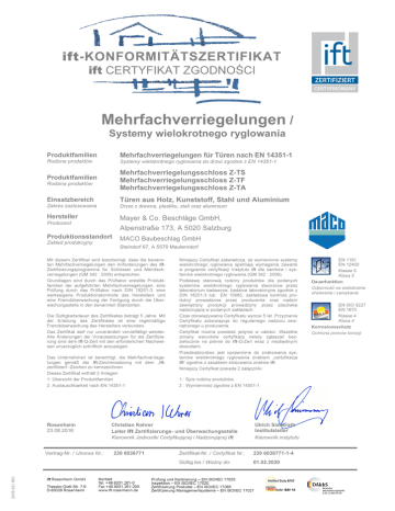 ift-KONFORMITÄTSZERTIFIKAT ift CERTYFIKAT ZGODNOŚCI Mehrfachverriegelungen / Systemy wielokrotnego ryglowania Produktfamilien Mehrfachverriegelungen für Türen nach EN 14351-1 Rodzina produktów Systemy wielokrotnego ryglowania do drzwi zgodnie z EN 14351-1 Produktfamilien Mehrfachverriegelungsschloss Z-TS Mehrfachverriegelungsschloss Z-TF Mehrfachverriegelungsschloss Z-TA Rodzina produktów Einsatzbereich Türen aus Holz, Kunststoff, Stahl und Aluminium Zakres zastosowania Drzwi z drewna, plastiku, stali oraz aluminium Hersteller Mayer & Co. Beschläge GmbH, Alpenstraße 173, A 5020 Salzburg Producent Produktionsstandort Zakład produkcyjny MACO Baubeschlag GmbH Steindorf 67, A 5570 Mauterndorf Mit diesem Zertifikat wird bescheinigt, dass die benannten Mehrfachverriegelungen den Anforderungen des iftZertifizierungsprogramms für Schlösser und Mehrfachverriegelungen (QM 342 : 2009) entsprechen. Grundlagen sind durch das Prüflabor erstellte Produktfamilien der aufgeführten Mehrfachverriegelungen, eine Prüfung durch das Prüflabor nach DIN 18251-3, eine werkseigene Produktionskontrolle des Herstellers und eine Fremdüberwachung der Fertigung durch die Überwachungsstelle in den benannten Standorten. Die Gültigkeitsdauer des Zertifikates beträgt 5 Jahre. Mit der Erteilung des Zertifikates ist eine regelmäßige Fremdüberwachung des Herstellers verbunden. Das Zertifikat darf nur unverändert vervielfältigt werden. Alle Änderungen der Voraussetzungen für die Zertifizierung sind dem ift-Q-Zert mit den erforderlichen Nachweisen unverzüglich schriftlich anzuzeigen. Das Unternehmen ist berechtigt, die Mehrfachverriegelungen gemäß der ift-Zeichensatzung mit dem „iftzertifiziert“-Zeichen zu kennzeichnen. Dieses Zertifikat enthält 2 Anlagen: 1: Übersicht der Produktfamilien 2: Austauschbarkeit nach EN 14351-1 Rosenheim 23.08.2016 2010-03 / 851 Vertrag-Nr. / Umowa Nr.: Niniejszy Certyfikat zaświadcza, że wymienione systemy wielokrotnego ryglowania spełniają wymagania zawarte w programie certyfikacji Instytutu ift dla zamków i systemów wielokrotnego ryglowania (QM 342 : 2009). Podstawę stanowią rodziny produktów dla podanych systemów wielokrotnego ryglowania stworzone przez laboratorium badawcze, badania laboratoryjne zgodnie z DIN 18251-3 lub EN 15685, zakładowa kontrola produkcji prowadzona przez producenta oraz nadzór zewnętrzny produkcji prowadzony przez placówkę nadzorującą w podanych zakładach. Czas obowiązywania Certyfikatu wynosi 5 lat. Przyznanie Certyfikatu zobowiązuje do regularnego nadzoru zewnętrznego u producenta. Certyfikat można powielać jedynie w całości. Wszelkie zmiany warunków certyfikacji należy zgłaszać bezzwłocznie na piśmie do ift-Q-Zert wraz z niezbędnymi dowodami. Przedsiębiorstwo jest uprawnione do znakowania systemów wielokrotnego ryglowania znakiem „certyfikacja ift“ zgodnie z zasadami stosowania znaków ift. Niniejszy Certyfikat posiada 2 załączniki: 1 : Spis rodziny produktów 2 : Wymienność zgodnie z EN 14351-1 Christian Kehrer Leiter ift Zertifizierungs- und Überwachungsstelle Kierownik Jednostki Certyfikującej i Nadzorującej ift 230 6036771 Ulrich Sieberath Institutsleiter Kierownik instytutu Zertifikat-Nr. / Certyfikat Nr.: 230 6036771-1-4 Gültig bis / Ważny do: 01.02.2020 EN 1191 EN 12400 Klasse 5 Klasa 5 Dauerfunktion Odporność na wielokrotne otwieranie i zamykanie EN ISO 9227 EN 1670 Klasse 4 Klasa 4 Korrosionsschutz Ochrona przeciw korozji Anlage/Załącznik 1 Blatt/Strona 1 von 1 Zertifikat-Nr./Certyfikat Nr.: 230 6036771-1-4 Hersteller/Producent: Mayer & Co. Beschläge GmbH Ausgabedatum/Data wydania: 23.08.2016 In der Zertifizierung und Überwachung enthaltenen Mehrfachverriegelungen. Systemy wielokrotnego ryglowania objęte certyfikacją i nadzorem. Dornmaße / Dornmas Nr. / Nr Typ / Familie / Typ / 1. Mehrfachverriegelungsschloss Z-TS Rodzina i.S. Zapfen alternativ in Kombination mit Bolzen- oder Hakenverriegelung oder HakenBolzenverriegelung 2. Mehrfachverriegelungsschloss Z-TF Multifunktionsfallen in Kombination mit i.S. Zapfen oder Bolzenkombination 3. Mehrfachverriegelungsschloss Z-TS Haken-BolzenVerriegelung 4. Mehrfachverriegelungsschloss Z-TS Hakenverriegelung 5. Mehrfachverriegelungsschloss Z-TS Bolzenverriegelung (odległość osi klamki od listwy czołowej) 35 mm, 40 mm, 45 mm, 50 mm, 55 mm, 65 mm, 70 mm, 80 mm 35 mm, 40 mm, 45 mm, 50 mm, 55 mm, 65 mm, 70 mm, 80 mm 35 mm, 40 mm, 45 mm, 50 mm, 55 mm, 65 mm, 70 mm, 80 mm 35 mm, 40 mm, 45 mm, 50 mm, 55 mm, 65 mm, 70 mm, 80 mm 35 mm, 40 mm, 45 mm, 50 mm, 55 mm, 65 mm, 70 mm, 80 mm Stulpausführung / Kategorie / Typ listew czołowych Kategoria Flachstulp 16/20/24 mm U-Stulp 6/24/6 mm Hutstulp 16/24 mm Mehrfachverriegelungsschloss Z-TA Multifunktionsfallen Hakenkombination Klasyfikacja zgodnie z DIN 18251-3 100.000 Klasse 3 / Klasa 3 Zyklen / max. 100 kg / 100 000 Nussvierkant 8 mm bis10 mm cykli / 100 kg maks. Flachstulp 16/20/24 mm 200.000 Klasse 3 / Klasa 3 Zyklen / max. 100 kg / 200 000 U-Stulp 6/24/6 mm Hutstulp 16/24 mm Nussvierkant 8 mm bis10 mm cykli / 100 kg maks. Flachstulp 16/20/24 mm 100.000 Klasse 3 / Klasa 3 Zyklen / max. 100 kg / 100 000 U-Stulp 6/24/6 mm Hutstulp 16/24 mm Nussvierkant 8 mm bis10 mm cykli / 100 kg maks. Flachstulp 16/20/24 mm 100.000 Klasse 3 / Klasa 3 Zyklen / max. 100 kg / 100 000 U-Stulp 6/24/6 mm Hutstulp 16/24 mm Nussvierkant 8 mm bis10 mm cykli / 100 kg maks. Flachstulp 16/20/24 mm 100.000 Klasse 3 / Klasa 3 Zyklen / max. 100 kg / 100 000 U-Stulp 6/24/6 mm Hutstulp 16/24 mm Nussvierkant 8 mm bis10 mm 6. Klassifizierung gemäß DIN 18251-3 / 35 mm, 40 mm, 45 mm, Flachstulp 16/20/24 mm 50 mm, 55 mm, 65 mm, U-Stulp 6/24/6 mm 70 mm, 80 mm, 100 mm Hutstulp 16/24 mm Nussvierkant 8 mm bis10 mm cykli / 100 kg maks. 100.000 Klasse 3/ Klasa 3 Zyklen / max. 100 kg / 100 000 cykli / 100 kg maks. Anlage/Załącznik 2 Blatt/Strona 1 von 1 Zertifikat-Nr./Certyfikat Nr.: 230 6036771-1-4 Hersteller/Producent: Mayer