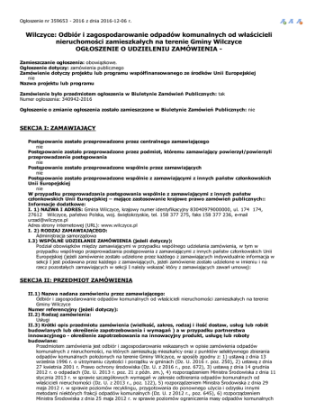 Ogłoszenie nr 359653 2016 z dnia 20161206 r. Wilczyce: Odbiór i zagospodarowanie odpadów komunalnych od właścicieli nieruchomości zamieszkałych na terenie Gminy Wilczyce OGŁOSZENIE O UDZIELENIU ZAMÓWIENIA Zamieszczanie ogłoszenia: obowiązkowe. Ogłoszenie dotyczy: zamówienia publicznego Zamówienie dotyczy projektu lub programu współfinansowanego ze środków Unii Europejskiej nie Nazwa projektu lub programu Zamówienie było przedmiotem ogłoszenia w Biuletynie Zamówień Publicznych: tak Numer ogłoszenia: 3409422016 Ogłoszenie o zmianie ogłoszenia zostało zamieszczone w Biuletynie Zamówień Publicznych: nie SEKCJA I: ZAMAWIAJĄCY Postępowanie zostało przeprowadzone przez centralnego zamawiającego nie Postępowanie zostało przeprowadzone przez podmiot, któremu zamawiający powierzył/powierzyli przeprowadzenie postępowania nie Postępowanie zostało przeprowadzone wspólnie przez zamawiających nie Postępowanie zostało przeprowadzone wspólnie z zamawiającymi z innych państw członkowskich Unii Europejskiej nie W przypadku przeprowadzania postępowania wspólnie z zamawiającymi z innych państw członkowskich Unii Europejskiej – mające zastosowanie krajowe prawo zamówień publicznych:: Informacje dodatkowe: I. 1) NAZWA I ADRES: Gmina Wilczyce, krajowy numer identyfikacyjny 83040979000000, ul. 174 174, 27612 Wilczyce, państwo Polska, woj. świętokrzyskie, tel. 158 377 275, faks 158 377 236, email [email protected] Adres strony internetowej (URL): www.wilczyce.pl I. 2) RODZAJ ZAMAWIAJĄCEGO: Administracja samorządowa I.3) WSPÓLNE UDZIELANIE ZAMÓWIENIA (jeżeli dotyczy): Podział obowiązków między zamawiającymi w przypadku wspólnego udzielania zamówienia, w tym w przypadku wspólnego przeprowadzania postępowania z zamawiającymi z innych państw członkowskich Unii Europejskiej (jeżeli zamówienie zostało udzielone przez każdego z zamawiających indywidualnie informacja w sekcji I jest podawana przez każdego z zamawiających, jeżeli zamówienie zostało udzielone w imieniu i na rzecz pozostałych zamawiających w sekcji I należy wskazać który z zamawiających zawarł umowę): SEKCJA II: PRZEDMIOT ZAMÓWIENIA II.1) Nazwa nadana zamówieniu przez zamawiającego: Odbiór i zagospodarowanie odpadów komunalnych od właścicieli nieruchomości zamieszkałych na terenie Gminy Wilczyce Numer referencyjny (jeżeli dotyczy): II.2) Rodzaj zamówienia: Usługi II.3) Krótki opis przedmiotu zamówienia (wielkość, zakres, rodzaj i ilość dostaw, usług lub robót budowlanych lub określenie zapotrzebowania i wymagań ) a w przypadku partnerstwa innowacyjnego określenie zapotrzebowania na innowacyjny produkt, usługę lub roboty budowlane: Przedmiotem zamówienia jest odbiór i zagospodarowanie wskazanych w opisie zamówienia odpadów komunalnych z nieruchomości, na których zamieszkują mieszkańcy oraz z punktów selektywnego zbierania odpadów komunalnych położonych na terenie Gminy Wilczyce, w sposób zgodny z: 1) ustawą z dnia 13 września 1996 r. o utrzymaniu czystości i porządku w gminach (Dz. U. 2016 r. poz. 250), 2) ustawą z dnia 27 kwietnia 2001 r. Prawo ochrony środowiska (Dz. U. z 2016 r., poz. 672), 3) ustawą z dnia 14 grudnia 2012 r. o odpadach (Dz. U. 2013 r. poz. 21 z późn. zm.), 4) rozporządzeniem Ministra Środowiska z dnia 11 stycznia 2013 r. w sprawie szczegółowych wymagań w zakresie odbierania odpadów komunalnych od właścicieli nieruchomości (Dz. U. z 2013 r., poz. 122), 5) rozporządzeniem Ministra Środowiska z dnia 29 maja 2012 r. w sprawie poziomów recyklingu, przygotowania do ponownego użycia i odzysku innymi metodami niektórych frakcji odpadów komunalnych (Dz. U. z 2012 r., poz. 645), 6) rozporządzeniem Ministra Środowiska z dnia 25 maja 2012 r. w sprawie poziomów ograniczenia masy odpadów komunalnych ulegających biodegradacji przekazywanych do składowania oraz sposobu obliczania poziomu ograniczenia masy tych odpadów (Dz. U. z 2012 r., poz. 676), 7) rozporządzeniem Ministra Środowiska z dnia 17 czerwca 2016 r. w sprawie wzorów sprawozdań o odebranych i zebranych odpadach komunalnych, odebranych nieczystościach ciekłych oraz realizacji zadań z zakresu gospodarki odpadami komunalnymi (Dz. U. z 2016 r., poz. 934), 8) Wojewódzkim Planem Gospodarki Odpadami, przyjętym uchwałą Sejmiku Województwa Świętokrzyskiego nr XXI/360/12 z dnia 28 czerwca 2012 roku w sprawie uchwalenia Planu gospodarki odpadami dla województwa świętokrzyskiego 20122018 z załącznikami, 9) uchwałą Sejmiku Województwa Świętokrzyskiego nr XXI/361/12 z dnia 28 czerwca 2012 roku w sprawie wykonania Planu gospodarki odpadami dla województwa świętokrzyskiego 20122018, 10) Regulaminem utrzymania czystości i porządku na terenie Gminy Wilczyce przyjętego uchwałą nr XVI/106/2016 Rady Gminy Wilczyce z dnia 28 czerwca 2016 r., zmienionego uchwałą nr XVII/112/2016 Rady Gminy Wilczyce z dnia 21 lipca 2016 r., 11) uchwałą Rady Gminy Wilczyce nr XVI/107/2016 z dnia 28 czerwca 2016 r. w sprawie szczegółowego sposobu i zakresu świadczenia usług w zakresie odbierania odpadów komunalnych od właścicieli nieruchomości i zagospodarowania tych odpadów, a także innymi przepisami prawa ustawowego i miejscowego. W przypadku utraty mocy lub zmiany w/w aktów prawnych (przepisów) Wykonawca w trakcie realizacji umowy ma obowiązek stosowania się do obowiązujących w danym czasie aktów prawnych, co oznacza, że Wykonawca zobowiązany będzie stosować w/w akty prawne z uwzględnieniem ewentualnych zmian stanu prawnego w tym zakresie a jego wynagrodzenie pozostanie bez zmian. 1. Charakterystyka Gminy Wilczyce: a) powierzchnia gminy wynosi 6994 ha. b) liczba mieszkańców na terenie gminy Wilczyce wynosi ok. 3859 osób (dane na podstawie zameldowania). c) szacuje się, że wszystkie osoby mieszkają w zabudowie jednorodzinnej. d) Gmina liczy 16 sołectw: Pielaszów, Dobrocice, Daromin, Przezwody, Bożęcin, 