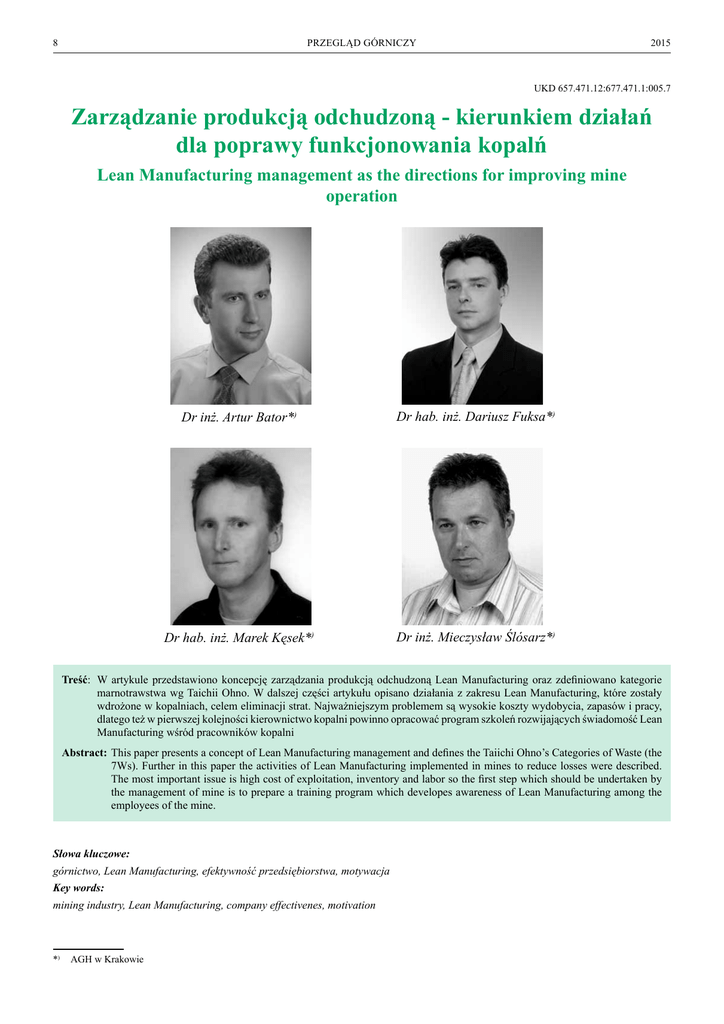 8 PRZEGLĄD GÓRNICZY 2015 UKD 657.471.12:677.471.1:005.7 Zarządzanie produkcją odchudzoną - kierunkiem działań dla poprawy funkcjonowania kopalń Lean Manufacturing management as the directions for improving mine operation Dr inż. Artur Bator*) Dr hab. inż. Dariusz Fuksa*) Dr hab. inż. Marek Kęsek*) Dr inż. Mieczysław Ślósarz*) Treść: W artykule przedstawiono koncepcję zarządzania produkcją odchudzoną Lean Manufacturing oraz zdefiniowano kategorie marnotrawstwa wg Taichii Ohno. W dalszej części artykułu opisano działania z zakresu Lean Manufacturing, które zostały wdrożone w kopalniach, celem eliminacji strat. Najważniejszym problemem są wysokie koszty wydobycia, zapasów i pracy, dlatego też w pierwszej kolejności kierownictwo kopalni powinno opracować program szkoleń rozwijających świadomość Lean Manufacturing wśród pracowników kopalni Abstract: This paper presents a concept of Lean Manufacturing management and defines the Taiichi Ohno’s Categories of Waste (the 7Ws). Further in this paper the activities of Lean Manufacturing implemented in mines to reduce losses were described. The most important issue is high cost of exploitation, inventory and labor so the first step which should be undertaken by the management of mine is to prepare a training program which developes awareness of Lean Manufacturing among the employees of the mine. Słowa kluczowe: górnictwo, Lean Manufacturing, efektywność przedsiębiorstwa, motywacja Key words: mining industry, Lean Manufacturing, company effectivenes, motivation *) AGH w Krakowie Nr 8 PRZEGLĄD GÓRNICZY 1. Wprowadzenie Zarządzanie produkcją odchudzoną (Lean Manufacturing) jest w dzisiejszych czasach najchętniej stosowaną koncepcją zarządzania w firmach funkcjonujących w szybko zmieniających się warunkach, oraz przy dużej konkurencji. Podstawowymi problemami przedsiębiorstw są duże koszty oraz krótkie okresy przewidziane na realizację zamówień. Przedsiębiorstwa mogą stosować dwa rodzaje praktyk, a mianowicie dobre lub złe. Do dobrych praktyk możemy zaliczyć stosowanie różnych metod i narzędzi szczupłej produkcji, które pozwalają zidentyfikować źródła marnotrawstwa tam, gdzie nie jest ono widoczne na pierwszy rzut oka lub w miejscu, gdzie nikt go nie szukał. Złymi praktykami może być natomiast korzystanie z tańszych i jednocześnie gorszych materiałów dla obniżenia kosztów wytwarzania, lub też wykorzystywanie pracowników do realizacji większego zakresu prac, niemożliwego do wykonania w normalnym czasie i w normalnym tempie pracy. System szczupłego wytwarzania został rozpowszechniony w ostatnim dwudziestoleciu dzięki pracownikom naukowym z USA, fundamentalne zasady jego działania stosowane były w japońskim przemyśle już od około 50 lat [1]. Obecnie jest to najskuteczniejszy sposób podnoszenia produktywności przedsiębiorstwa, zmniejszania marnotrawstwa i optymalizowania procesu produkcyjnego. 2. Lean Manufacturing. Lean Manufacturing (szczupłe wytwarzanie) to filozofia zarządzania prowadząca do eliminowania marnotrawstwa oraz do poprawy konkurencyjności wyrobów i procesów. System ten jest „szczupły”, ponieważ wykorzystuje połowę pracy ludzkiej, połowę miejsca w hali lub magazynie, mniejszą ilość narzędzi, zapasów oraz czasu pozwalając na produkowanie bez defektów dużej gamy różnorodnych produktów. Eliminacji podlegają czynności zbędne uznawane jako niepotrzebne, na czynności niezbędne kładziony jest wyjątkowy nacisk, tak aby były wykonywane w odpowiedniej kolejności i bezbłędnie [2]. Główna idea Lean polega na użyciu takich sposobów funkcjonowania przedsiębiorstwa, aby w określonych warunkach techniczno-organizacyjnych osiągnąć jak najlepsze efekty działania jak najmniejszymi nakładami. Uzyskuje się to poprzez wszechstronną eliminację wszelkiego rodzaju marnotrawstwa (muda), usuwane są nie tylko z systemu produkcyjnego, ale w obszarze całego przedsiębiorstwa.[9] Czynniki te możemy wyszczególnić w całym przedsiębiorstwie i wszystkich łańcuchach dostaw. Nie wpływają one na wzrost wartości wyrobu [6]. Wyeliminowanie mudy ze wszystkich procesów w organizacji pozwala wzmocnić jej konkurencyjność dzięki m.in. lepszemu wykorzystaniu dostępnych zasobów, podniesieniu wydajności pracy oraz obniżeniu kosztów wytworzenia produktów lub usług. Taiichi Ohno, jeden z szefów Toyoty, ustalił siedem kategorii mudy, jednak w różnych publikacjach można również znaleźć ósmą kategorię – straconą kreatywność pracowników[9]. Identyfikujemy następujące kategorie marnotrawstwa: – Nadprodukcja (ang. waste of overproduction) – produkowanie zbyt dużej ilości produktów lub wykonywanie ich zbyt wcześnie w stosunku co do terminu realizacji zamówienia. Prowadzi ona do konieczności magazynowania wyprodukowanych części, co jest niezgodne z systemem just in time. – Oczekiwanie (ang. waste of waiting) – zalegający bezczynnie materiał, oczekujący na przetworzenie lub też – – – – – – 9 nieefektywna praca pracowników poprzez oczekiwanie na materiały, narzędzia, instrukcje lub informacje. Również nierównomierne obciążanie pracą maszyn i urządzeń. Zbędny transport (ang. waste of transportation) – niepotrzebne przemieszczenie części, ludzi i informacji, jak również transportowanie wyrobów w odległe miejsca, co generuje dodatkowe koszty. Nieprawidłowe przetwarzanie (ang. waste of over-processing) – ignorancja wymogów i zaleceń klientów, powodująca dodatkowe sprawdzanie prac i przyrost kosztów. Również stosowanie złych procedur wytwórczych. Nadmierne magazynowanie (ang. waste of inventory) – zbyt wysoki poziom zapasów oraz utrzymywanie dużych powierzchni magazynowych. Również opóźnienia w przepływie materiałów i dokumentów. Obecność zapasów jest konsekwencją nadprodukcji. Zbędny ruch (ang. waste of motion) – nadmiern