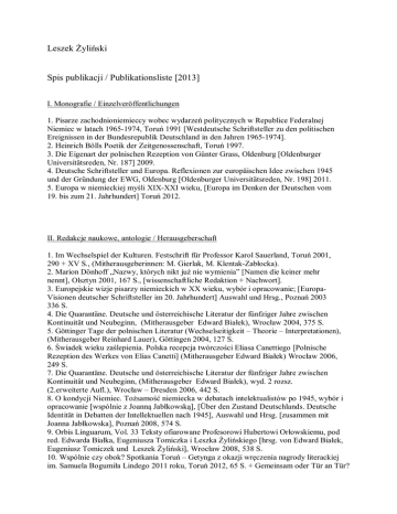 Leszek Żyliński Spis publikacji / Publikationsliste [2013] I. Monografie / Einzelveröffentlichungen 1. Pisarze zachodnioniemieccy wobec wydarzeń politycznych w Republice Federalnej Niemiec w latach 1965-1974, Toruń 1991 [Westdeutsche Schriftsteller zu den politischen Ereignissen in der Bundesrepublik Deutschland in den Jahren 1965-1974]. 2. Heinrich Bölls Poetik der Zeitgenossenschaft, Toruń 1997. 3. Die Eigenart der polnischen Rezeption von Günter Grass, Oldenburg [Oldenburger Universitätsreden, Nr. 187] 2009. 4. Deutsche Schriftsteller und Europa. Reflexionen zur europäischen Idee zwischen 1945 und der Gründung der EWG, Oldenburg [Oldenburger Universitätsreden, Nr. 198] 2011. 5. Europa w niemieckiej myśli XIX-XXI wieku, [Europa im Denken der Deutschen vom 19. bis zum 21. Jahrhundert] Toruń 2012. II. Redakcje naukowe, antologie / Herausgeberschaft 1. Im Wechselspiel der Kulturen. Festschrift für Professor Karol Sauerland, Toruń 2001, 290 + XV S., (Mitherausgeberinnen: M. Gierlak, M. Klentak-Zabłocka). 2. Marion Dönhoff „Nazwy, których nikt już nie wymienia” [Namen die keiner mehr nennt], Olsztyn 2001, 167 S., [wissenschaftliche Redaktion + Nachwort]. 3. Europejskie wizje pisarzy niemieckich w XX wieku, wybór i opracowanie; [EuropaVisionen deutscher Schriftsteller im 20. Jahrhundert] Auswahl und Hrsg., Poznań 2003 336 S. 4. Die Quarantäne. Deutsche und österreichische Literatur der fünfziger Jahre zwischen Kontinuität und Neubeginn, (Mitherausgeber Edward Białek), Wrocław 2004, 375 S. 5. Göttinger Tage der polnischen Literatur (Wechselseitigkeit – Theorie – Interpretationen), (Mitherausgeber Reinhard Lauer), Göttingen 2004, 127 S. 6. Świadek wieku zaślepienia. Polska recepcja twórczości Eliasa Canettiego [Polnische Rezeption des Werkes von Elias Canetti] (Mitherausgeber Edward Białek) Wrocław 2006, 249 S. 7. Die Quarantäne. Deutsche und österreichische Literatur der fünfziger Jahre zwischen Kontinuität und Neubeginn, (Mitherausgeber Edward Białek), wyd. 2 rozsz. (2.erweiterte Aufl.), Wrocław – Dresden 2006, 442 S. 8. O kondycji Niemiec. Tożsamość niemiecka w debatach intelektualistów po 1945, wybór i opracowanie [wspólnie z Joanną Jabłkowską], [Über den Zustand Deutschlands. Deutsche Identität in Debatten der Intellektuellen nach 1945], Auswahl und Hrsg. [zusammen mit Joanna Jabłkowska], Poznań 2008, 574 S. 9. Orbis Linguarum, Vol. 33 Teksty ofiarowane Profesorowi Hubertowi Orłowskiemu, pod red. Edwarda Białka, Eugeniusza Tomiczka i Leszka Żylińskiego [hrsg. von Edward Białek, Eugeniusz Tomiczek und Leszek Żyliński], Wrocław 2008, 538 S. 10. Wspólnie czy obok? Spotkania Toruń – Getynga z okazji wręczenia nagrody literackiej im. Samuela Bogumiła Lindego 2011 roku, Toruń 2012, 65 S. + Gemeinsam oder Tür an Tür? Begegnungen zwischen Toruń und Göttingen. Zur Verleihung des Samuel-Bogumil-LindePreises für Literatur des Jahres 2011, Toruń 2012, 71 S. 11. Akten des XII. Internationalen Germanistenkongresses Warschau 2010, Bd. 9, (Hg.) Friederike Eigler, Janusz Golec, Leszek Żyliński, Frankfurt a. M. 2012, 333 S. 12. Litteraria Copernicana Nr. 12/2013 (Nad)użycia literatury, [red. (Hg.)Tomasz Waszak / Leszek Żyliński] Toruń 2013, 189 S. III. Artykuły naukowe i eseje/ Abhandlungen und Essays 1. Sumienie słów. O poetyce Eliasa Canettiego, Akcent 4/1985, S.54-58. 1a. [przedruk / wiederabgedruckt] Świadek wieku zaślepienia. Polska recepcja twórczości Eliasa Canettiego. (red./Hg.) Edward Białek / Leszek Żyliński, Wrocław 2006, S.133-139. 2. Grass i Niemcy, Więź 4/1986, S.73-78. 3. Klasyk na rozdrożu, Polityka 26/1987, S.9. 4. Das Revolutionskonzept von Hans Magnus Enzensberger, Germanica Wratislaviensia LXI, Wrocław 1988, S.89-95. 5. Niemieckie spory o Mitteleuropę, Res Publica 6/1989, S.16-22. 6. Für und wider eine engagierte Literatur. Literaturpolitischer Streit in dem Jahrzehnt nach 1965, Zagadnienia Rodzajów Literackich, tom XXXII, z. 63, Wrocław 1989, S.71-82. 7. Günter Grass' nationale Sendung, Der Mensch wird an seiner Dummheit sterben: Günter-Grass-Konferenz Karpacz 17-23 maja 1987, (red./Hg.) Norbert Honsza, Jerzy Łukosz, Marian Szyrocki, Wrocław 1990, S.133-140. 8. Martin Walsers Kafka-Rezeption, Skamandros - Dialog I, Germanistisches Jahrbuch DDR-Polen 1990, Warszawa 1990, S.148-152. 9. Niemcy, Polska, Europa, Więź 9/1990, S.87-89. 10. Handeln und schreiben. Literaturpolitische Konzepte westdeutscher Autoren in der zweiten Hälfte der sechziger Jahre, Acta Universitatis Nicolai Copernici - Filologia Germańska XIII, Toruń 1991, S.67-75. 11. Czasopisma literackie i kulturalno-polityczne w Niemczech po 1945 roku, Twórczość 1/1991, S.122-128. 12. Die ethische Dimension eines Revolutionärs. Zu Ernst Tollers 'Masse Mensch', Acta Universitatis Nicolai Copernici - Filologia Germańska XIV, 1991, S.51-57. 13. Mythos des Dichters. Zu einem Aspekt des poetischen Konzepts von Elias Canetti, Das Mythische und Utopische in der deutschsprachigen Literatur der Gegenwart, (red./Hg.) H. Ludorowska, Lublin 1992, S.41-49. 14. Gemütlichkeit, Deutsche und Polen. 100 Schlüsselbegriffe, hrsg. von Ewa Kobylińska, Andreas Lawaty, Rüdiger Stephan, München und Zürich 1992, S.275-279. 14a. [przedruk / vorab gedruckt] Gemütlichkeit in der zweiten Potenz, Streitkultur. Magazin für Politik und Kultur in Europa, Bonn, Heft 3/1991, S.11-12. 14b. [przedruk / wiederabgedruckt] Denkanstöße '94. Ein Lesebuch aus Philosophie, Natur- und Humanwissenschaften, hrsg. von H. Bohnet von der Thüsen, München Zürich 1993, S.148-151. 15. Die unpolitischen 50er Jahre? Zu einem Kapitel der westdeutschen Literaturgeschichte, Acta Universitatis Nicolai Copernici - Filologia Germańska XVI, 1992, S.93-100. 16. Republika Federalna: między “Sonderweg” a “normalnością”, Res Publica 1-2/1992, S.40- 45. 17. Kulturpolitische Zeitschriften in Nachkriegsdeutschland 1945-1947, Acta Universitatis Nicolai Co